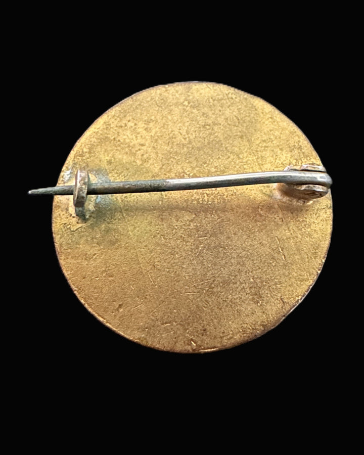 Reverse is plain gilt brass with a simple tube hinge and soldered catch (horizontal pin), typical jeweler’s construction for WWI donation/patriotic badges. No maker’s mark is present.