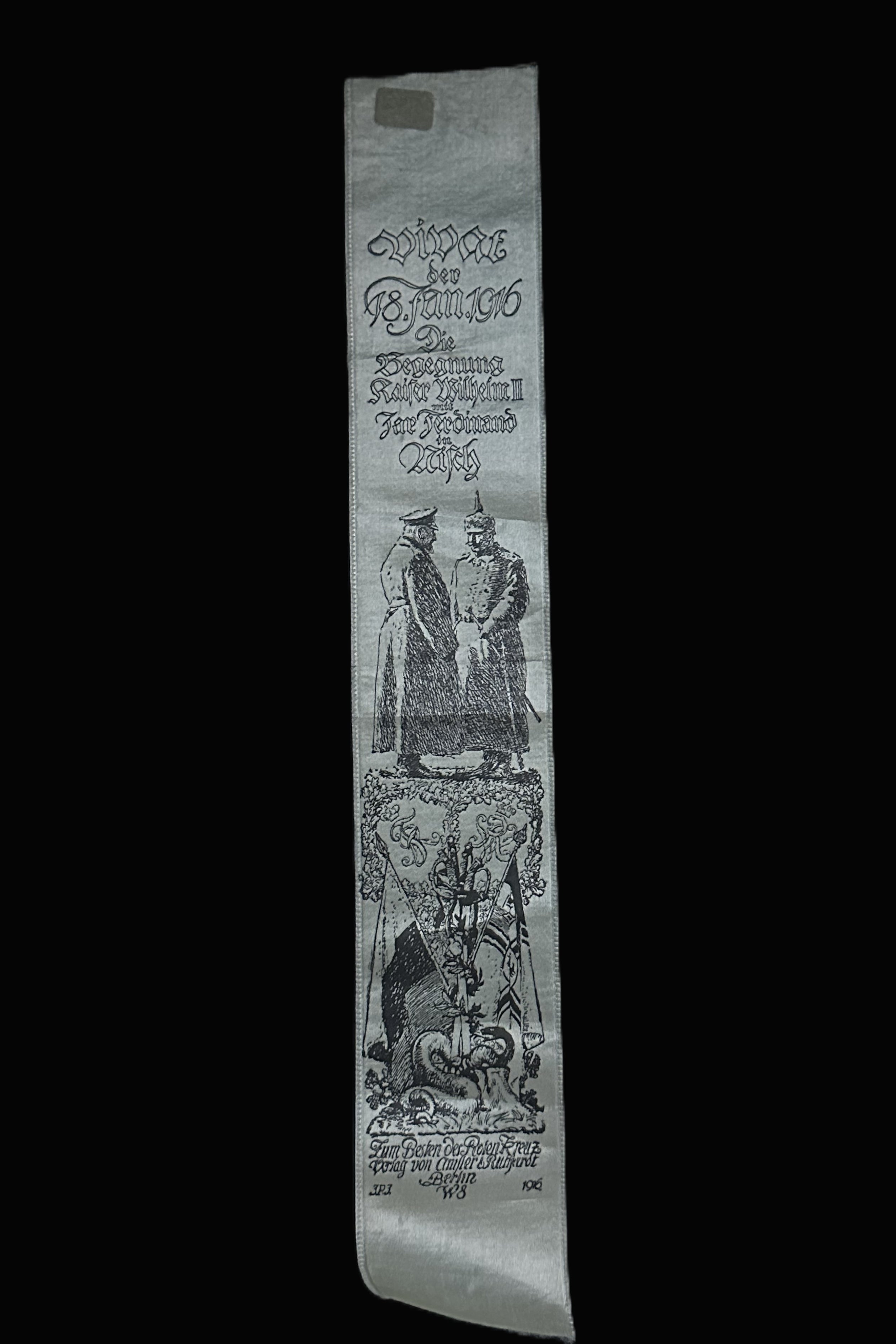 1916 German “VIVAT” Silk Fund-Raising Ribbon — Meeting of Kaiser Wilhelm II & Tsar Ferdinand at Niš (Nisch) — Amsler & Ruthardt, Berlin (for the Red Cross)