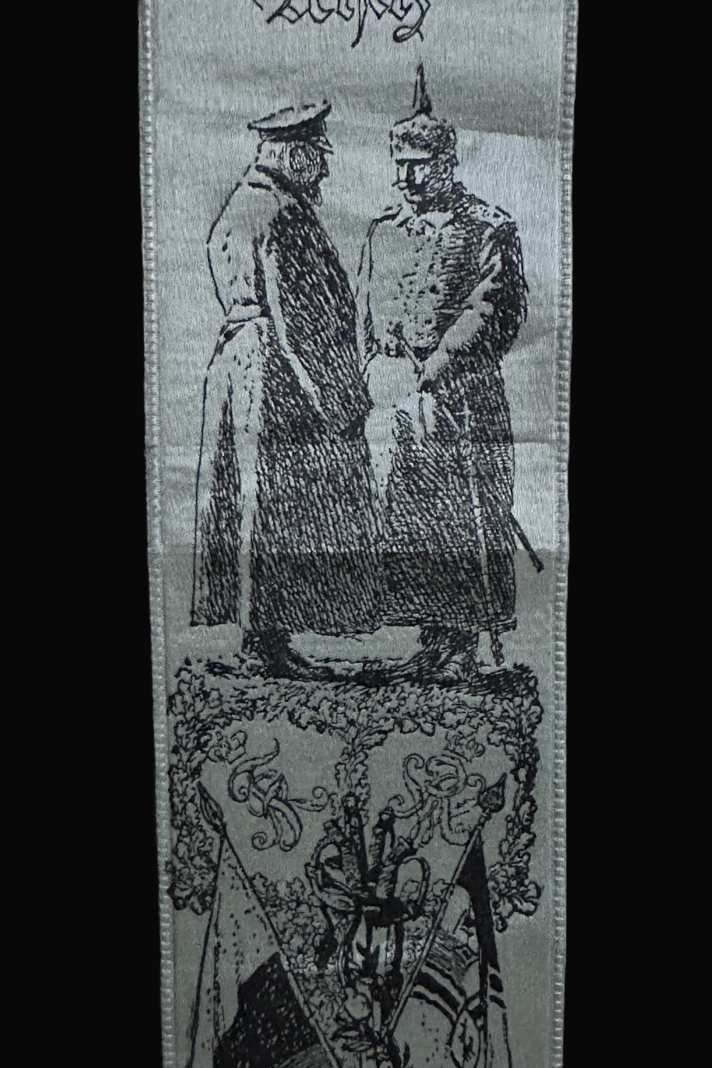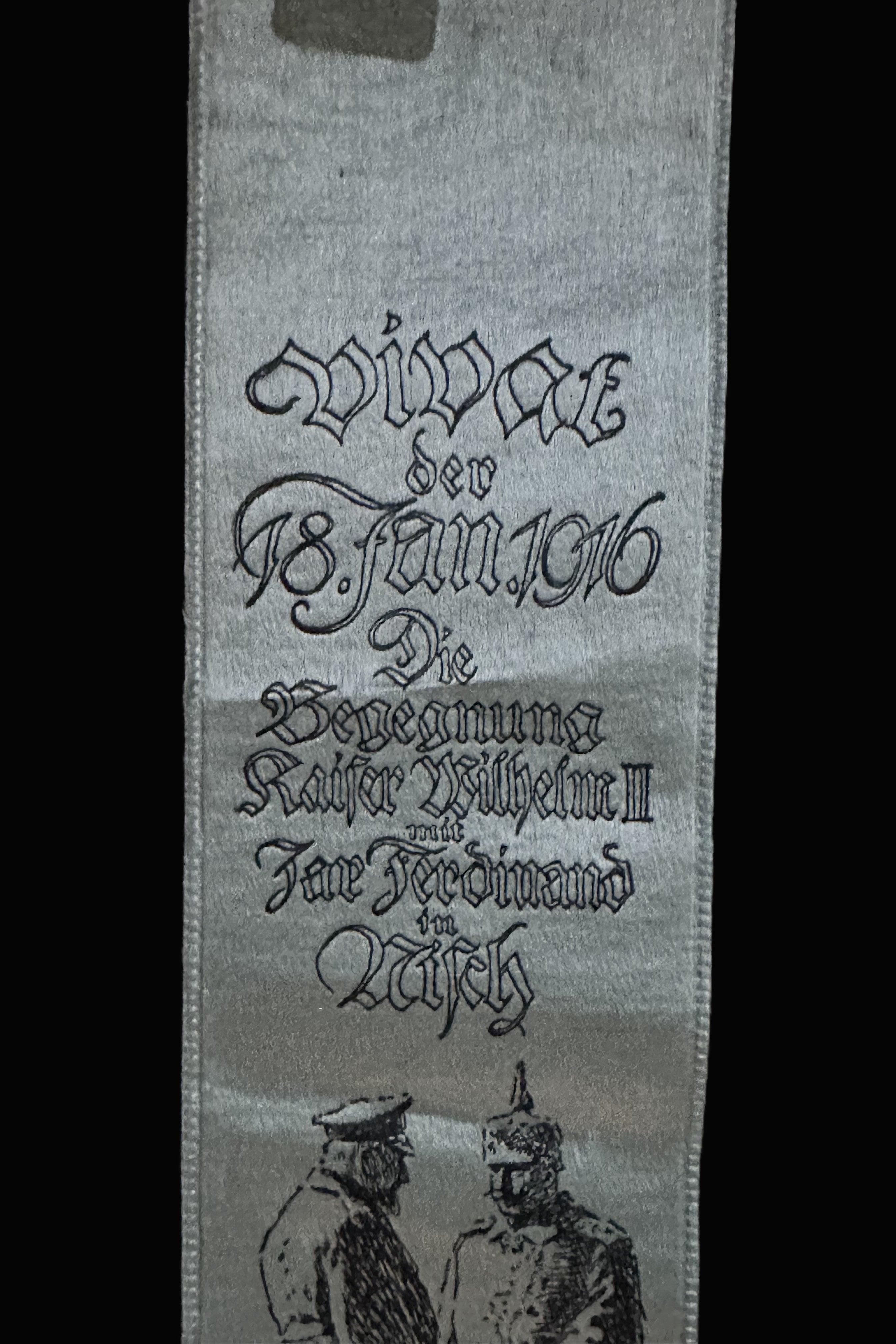 A classic German Vivatband commemorating a headline event of the Central Powers in WWI: the meeting of German Emperor Wilhelm II and Bulgarian Tsar Ferdinand I in Niš (German: Nisch) on 18 January 1916. The ribbon is woven on a silvery-grey silk ground with black imagery and Gothic text.