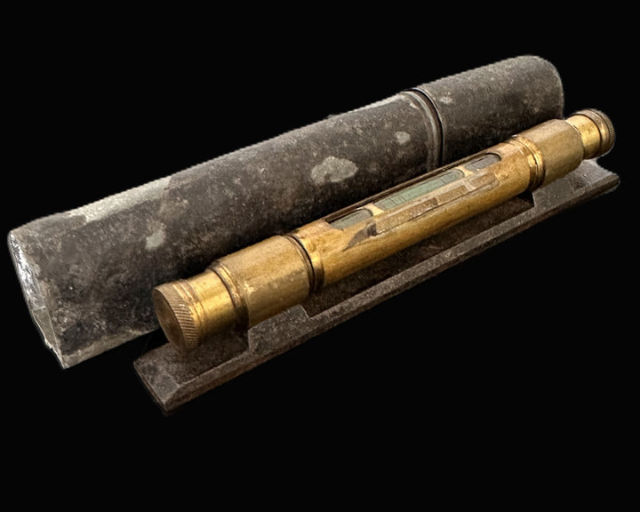 This antique brass and iron spirit level is a finely crafted precision instrument housed in a protective iron storage case. Likely dating to the late 19th or early 20th century, this type of level was an essential tool for engineers, surveyors, and construction professionals before the advent of modern electronic measuring devices.