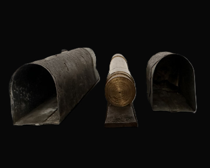 - Iron protective case, complete with a hinged interior and semi-circular housing for storage