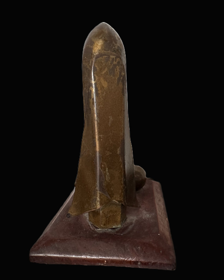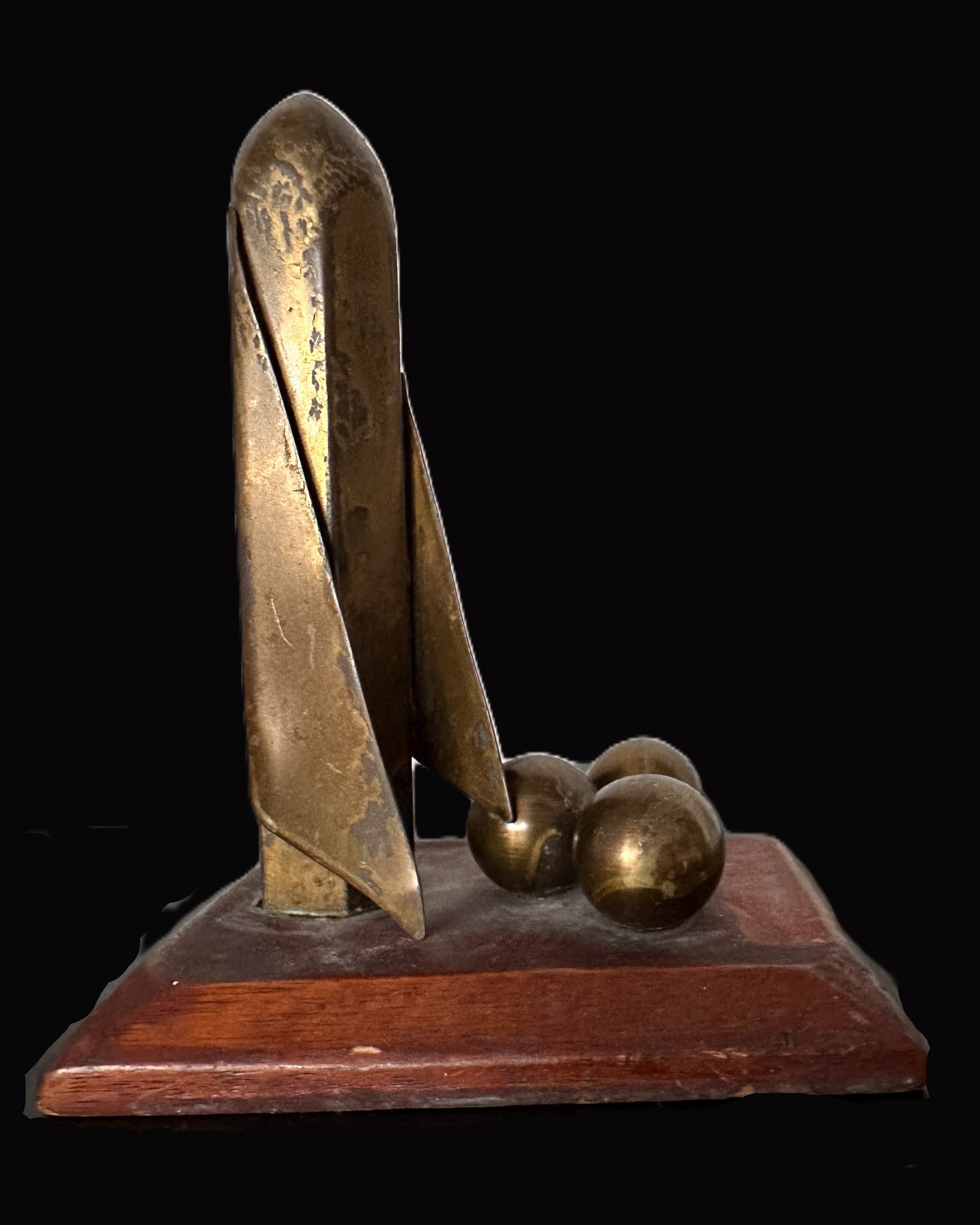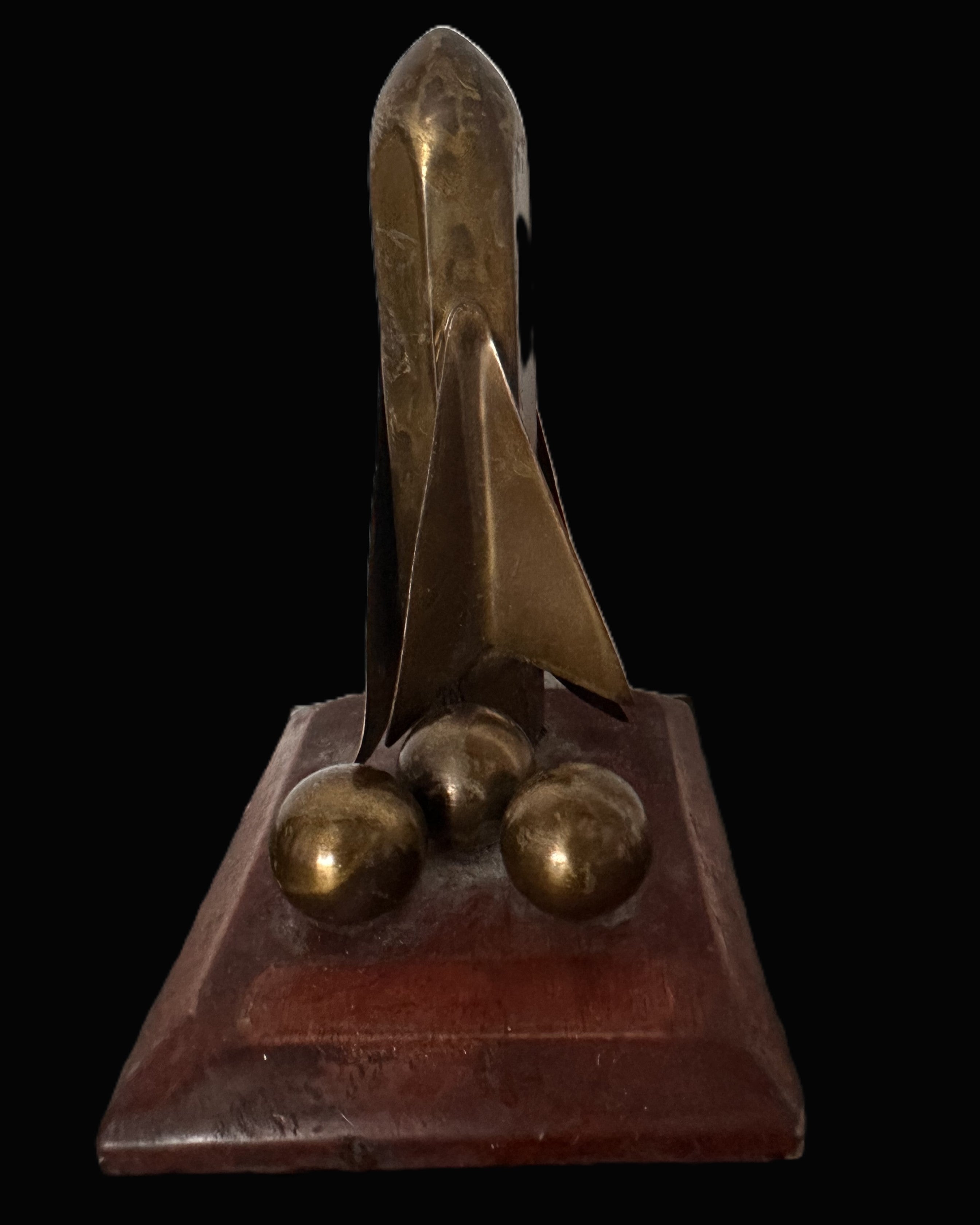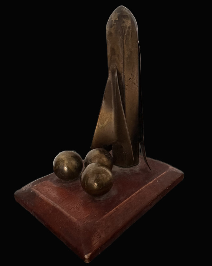 This fascinating artifact is a brass sculpture mounted on a polished wooden base, evocative of the artillery and munitions of the past. The central feature of this piece is a stylized representation of a large artillery shell, flanked by three spherical elements reminiscent of cannonballs. The shell's unique triangular brass flanges extend outward, adding an industrial and military aesthetic.