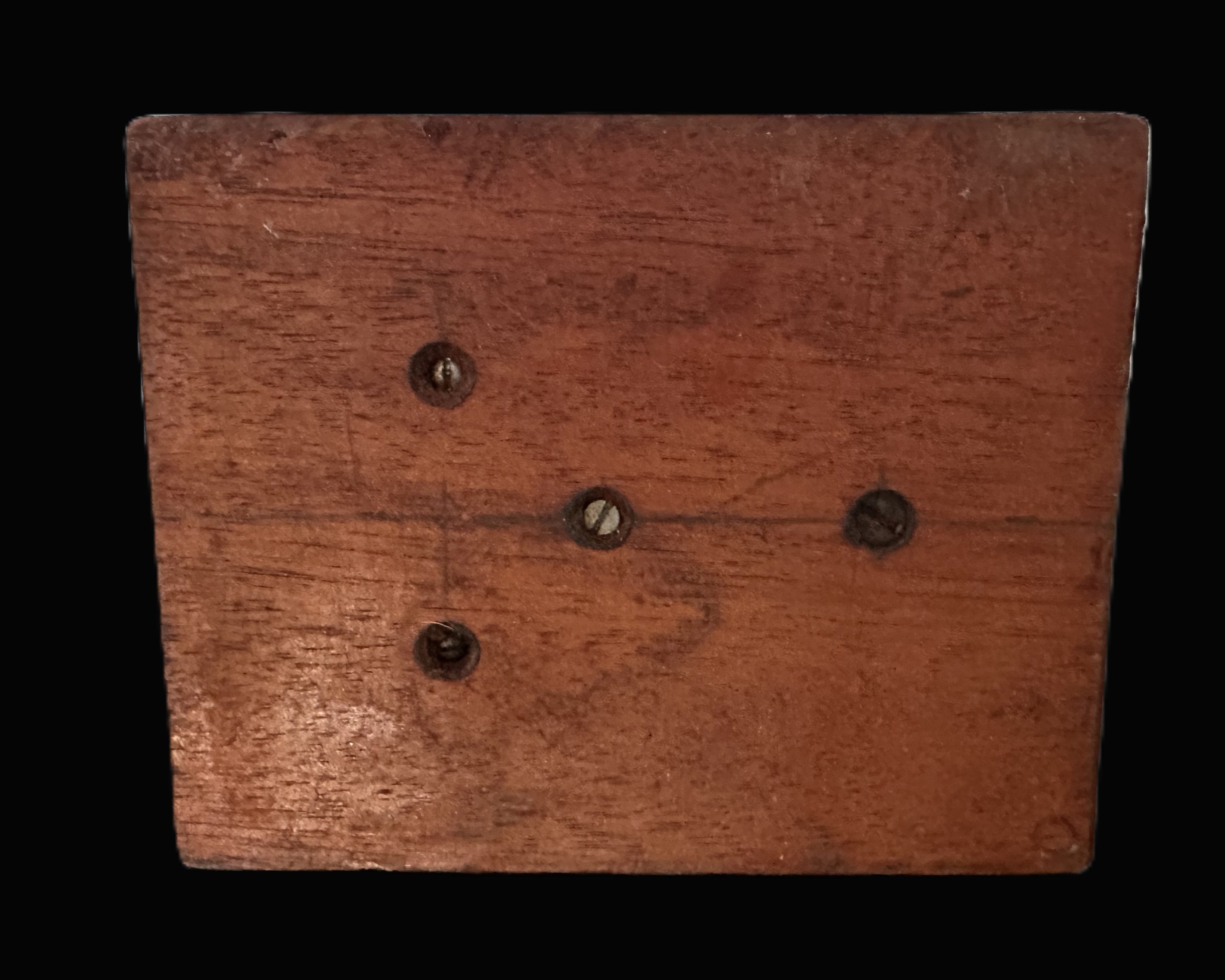 The base, crafted from solid wood, is smooth and polished, showing age-appropriate patina. The underside is secured with vintage screws, demonstrating a functional yet rustic construction.
