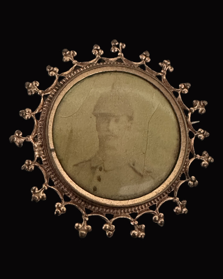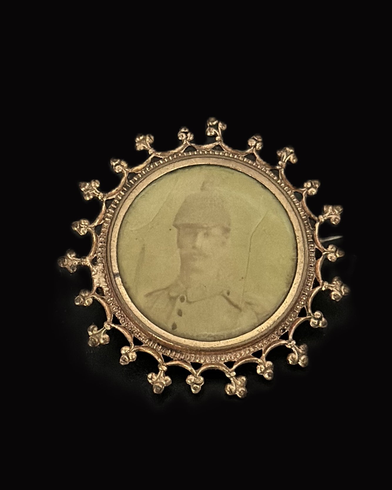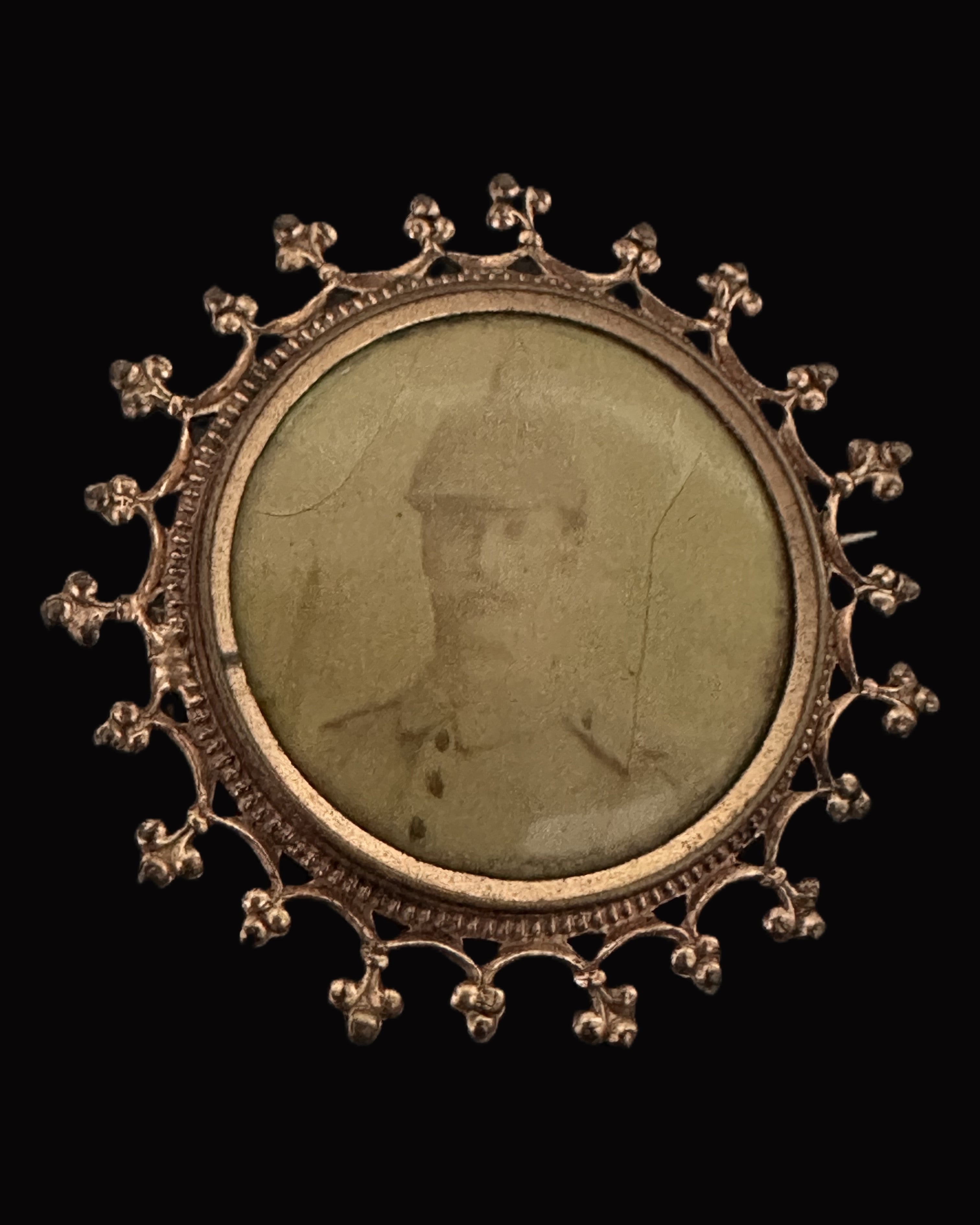 This brooch makes a captivating addition to any collection of WWI memorabilia, particularly when displayed alongside related items such as medals, photographs, or letters. Its ornate frame and historical photograph also make it suitable for standalone display in a shadowbox or glass cabinet.