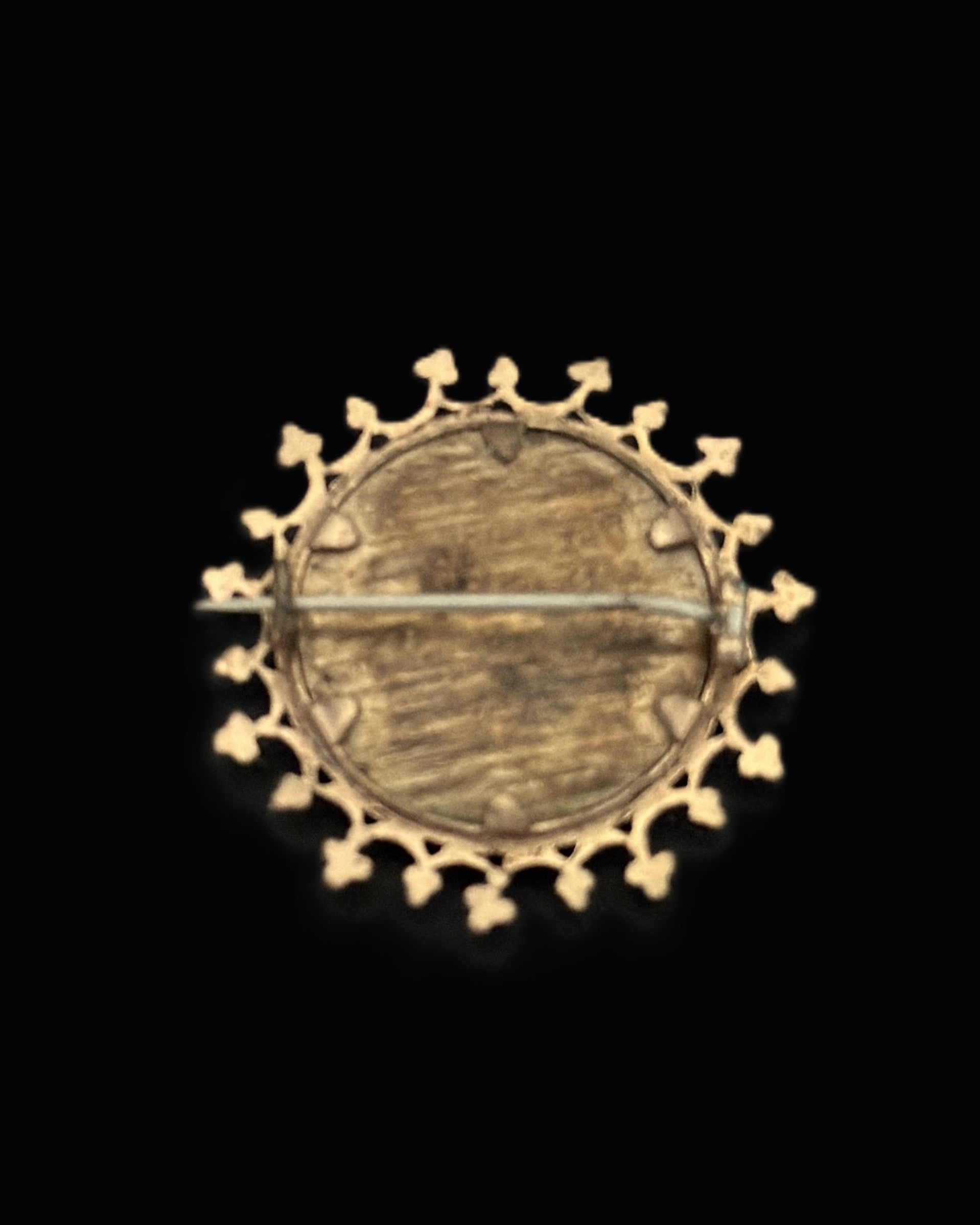 The brooch remains in good antique condition, with some wear commensurate with its age. The photograph exhibits minor discoloration and surface cracks, adding to its authenticity and charm. The reverse side features a well-preserved pin mechanism, ensuring functionality for wear or display.