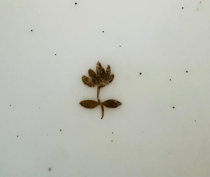The saucer features a delicate hand-painted floral sprig in muted gilt tones, centrally positioned within a smooth, slightly concave surface. Its minimalistic yet elegant design reflects the decorative preferences of the Belle Époque period, a time of cultural flourishing in France. The fine porcelain is further adorned with a subtle sheen, a hallmark of Parisian porcelain craftsmanship from this era.