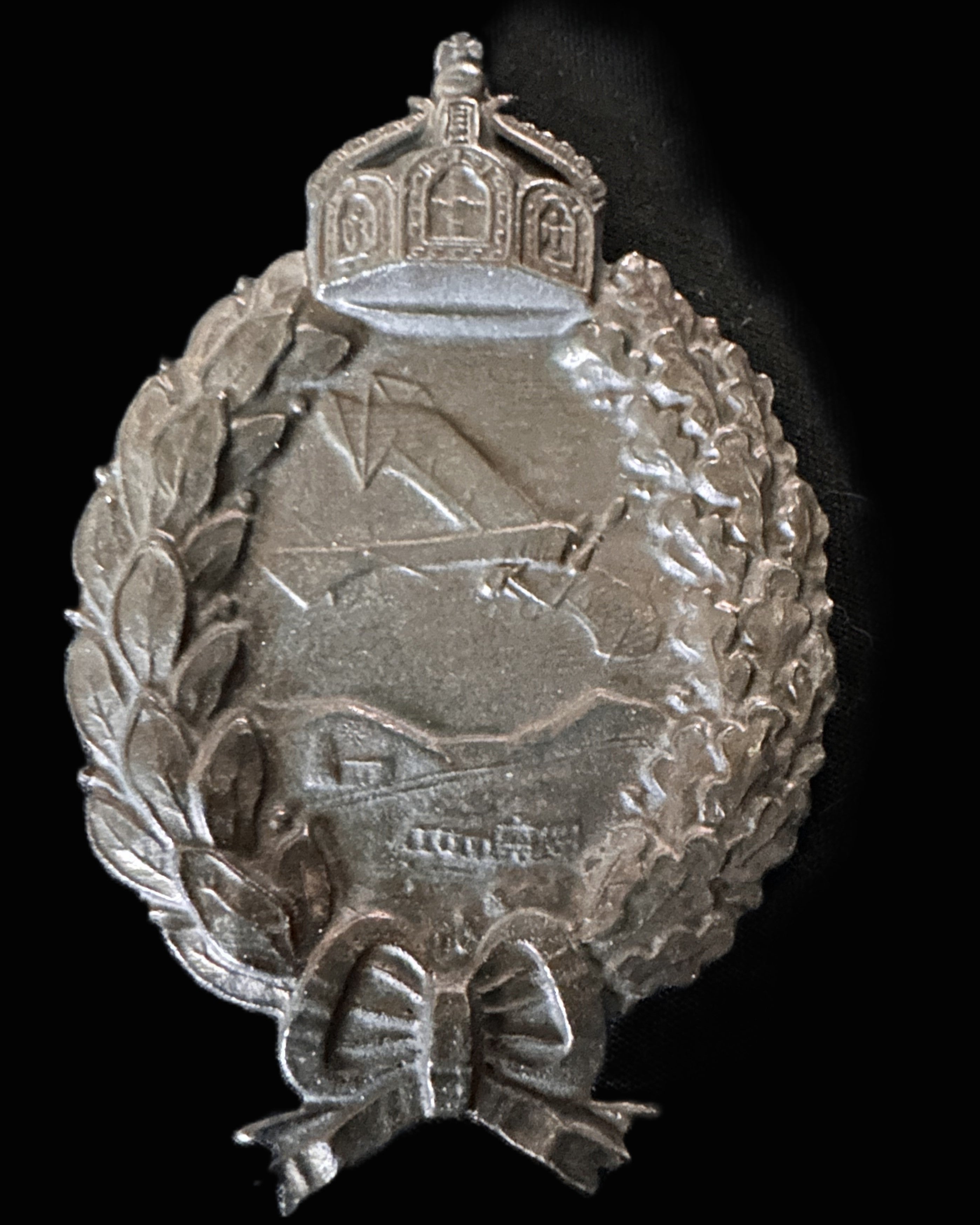This silver-toned aviation badge is a fine example of the Austro-Hungarian Empire’s early military aeronautical awards, featuring an imperial crown above a delicately detailed scene of a biplane in flight over mountainous terrain, framed by a laurel and oak wreath tied with a bow. The reverse bears dual hallmark impressions, typical of Vienna silverwork from the Great War period, confirming its authenticity and quality of manufacture.