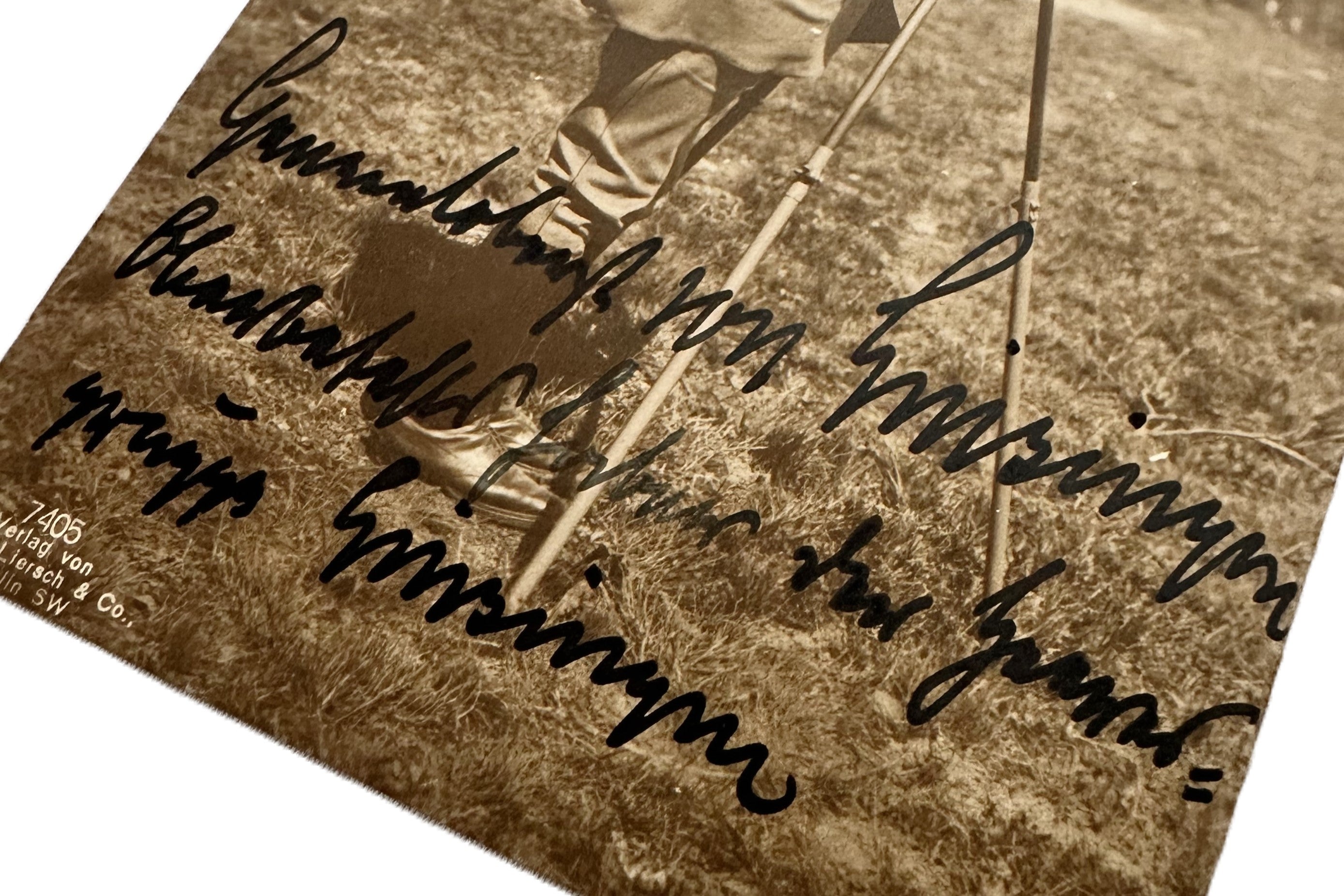 This autographed postcard, Nr 7405 from Gustav Liersch, captures von Linsingen in a contemplative pose, slightly from the rear in profile, as he peers through a field telescope mounted on a tripod. This type of telescope was commonly used in the trenches to observe enemy movements across no man's land. The top of the postcard bears his name and his command of the South Armee in Russia, while a bold and large black signature with an inscription adorns the bottom. The postcard, preserved in mint condition and never mailed, offers a unique and personal connection to a key figure of WWI.