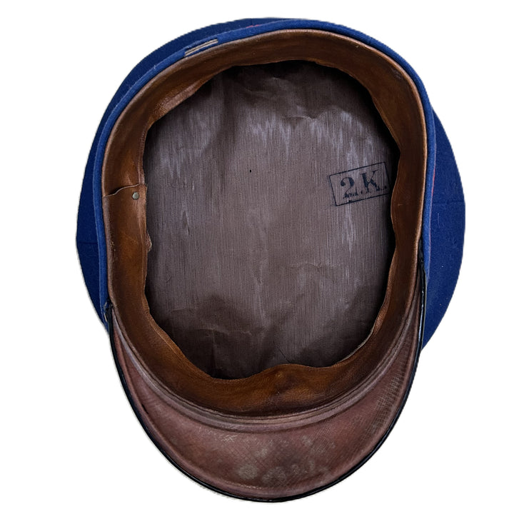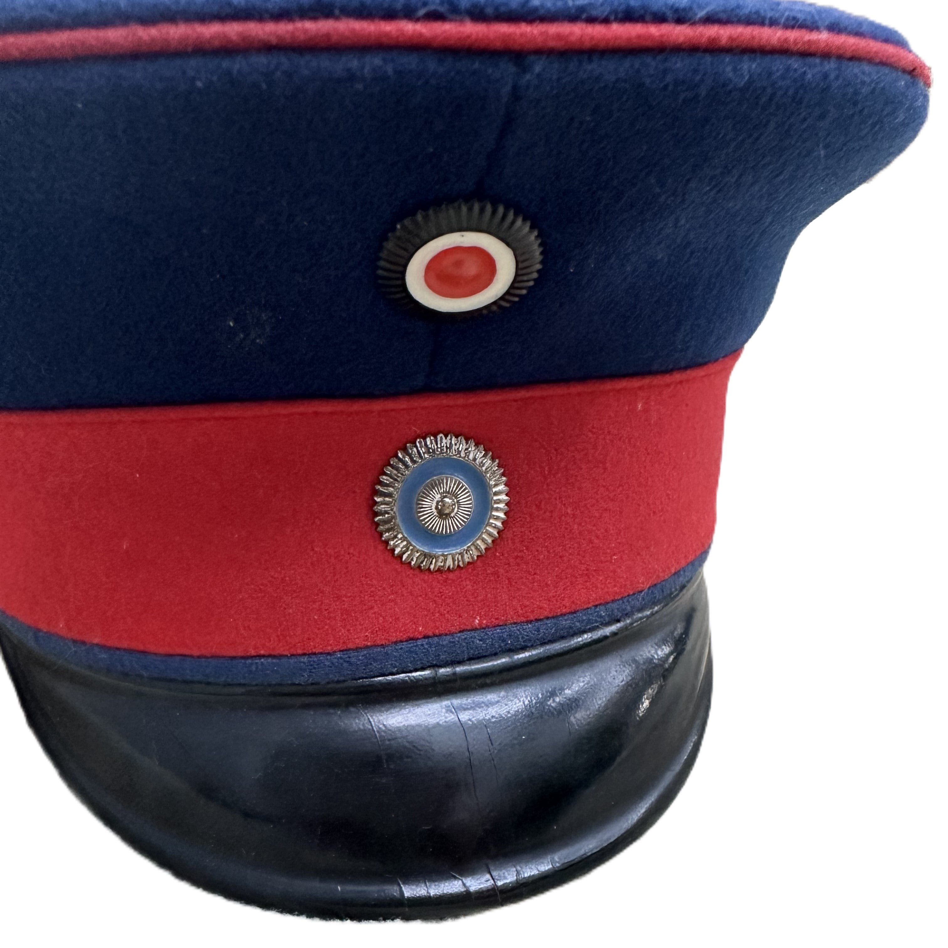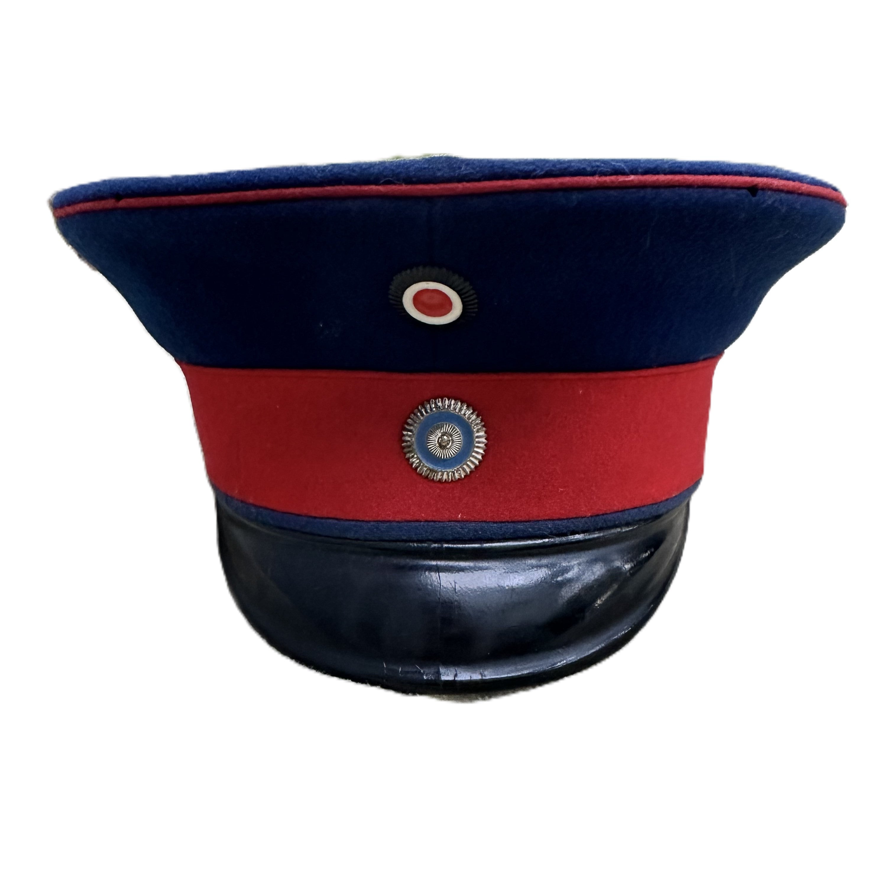 - Color and Material: The schirmütze is primarily made of fine dark blue wool, a hallmark of pre-World War I Bavarian military headgear. The wide band encircling the cap is a striking vibrant red, complemented by two smaller red trim bands at the top of the wide band and the crown of the cap.