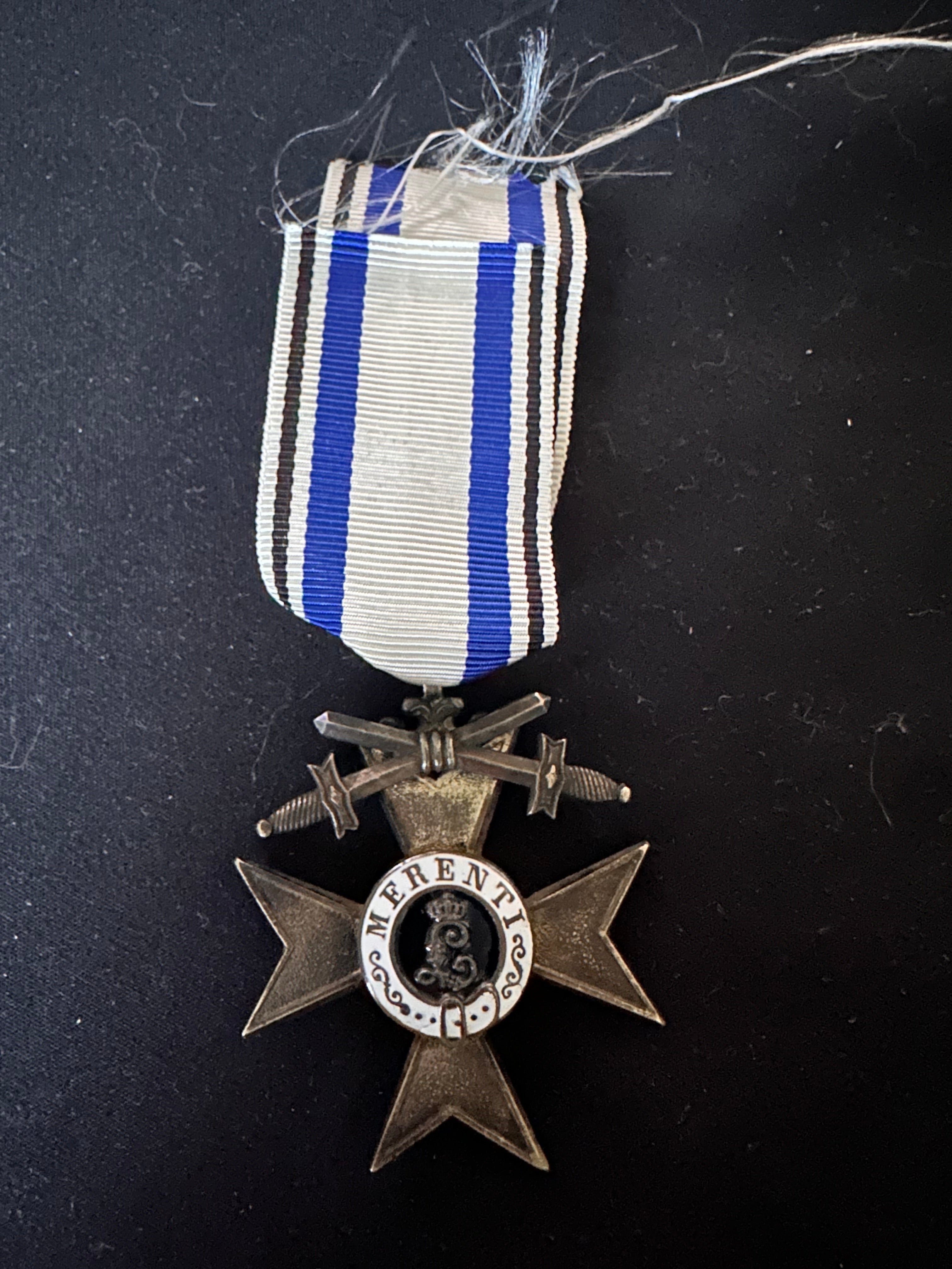 This example is the Knight’s Cross 2nd Class with Swords, denoting a wartime bestowal. The decoration is a finely struck bronze-gilt cross pattée with pebbled arms. The obverse center medallion features a raised royal crown above the cipher “L” for King Ludwig II, encircled by a white enameled ring bearing the motto MERENTI (“For Merit”). The enamel remains intact, with only the most minor age wear. Above the cross sits a hollow Bavarian crown with crisp detail and an integral suspension ring. Crossing through the crown are two finely executed gilt swords with ribbed hilts and ball finials, denoting the decoration was awarded specifically for combat merit rather than peacetime service.