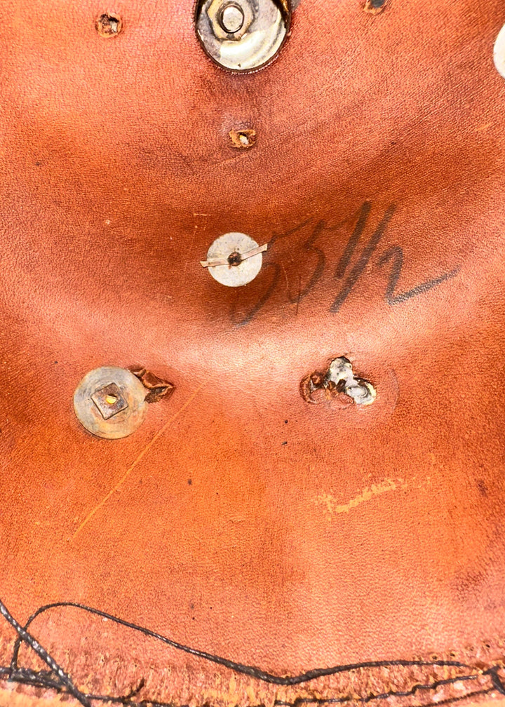 The interior features a beautiful rust-colored ribbed silk liner, fully intact, paired with a complete cross-stitched leather sweatband. The liner is supple with only minor age wear and no structural compromise.