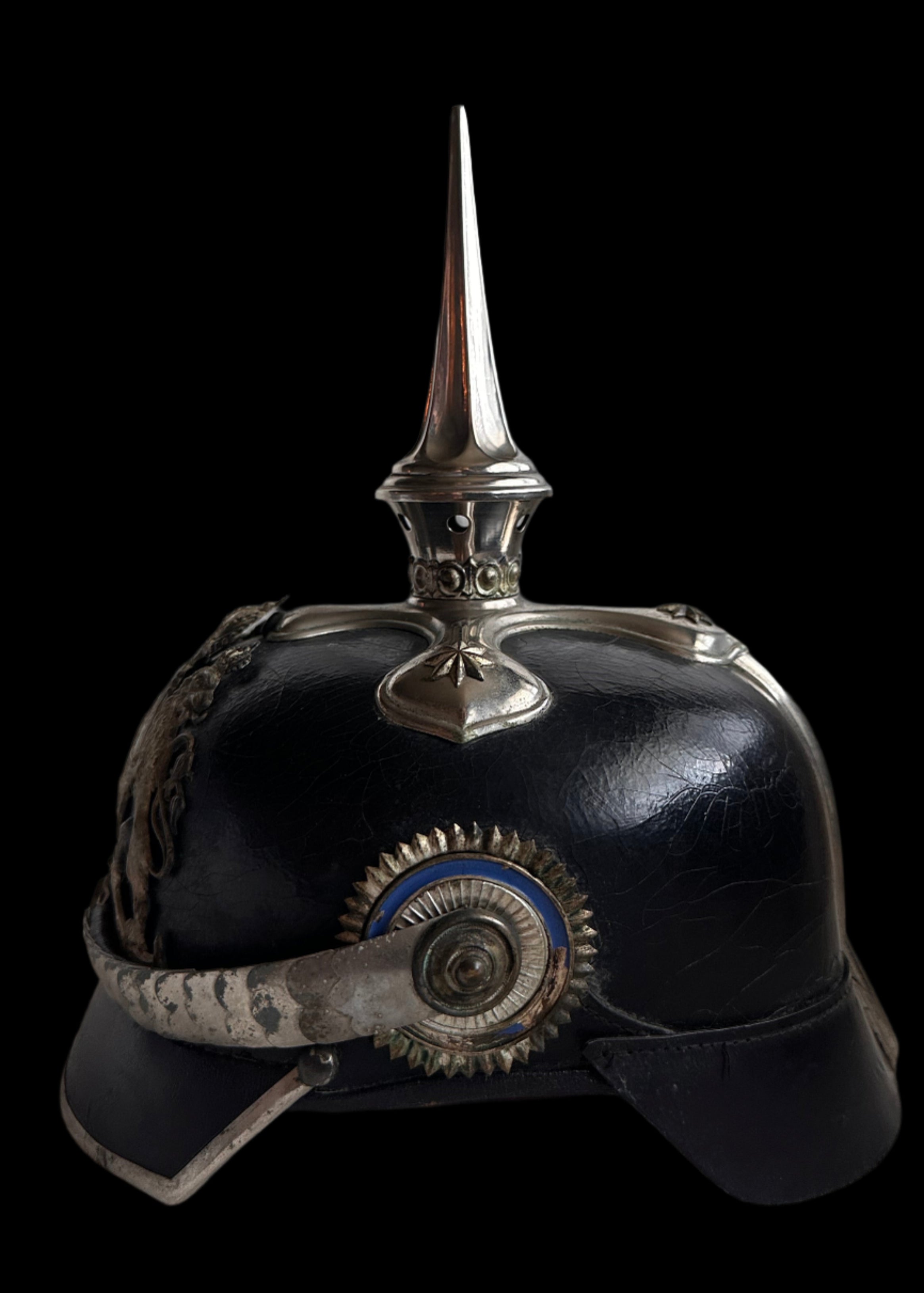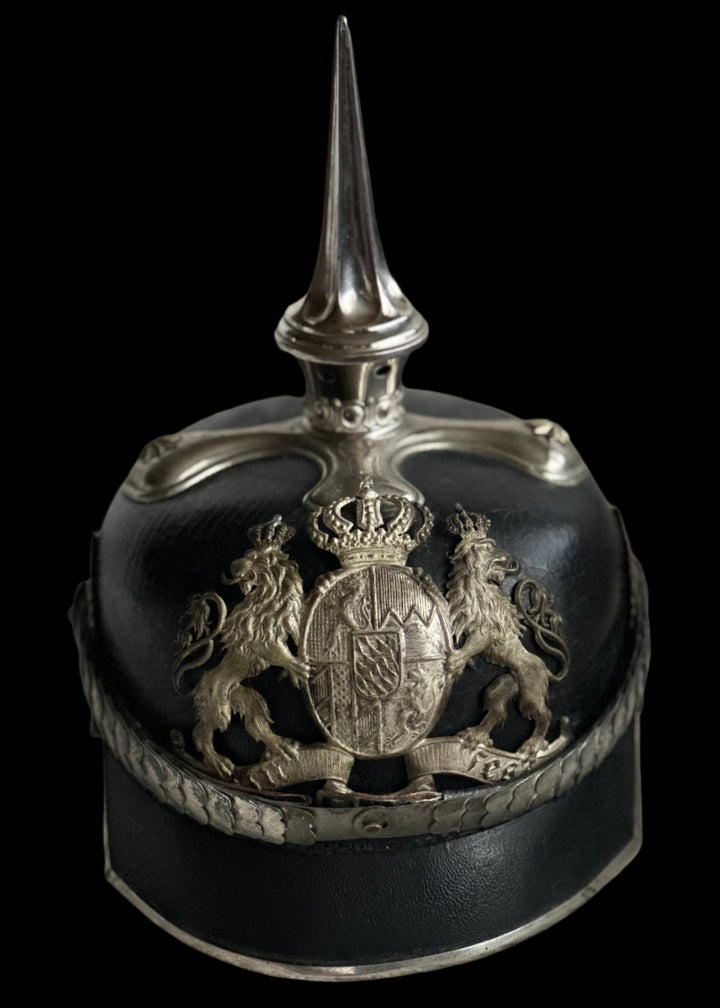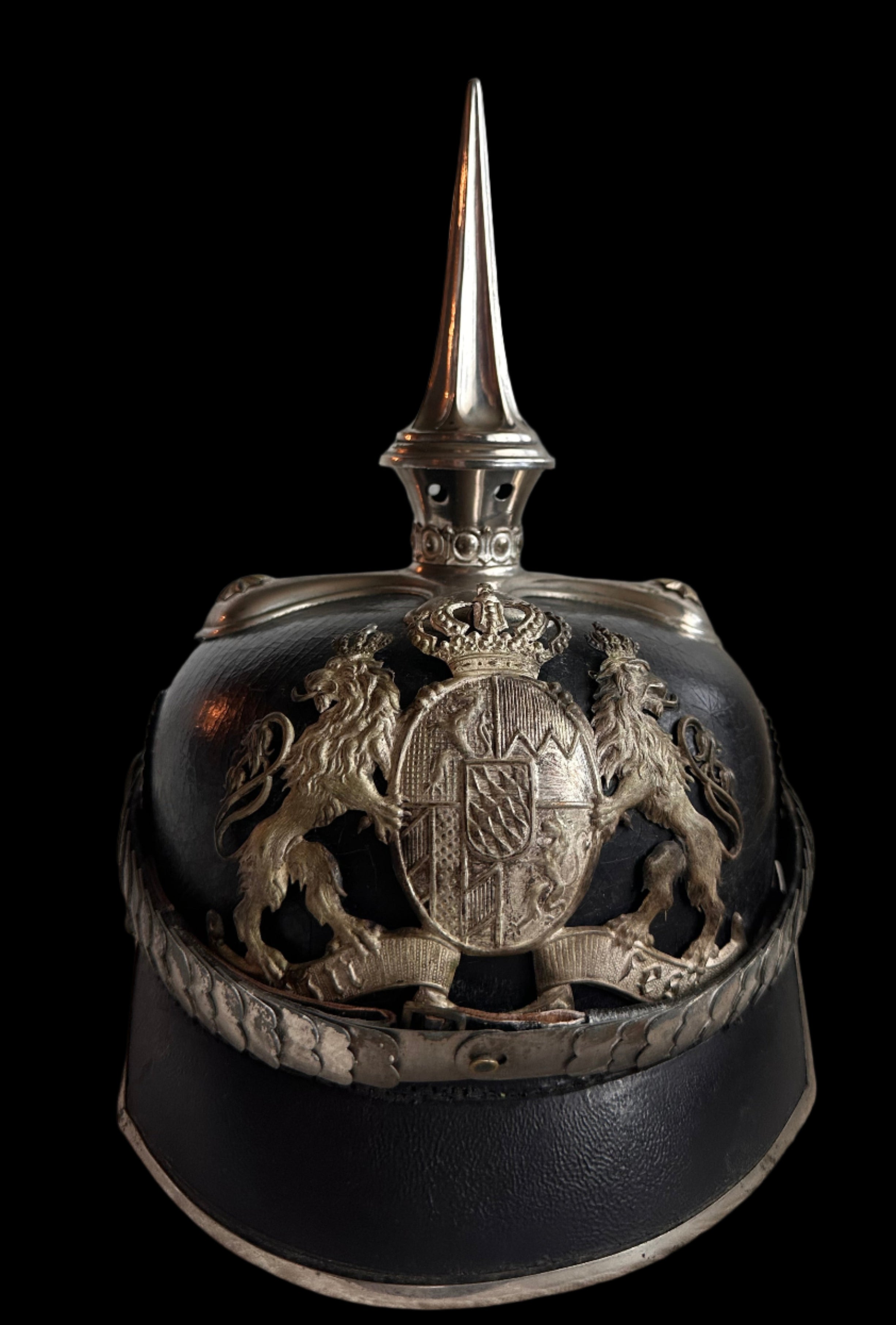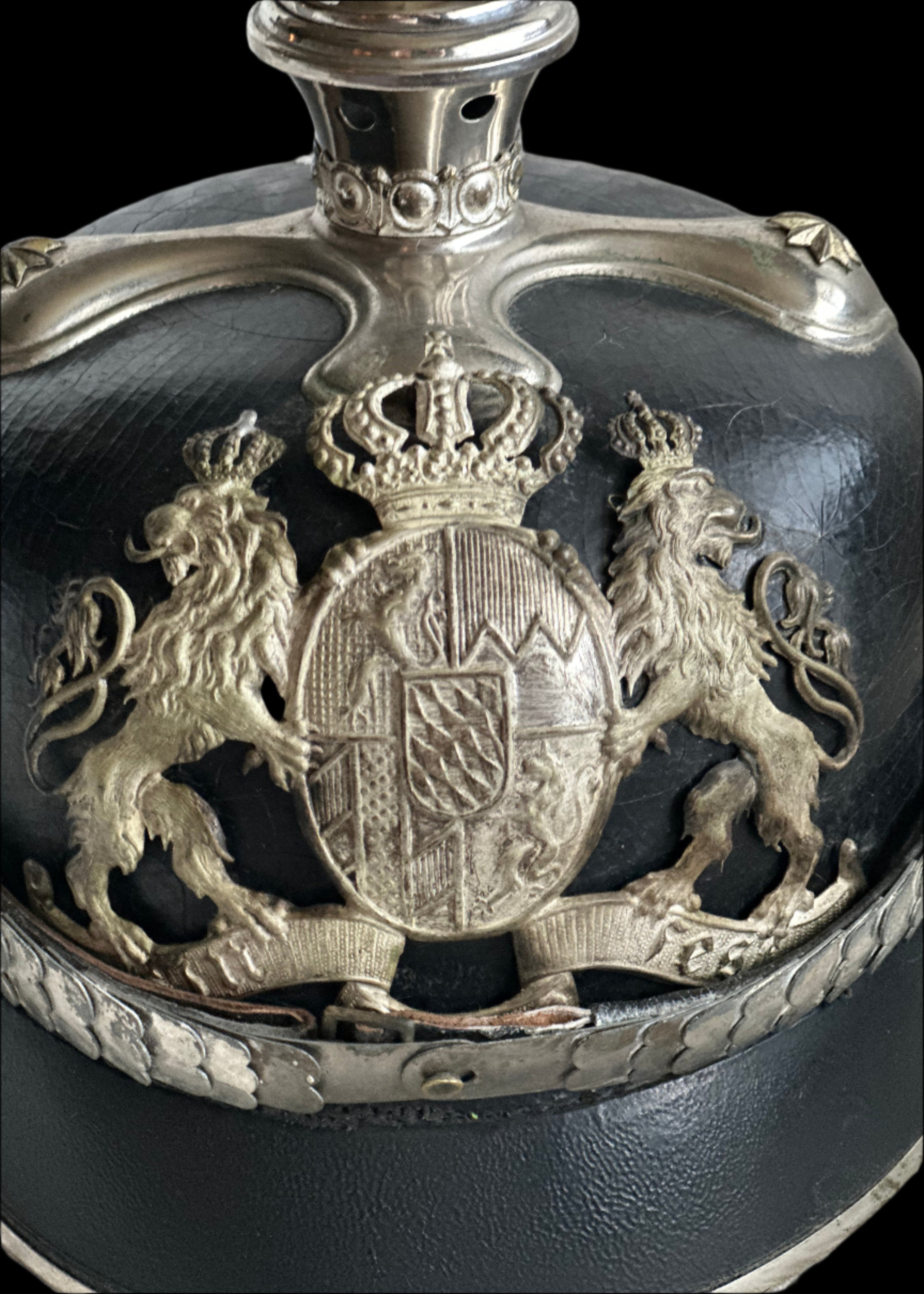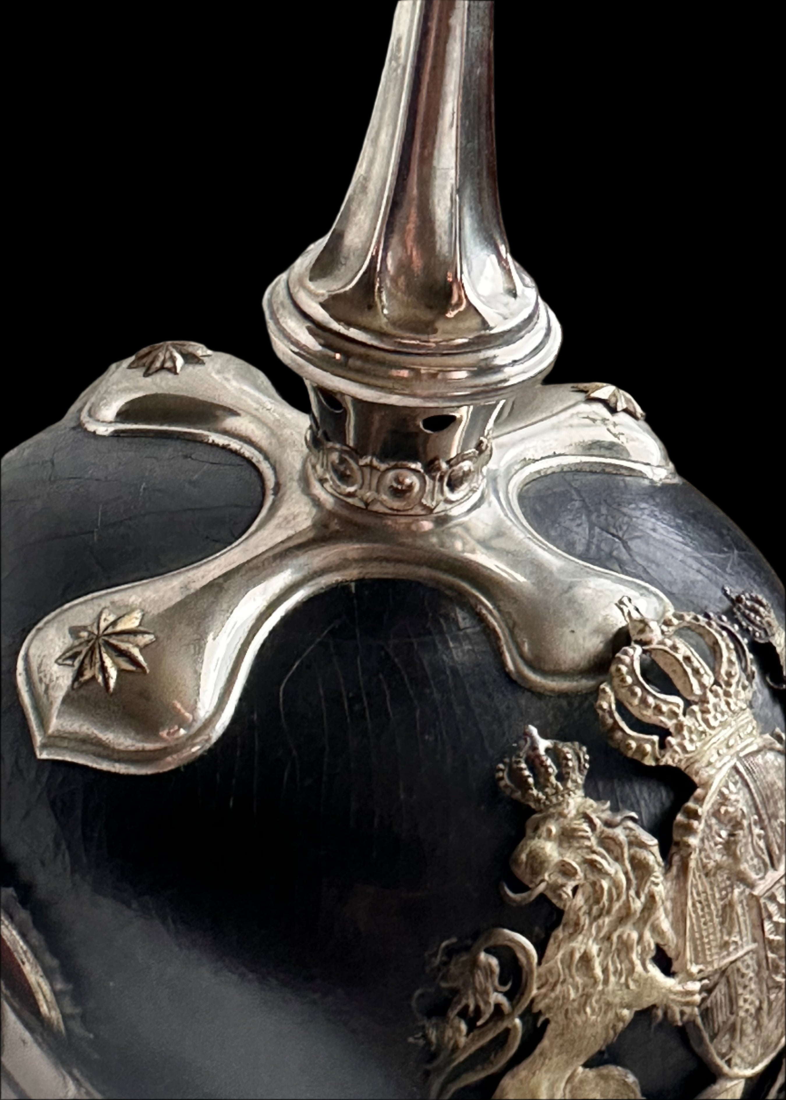 This exceptional officer’s Pickelhaube hails from the elite Infanterie-Leib-Regiment of the Royal Bavarian Army, founded in 1814 and garrisoned in Munich. As the most prestigious infantry regiment in the Bavarian Army, it was considered the King’s Own—a formation deeply steeped in ceremonial and dynastic tradition. This helmet reflects that status in both construction and presentation.