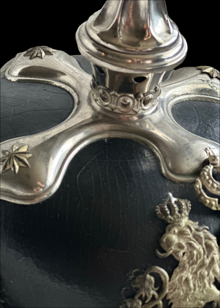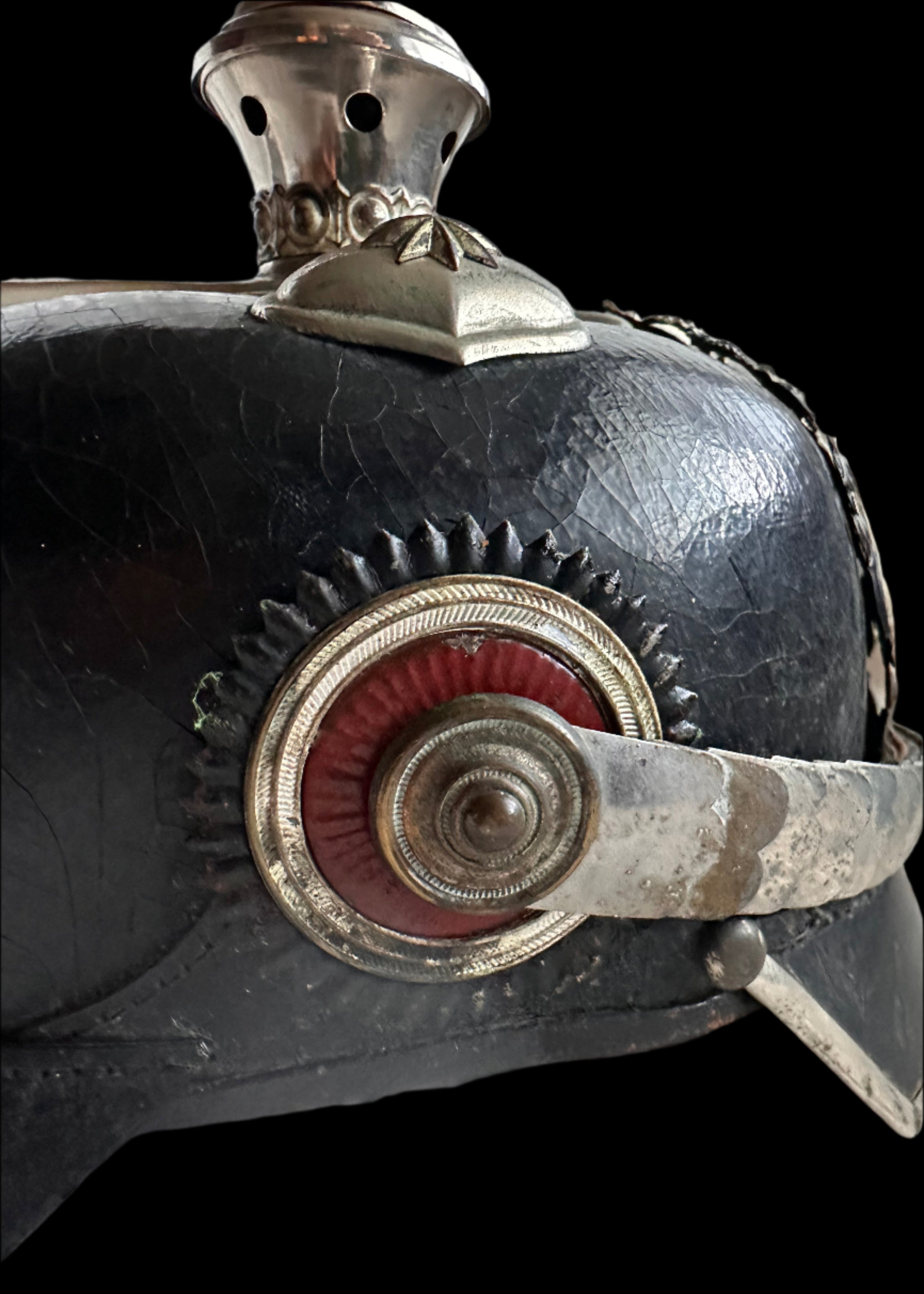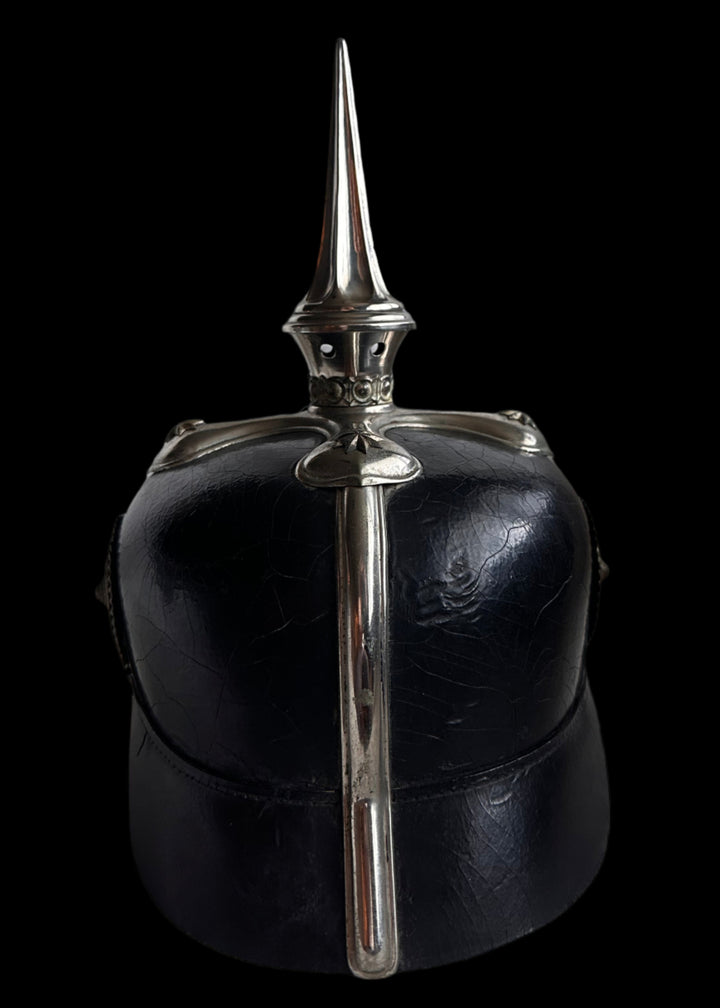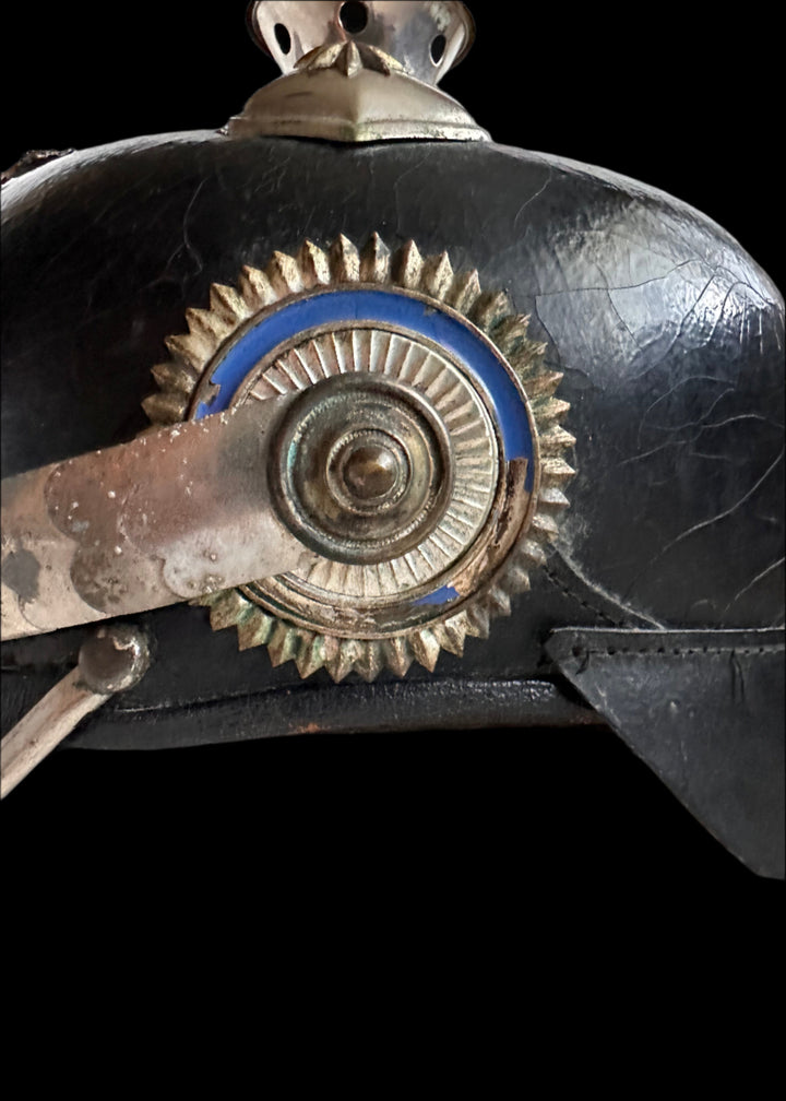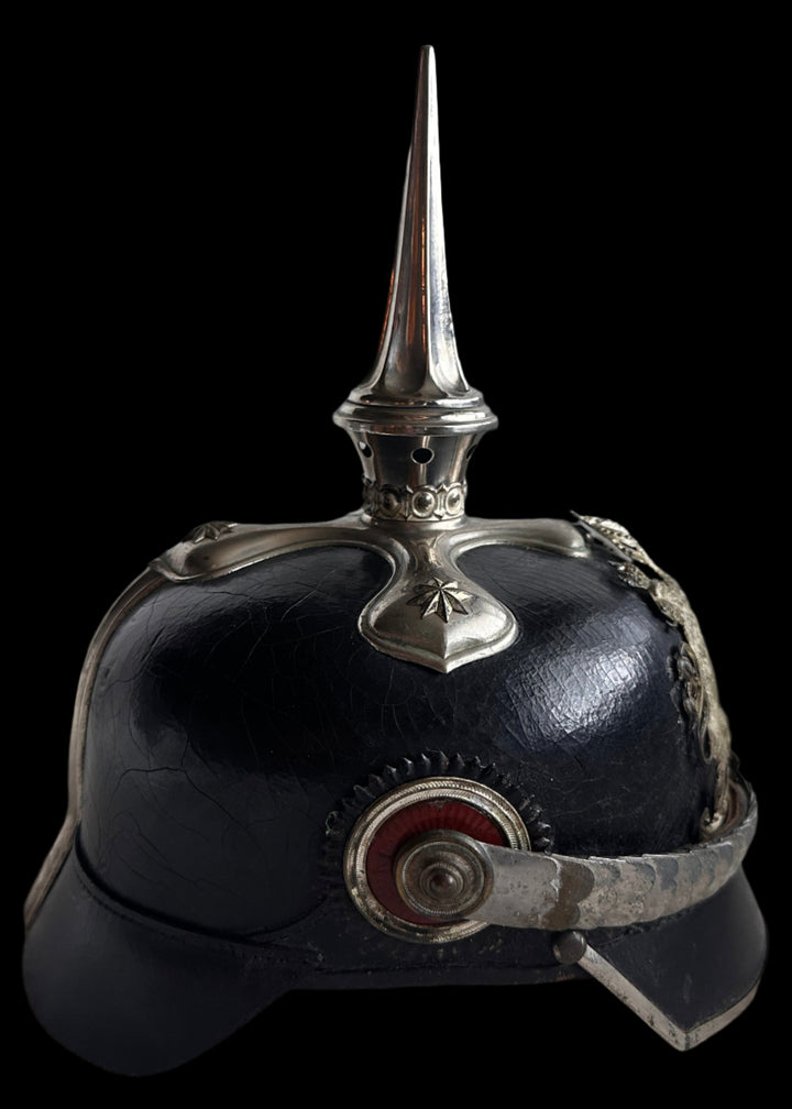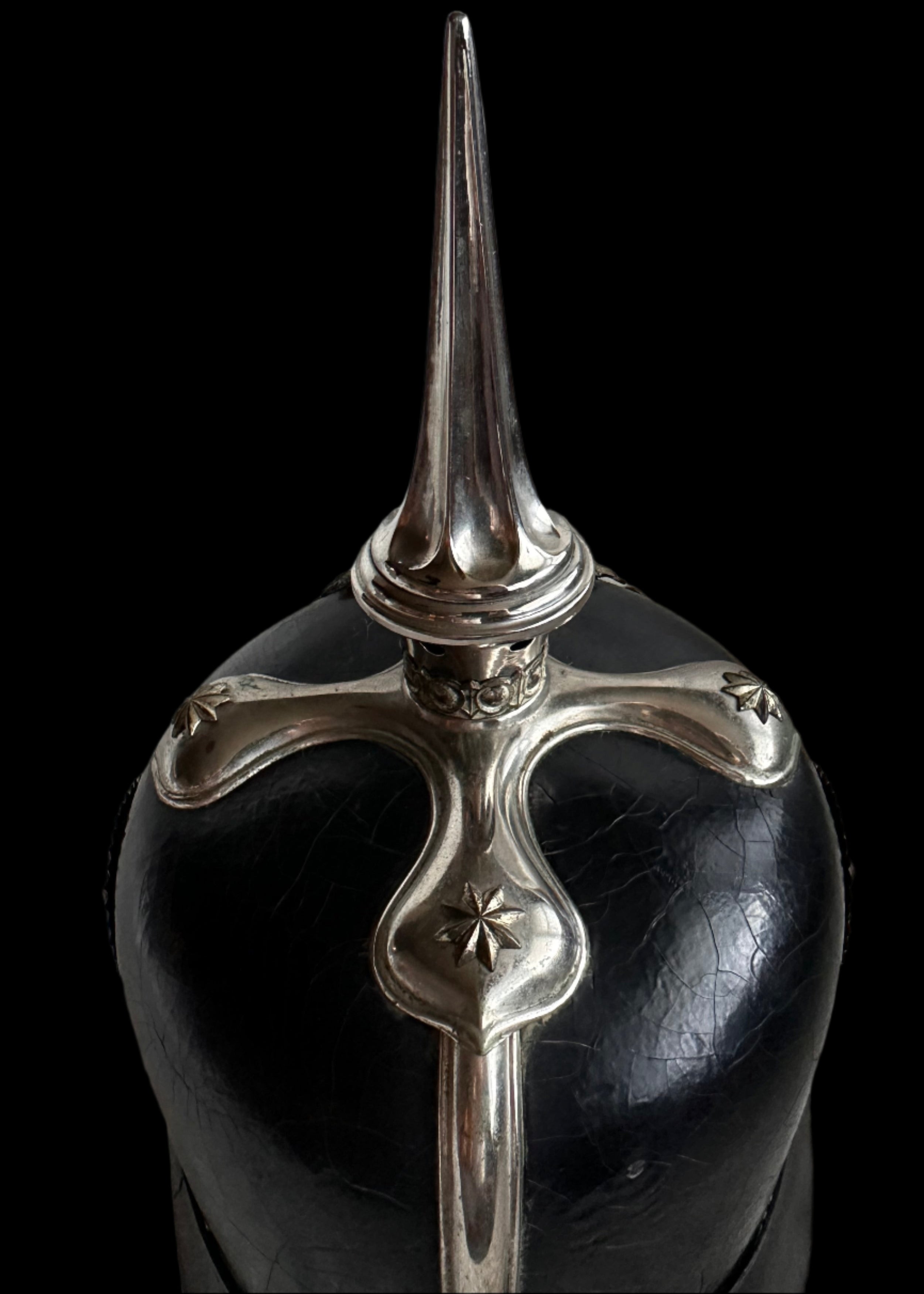 This exceptional officer’s Pickelhaube hails from the elite Infanterie-Leib-Regiment of the Royal Bavarian Army, founded in 1814 and garrisoned in Munich. As the most prestigious infantry regiment in the Bavarian Army, it was considered the King’s Own—a formation deeply steeped in ceremonial and dynastic tradition. This helmet reflects that status in both construction and presentation.