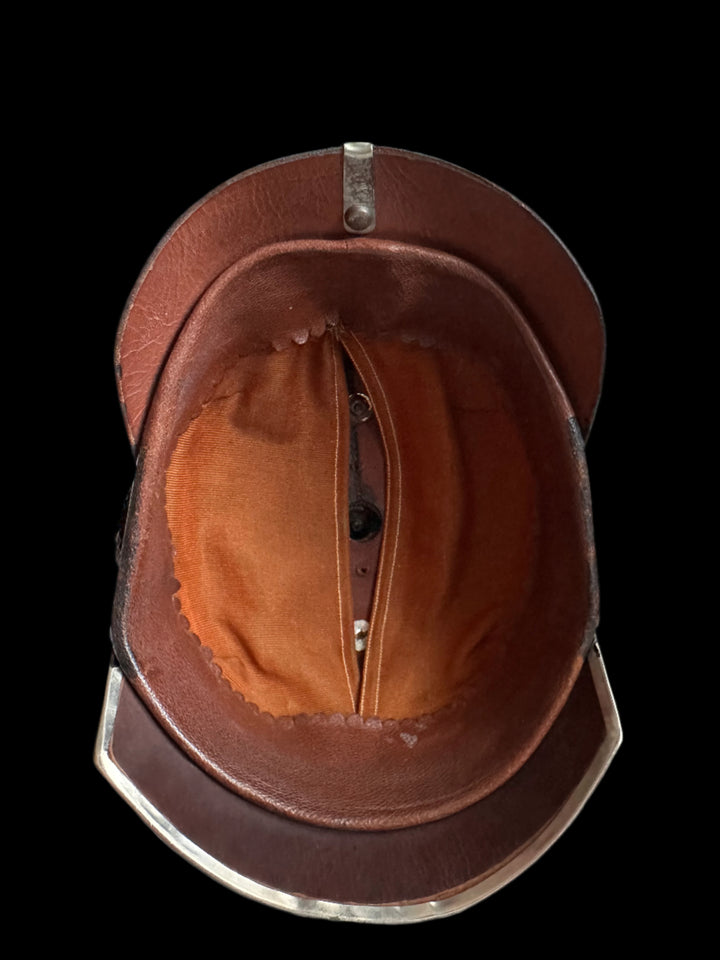 The helmet features an excellent black lacquered leather body with only minor surface spidering, retaining its firm shape and full gloss. Its most distinctive feature is the square front visor, a known marker of officer-grade helmets for this regiment; enlisted versions instead featured the standard rounded visor.
