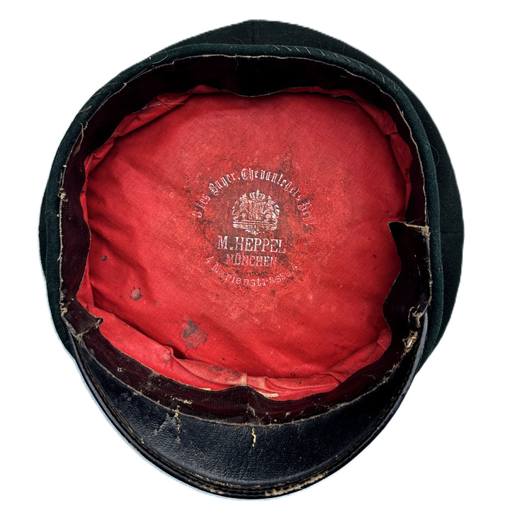 Maker's Mark: The interior of the cap bears the manufacturer’s stamp “M. Heppel, München,” a well-known Bavarian outfitter that produced military uniforms and caps during the period. The red silk liner is somewhat worn but retains much of its original integrity, adding to the cap’s authenticity.