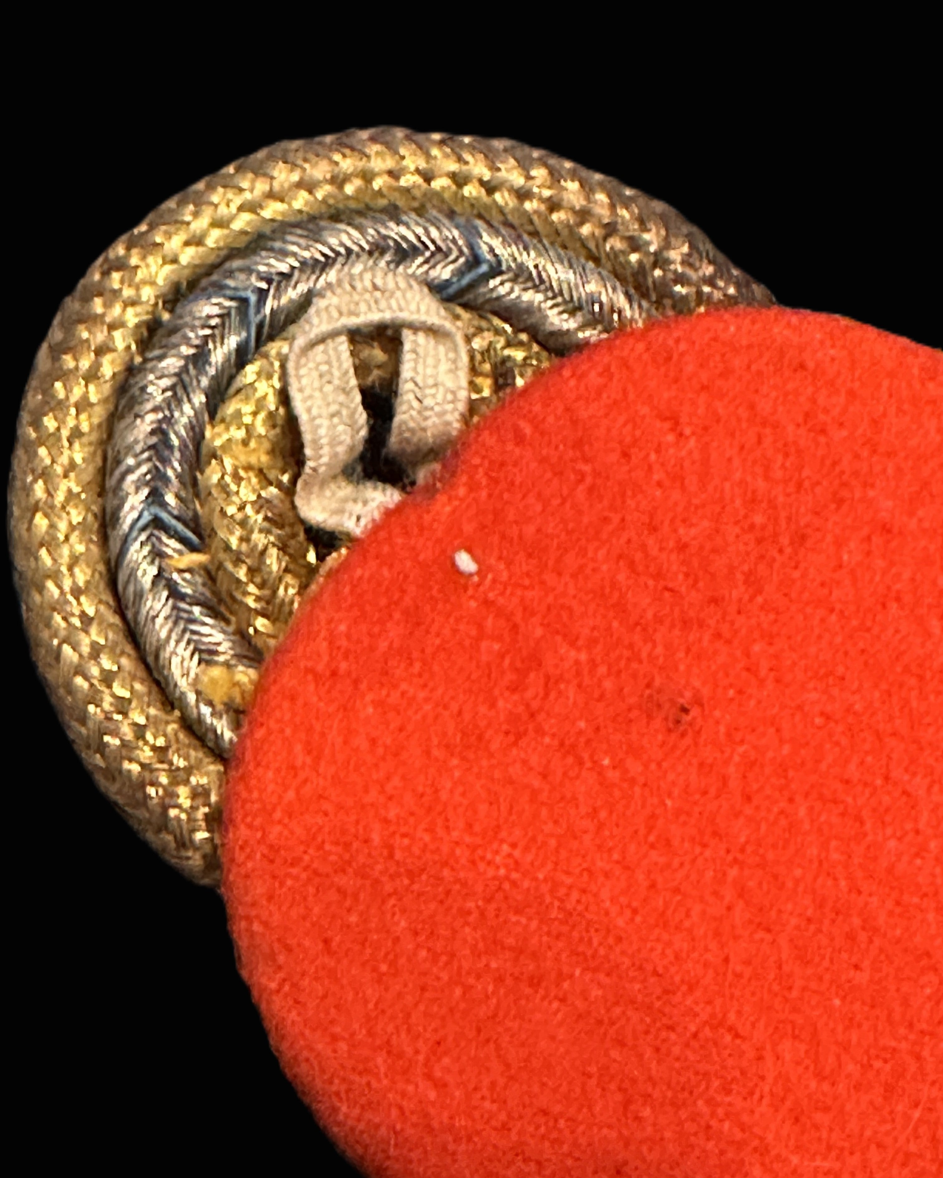 Condition: Very fine. The gilt and silver cords remain bright, with only light toning and age patina. The red underlay is strong in color with minimal moth nips. The piece retains its full form and displays exceptionally well.