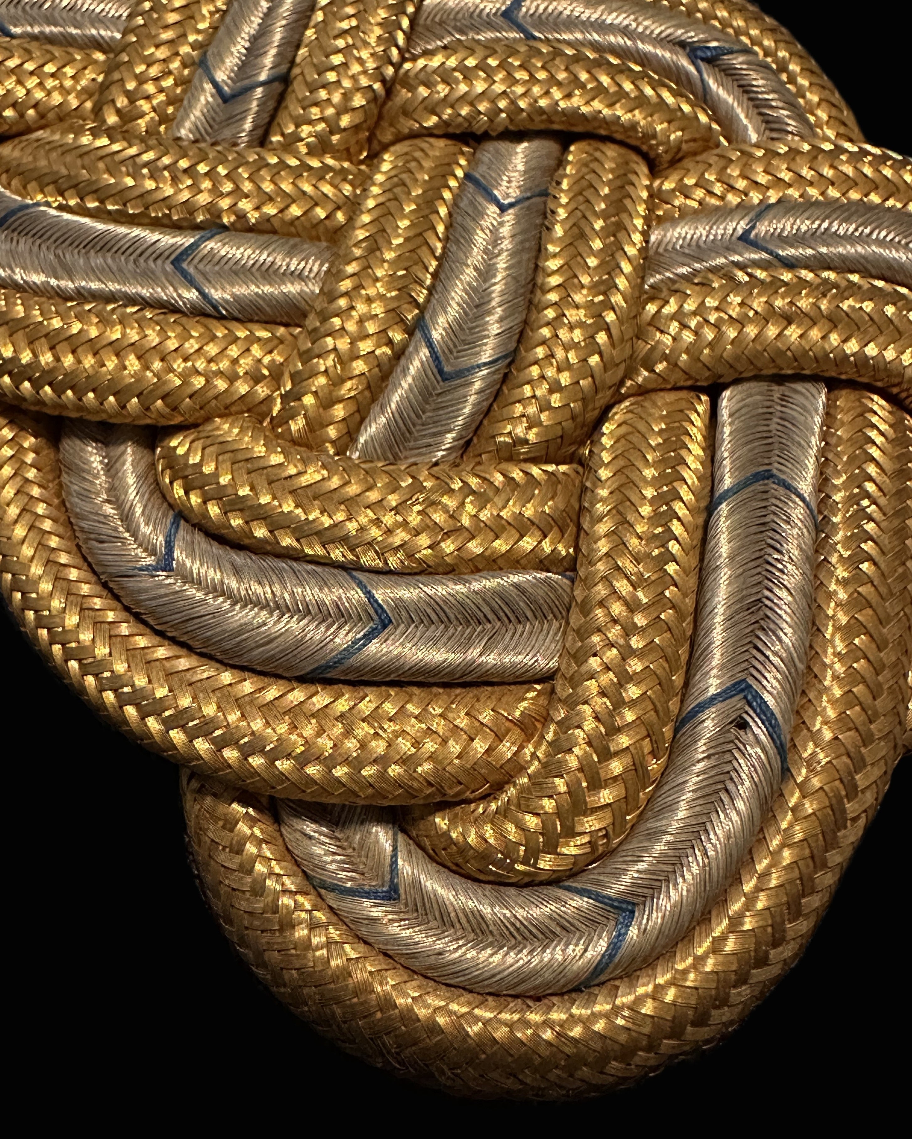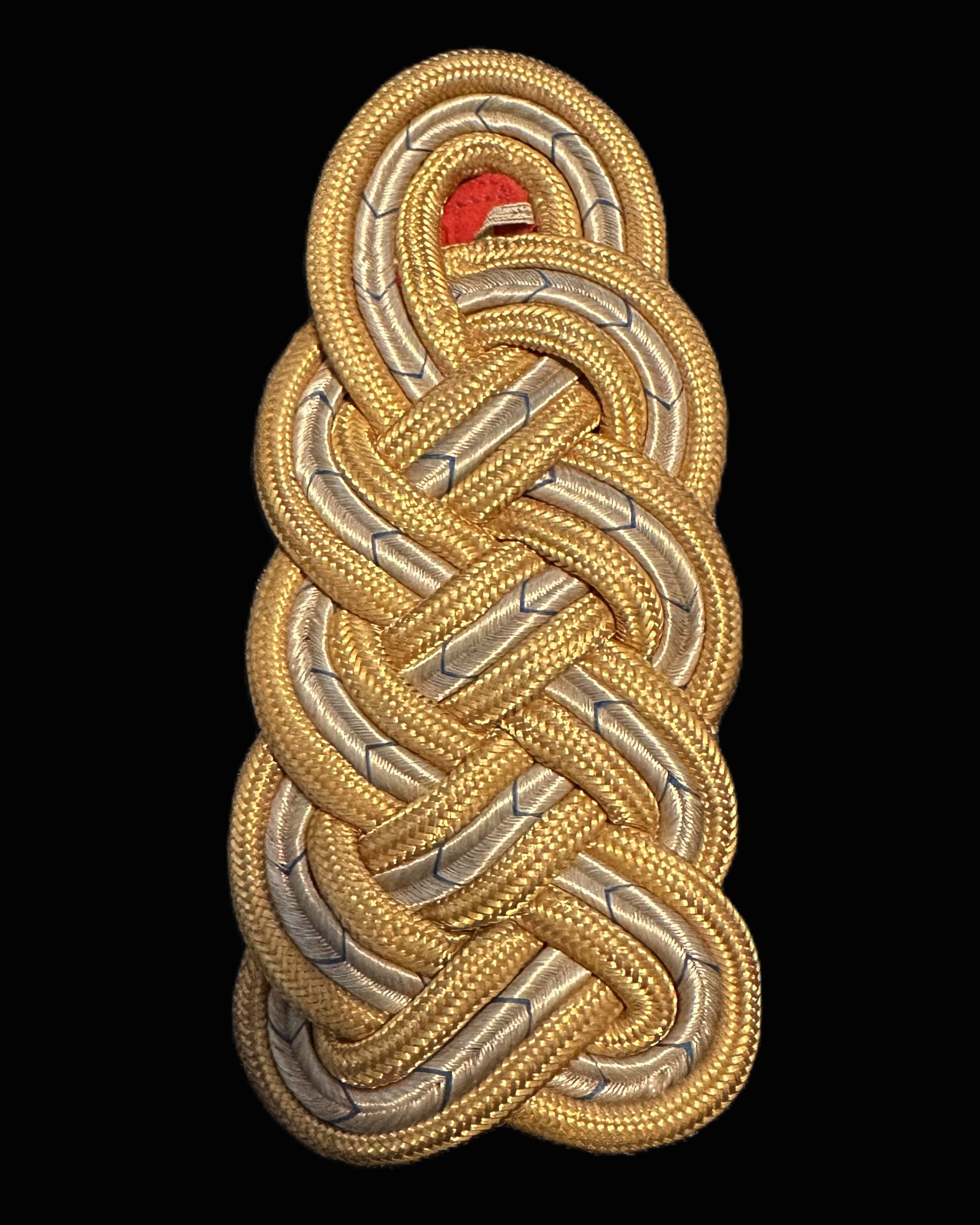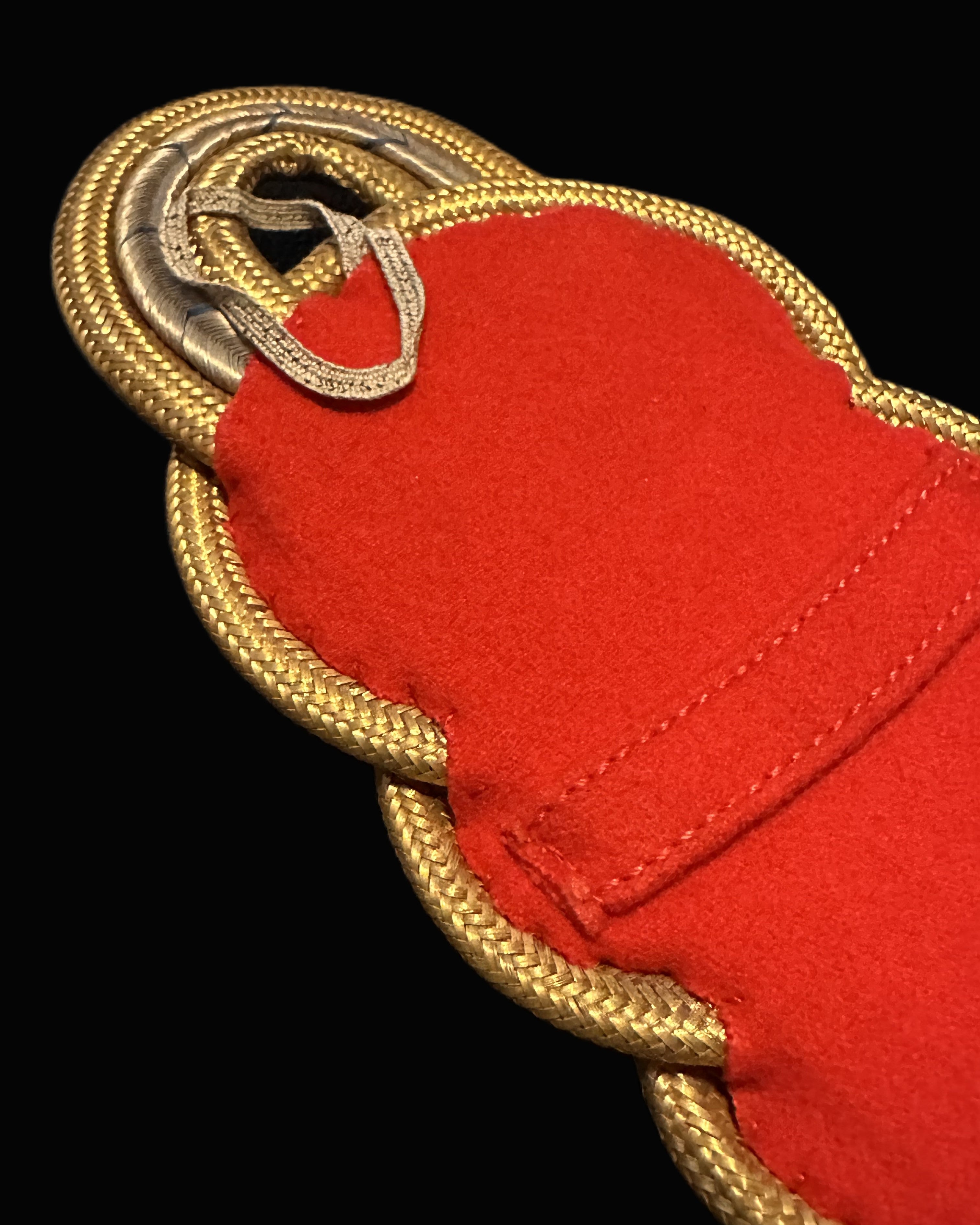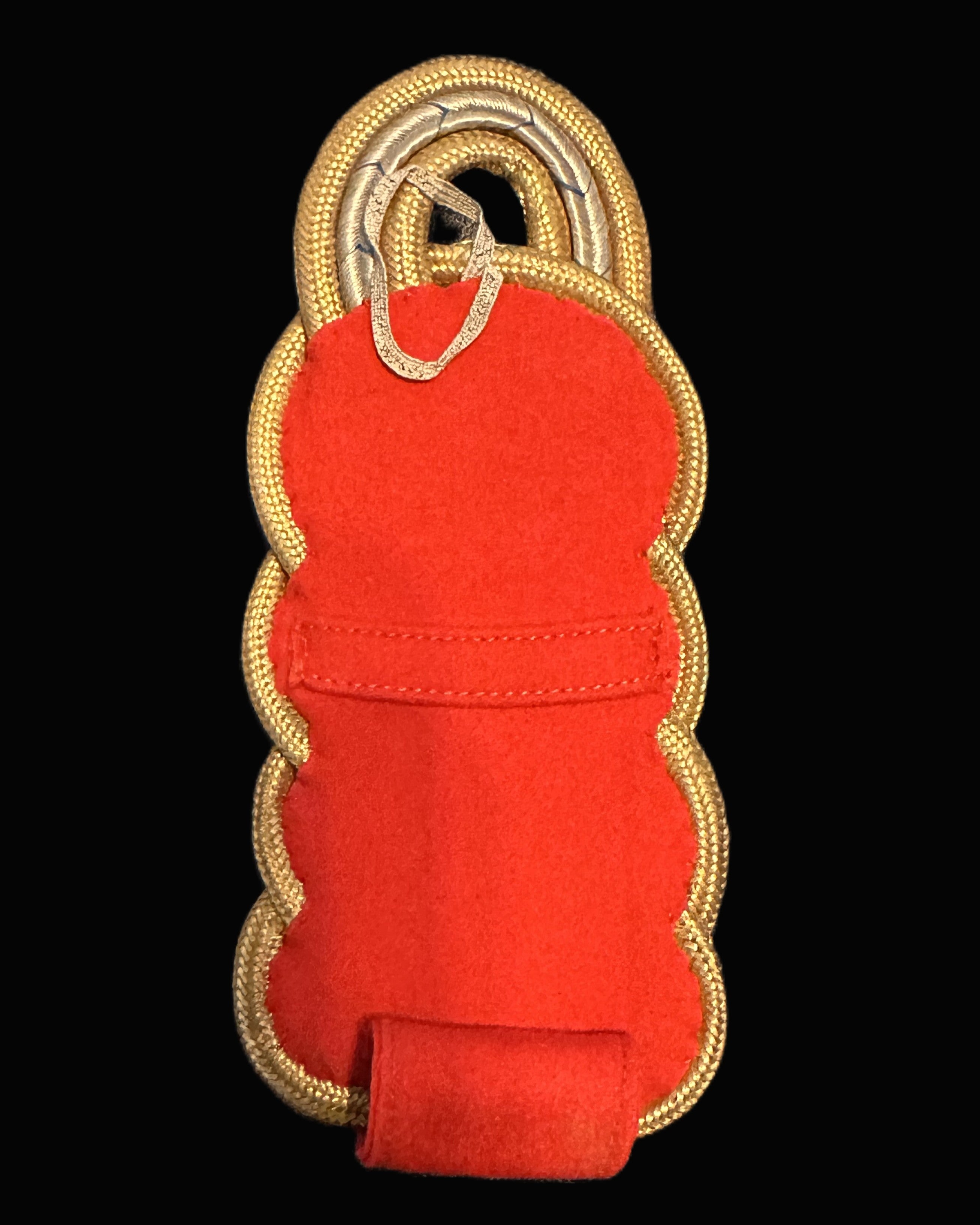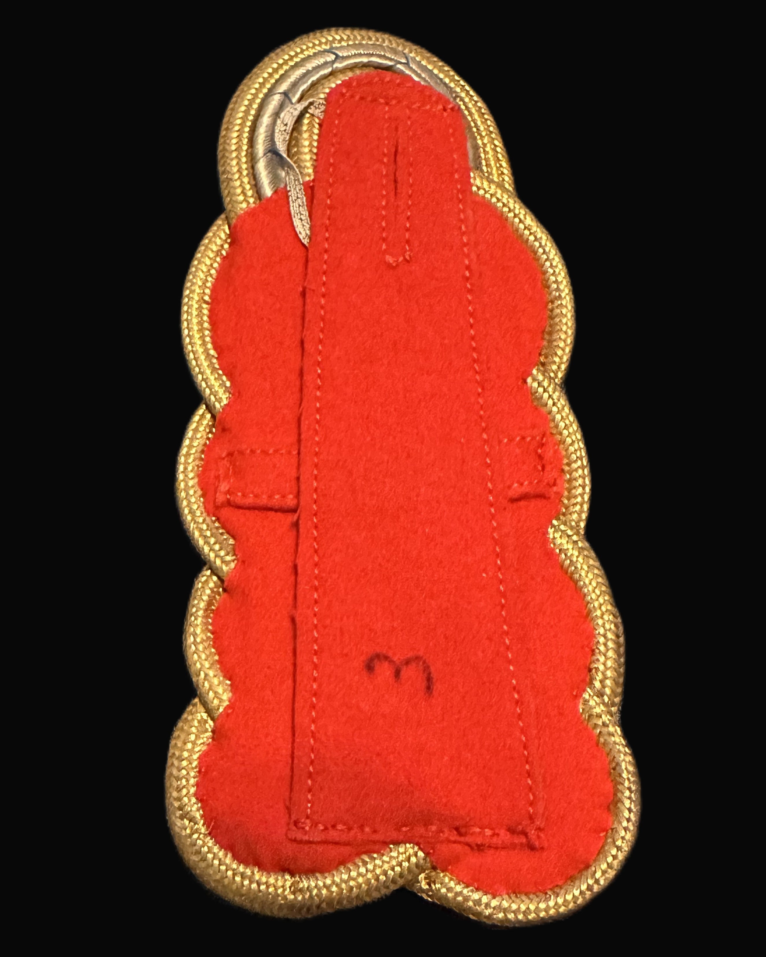 This is a single overcoat shoulder board for a Generalmajor of the Royal Bavarian Army, the lowest general officer rank and equivalent to a one-star general. Constructed of the distinctive interwoven gilt and silver Russia braid, the pattern immediately identifies the wearer as a member of the Bavarian general staff. The underlay is of crimson red wool, the branch color of Bavarian generals, and is neatly stitched with the folded tongue intact.