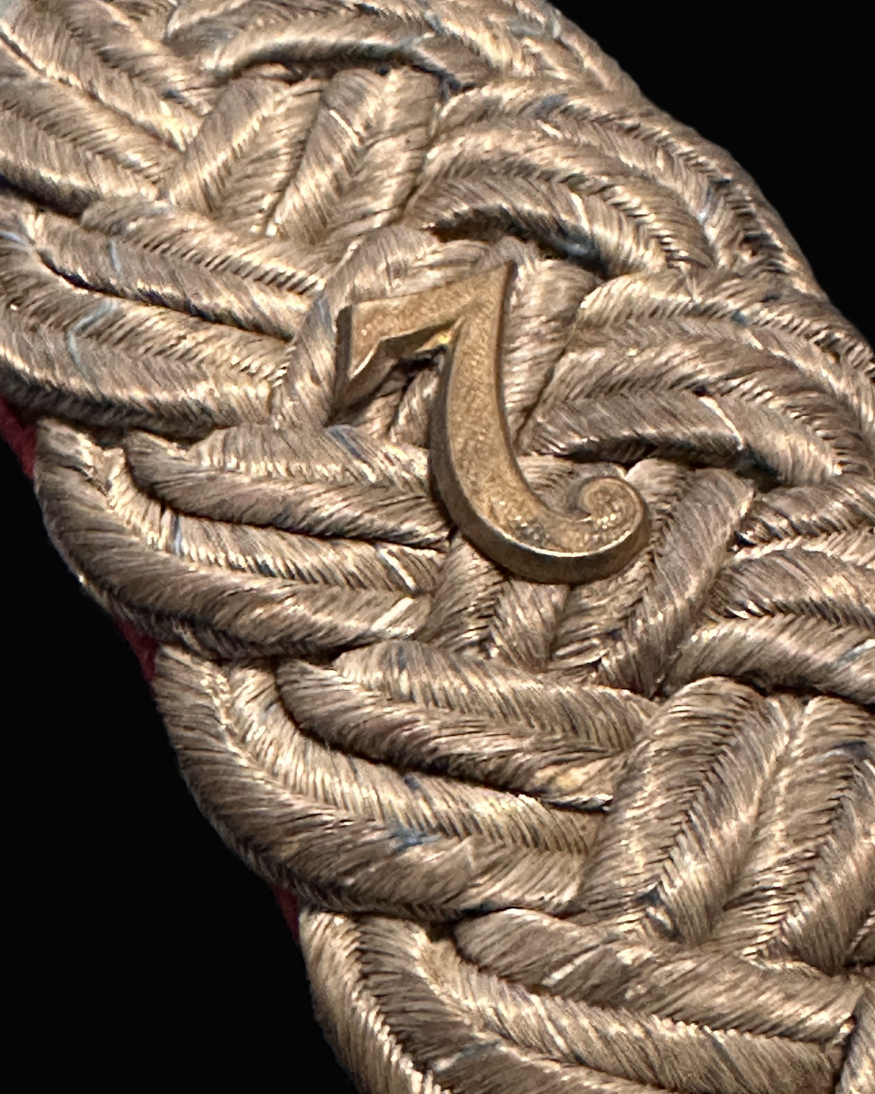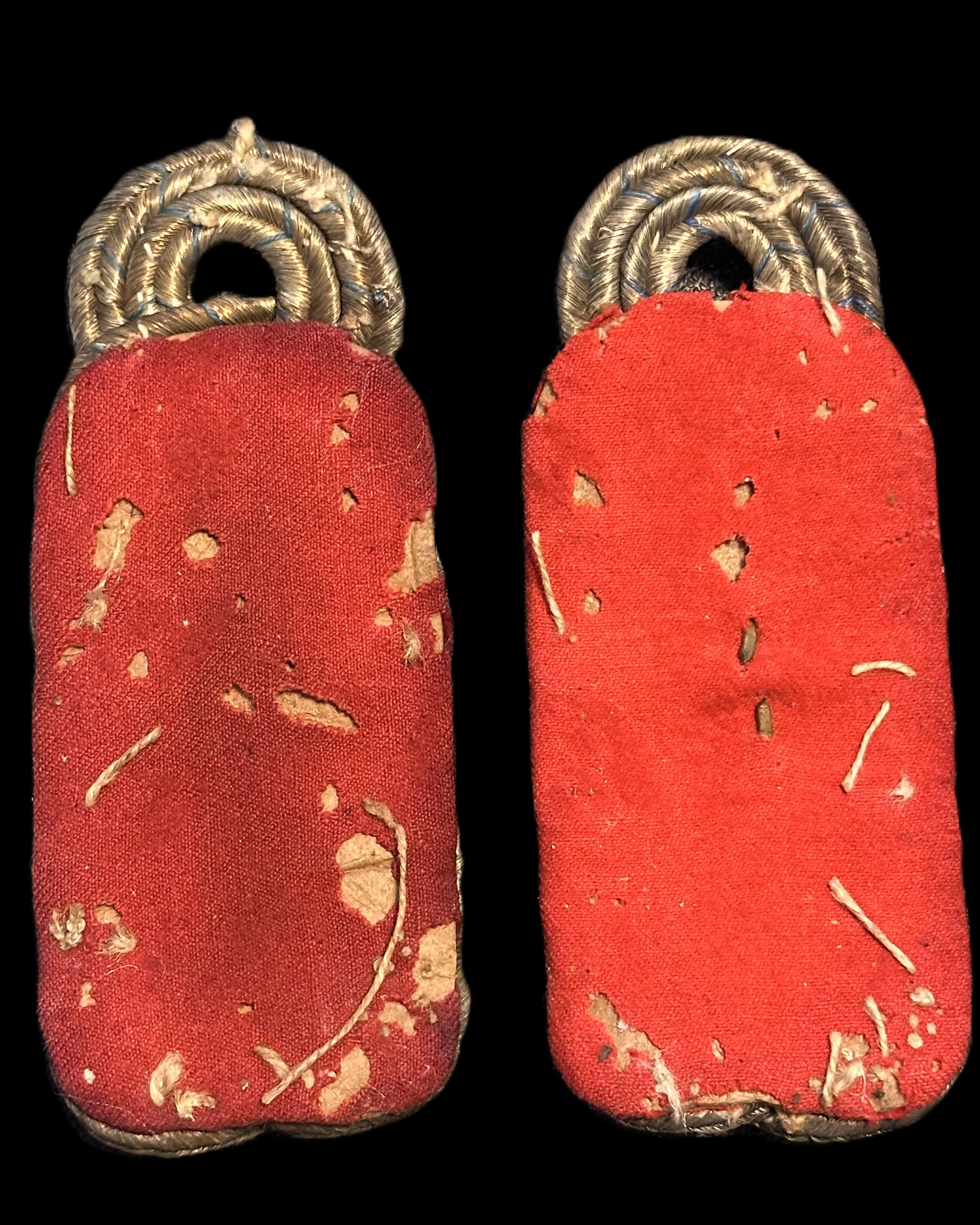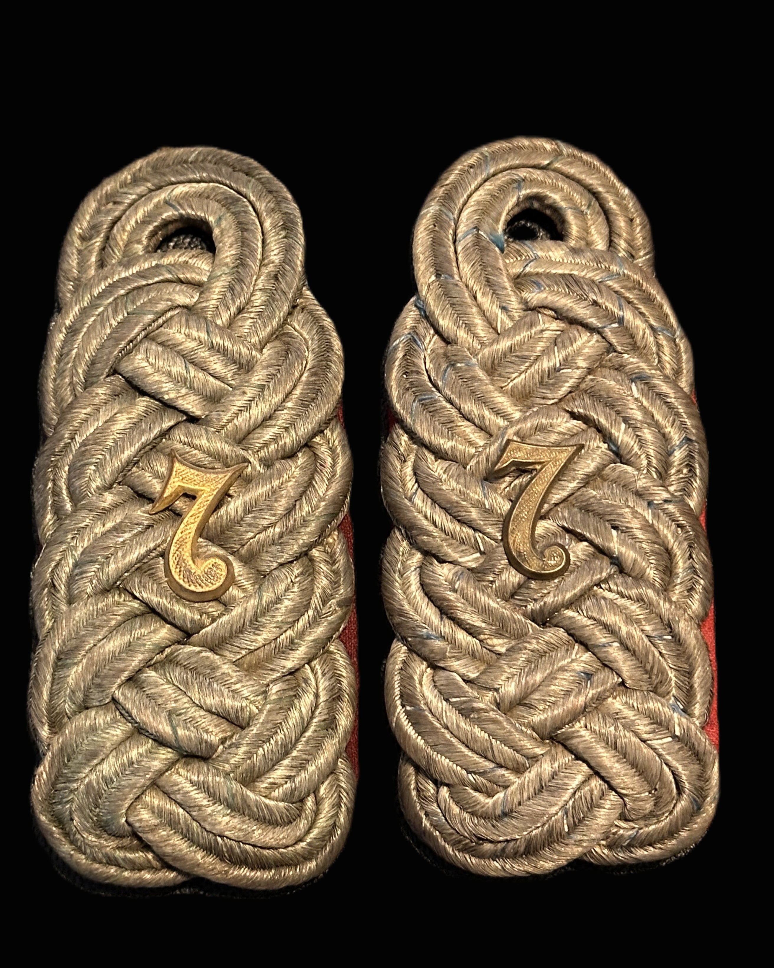 This is a fine and original matched pair of officer’s shoulder boards for a Major in the Bavarian 7. Infanterie-Regiment, a formation with a distinguished record of service within the Royal Bavarian Army. The boards feature the classic interwoven silver bullion cord construction, richly toned from age and field use. At the center of each rests a gilt regimental numeral “7” in the elegant curled Bavarian style, denoting assignment to the regiment.