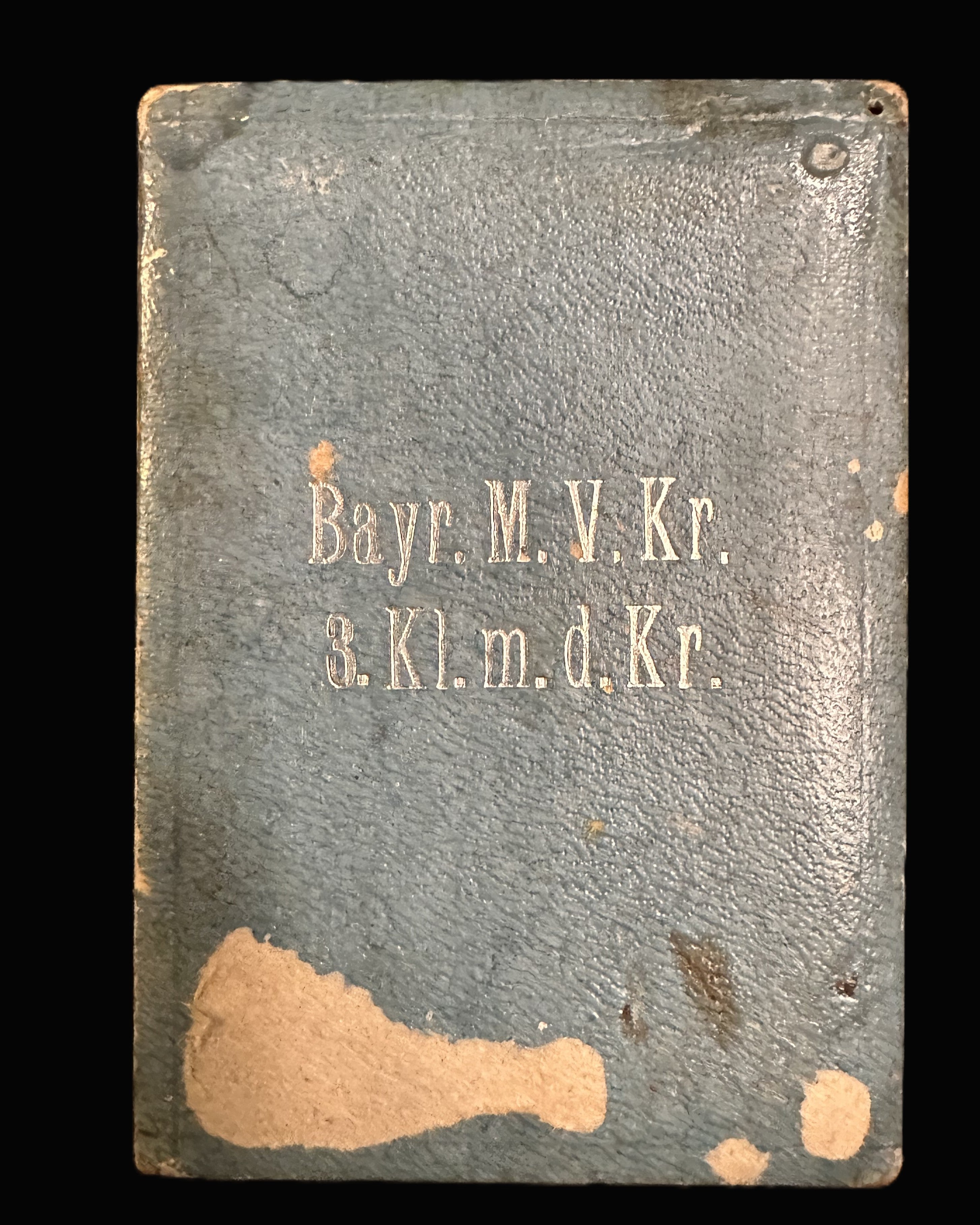 Case: Covered in blue leatherette, with wear and loss consistent with age, particularly to the lid. The lid is embossed in silver with the designation Bayr. M.V.Kr. 3. Kl. m. d. Kr. (Bavarian Military Merit Cross 3rd Class with Crown). The interior features a rich violet silk lid liner marked in gilt “Deschler & Sohn, München”, and a dark blue velvet medal bed, complete with functional retaining clasp.