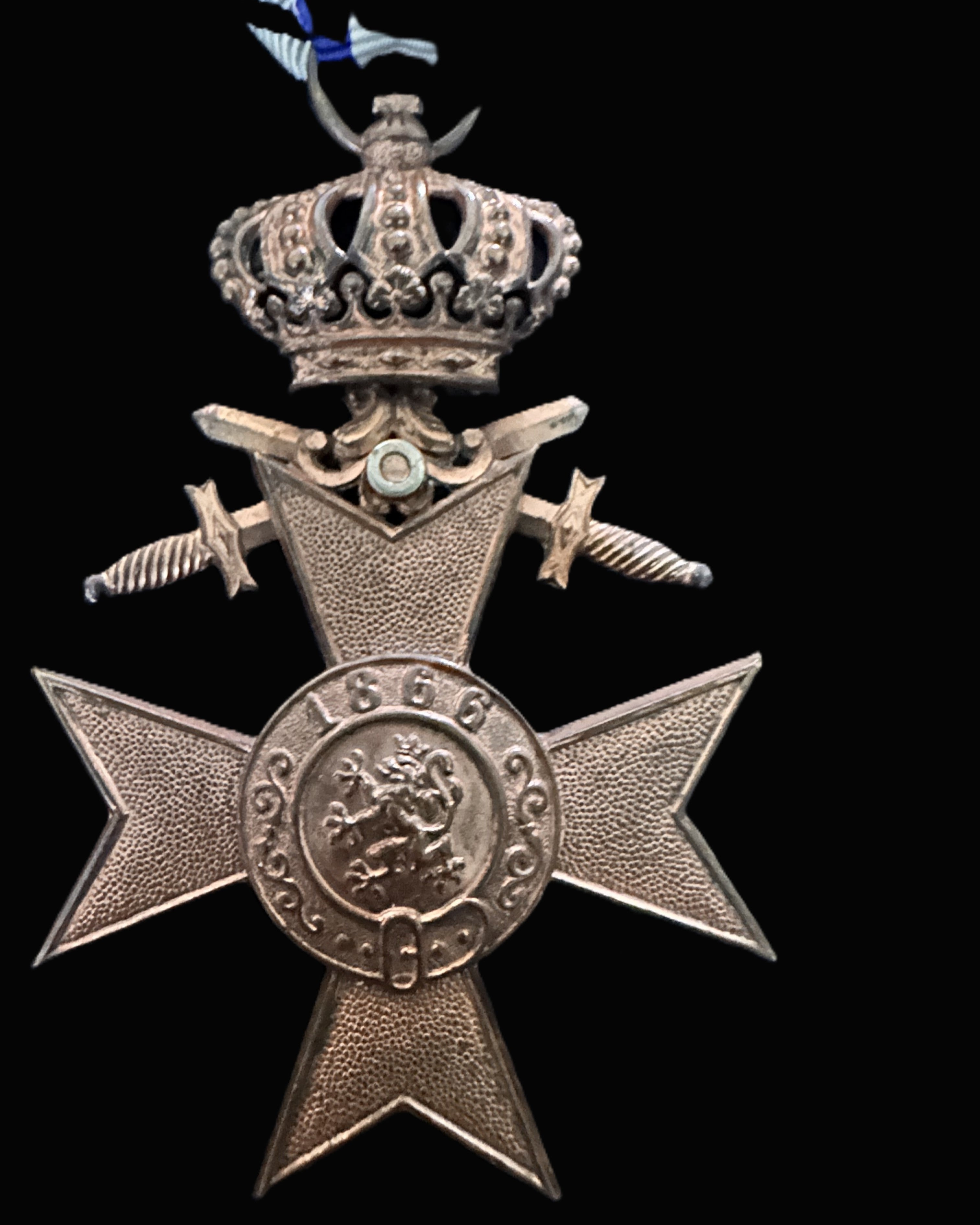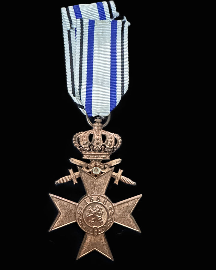 A handsome, original full-size Kingdom of Bavaria Military Merit Cross (Militär-Verdienstkreuz), 3rd Class, presented in the wartime configuration with crown suspension and crossed swords, complete with its correct ribbon. The decoration is struck in a bronzed base metal with a warm, even tone and honest age to the surfaces. The cross arms show the classic stippled/granulated field finish within a raised border, giving the piece the proper period texture rather than the flat, glossy look seen on later replacements. The obverse center medallion is dated “1866” at the top, with the Bavarian heraldic lion at center, surrounded by a scrollwork ring—crisp enough to read cleanly, with mild smoothing to the highest points from handling and wear. Above the cross is the Bavarian royal crown suspension, richly detailed with pierced/openwork elements and beaded highlights, and behind the crown the crossed swords are present, correctly rendered with ribbed grips and defined guards. The medal hangs from a round suspension ring and a long, folded ribbon in the Bavarian color family: a white field with multiple blue vertical stripes and black edge stripes (as seen), the ribbon neatly assembled to a standard pin-back style bar. No maker mark is visible in the provided views, which is not unusual for this class and era.