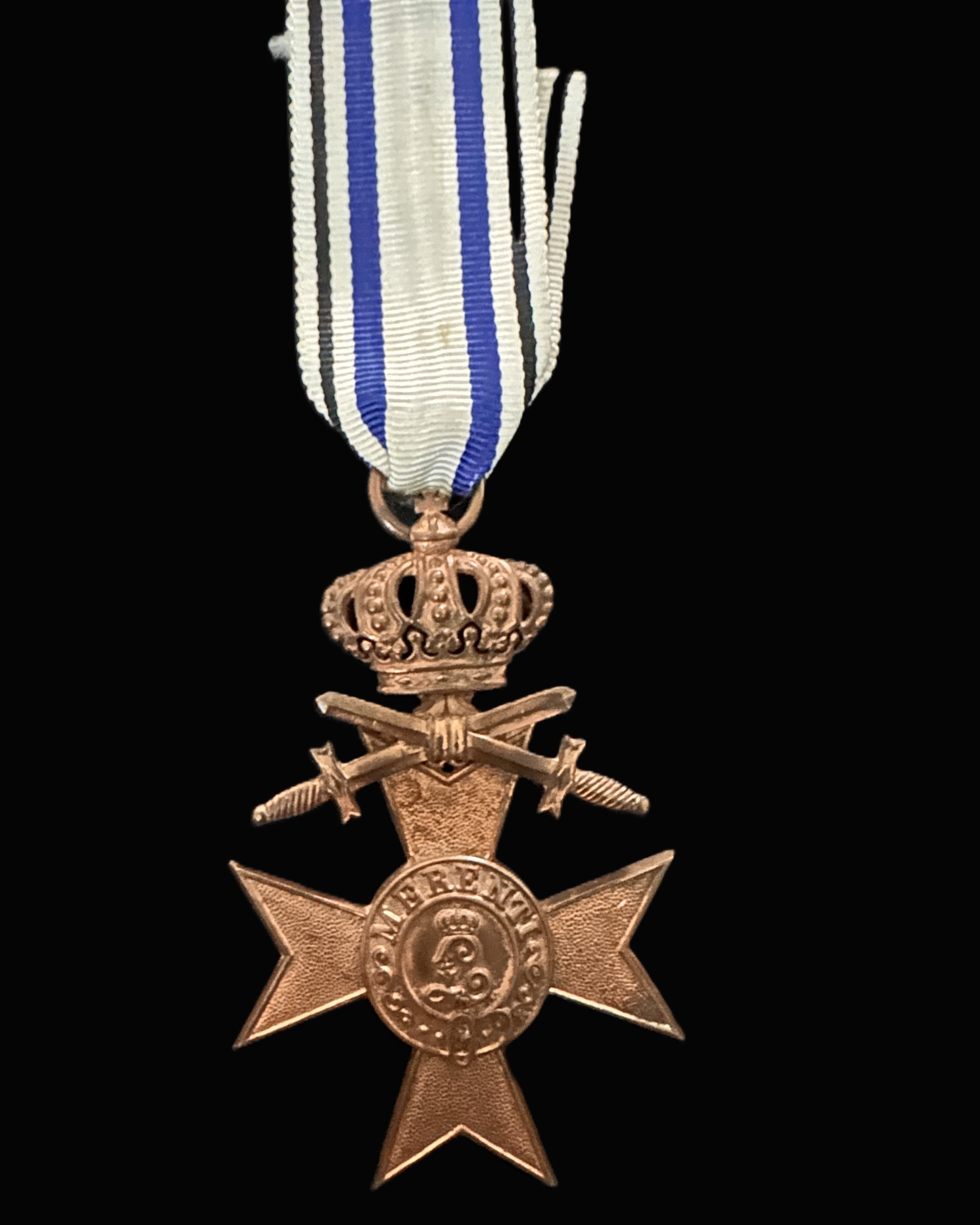 The “with swords” device is the critical wartime indicator. In the traditional German orders-and-awards system, swords generally denote merit in connection with war service (as opposed to peacetime or purely civil merit), and they are often the first thing an experienced collector checks to determine whether the piece is a “war award” configuration. The crown suspension is also a meaningful feature rather than decoration for decoration’s sake. Crowns were commonly used to denote a higher distinction within a class or a specific seniority/merit nuance depending on the award’s regulations over time. In the WWI context, the combination of crown and swords is widely recognized by collectors as a desirable, emblematic configuration—more visually dynamic, more clearly “combat era,” and simply scarcer than the most basic issue forms. It is also worth noting that Bavarian awards, while plentiful in aggregate due to the scale of the war, are highly stratified in collector desirability. The more complete and correct the configuration (proper crown, correct swords, correct ribbon, honest period construction), the more confident a buyer can be that the piece has not been “improved” with later parts. This example reads as an honest survivor: it has the right look, the right components, and the right aging.