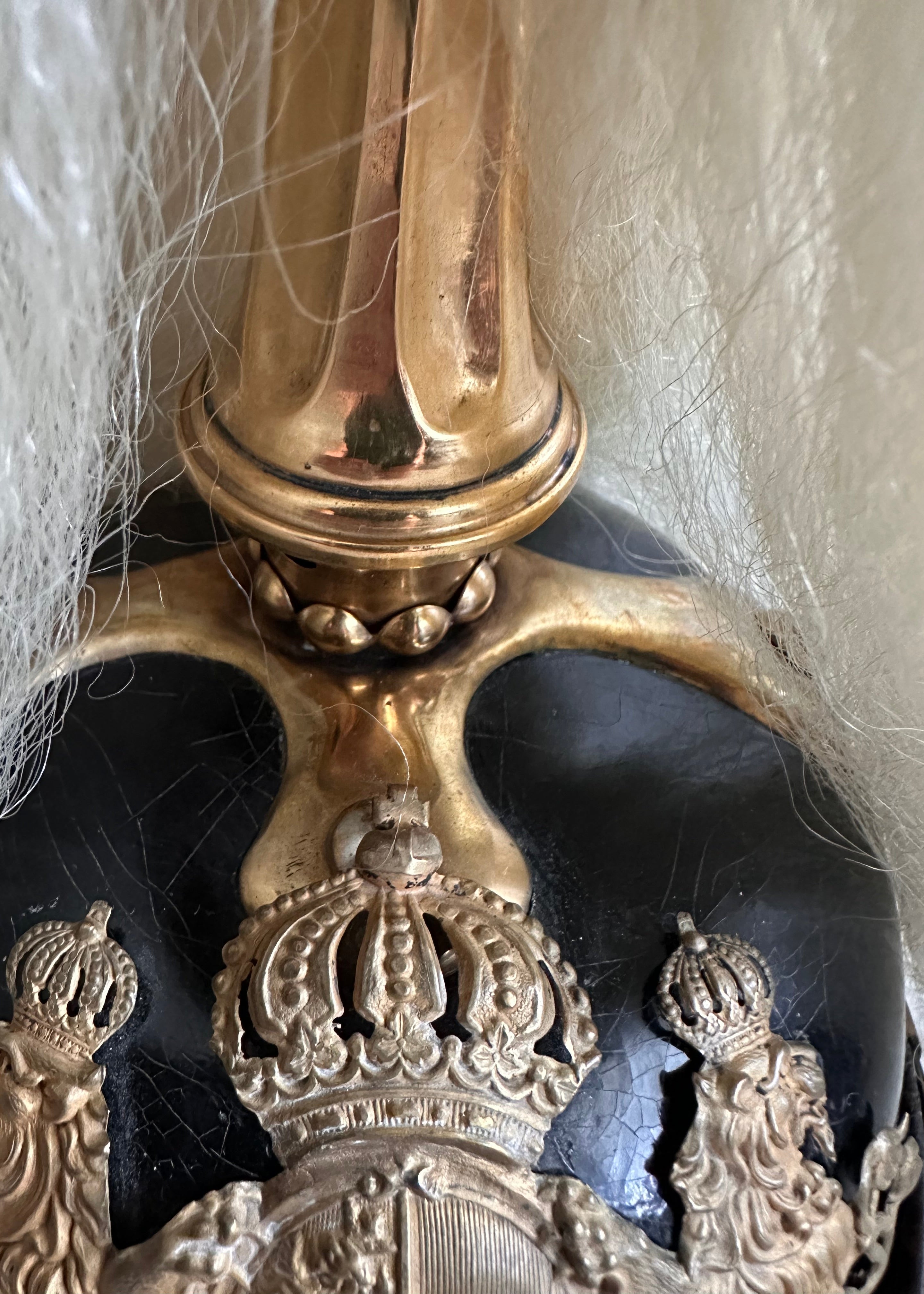 - Key Features: Gilt fittings, fluted trichter with parade socket, removable white horsehair plume, state and Reich cockades, complete liner
