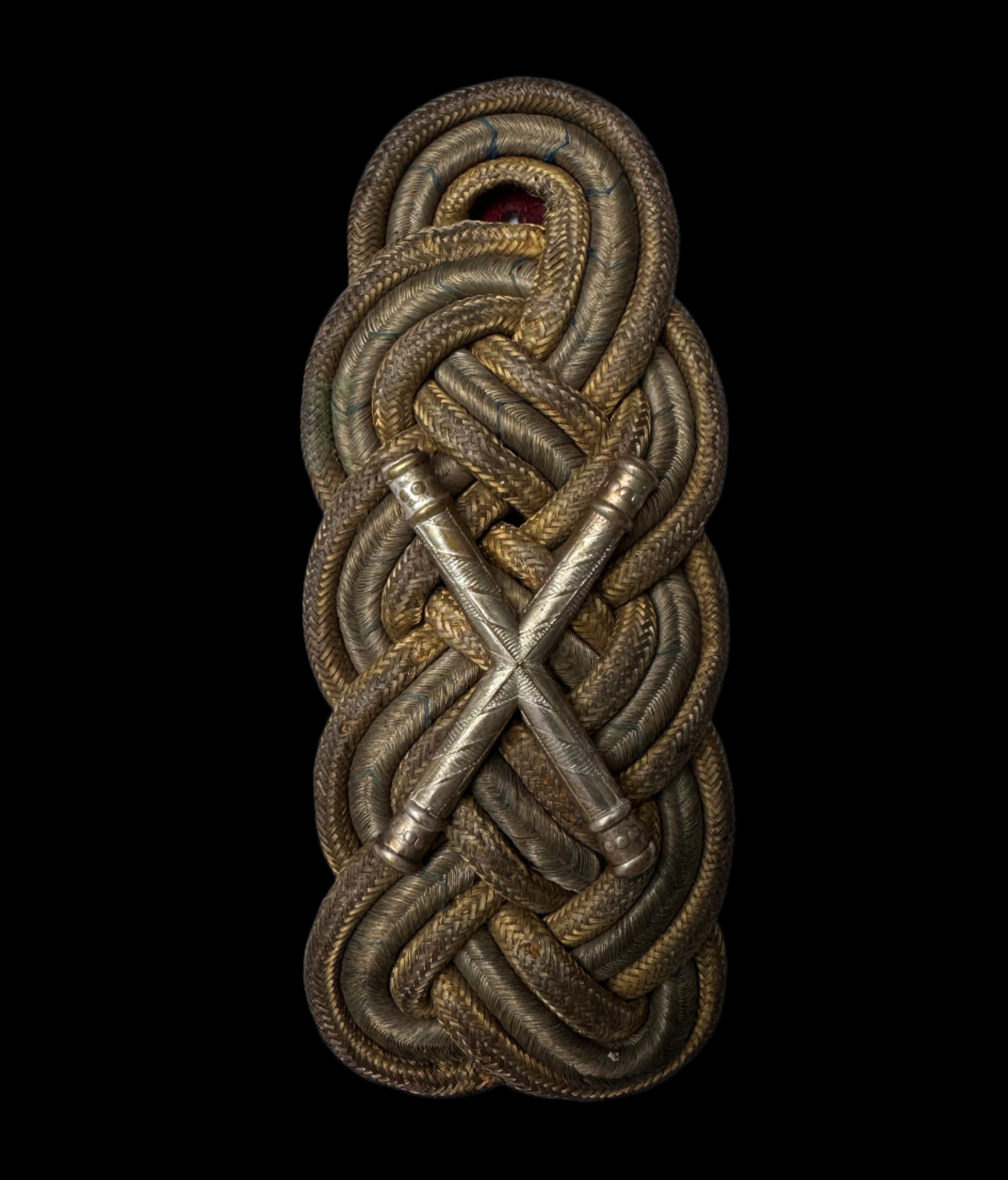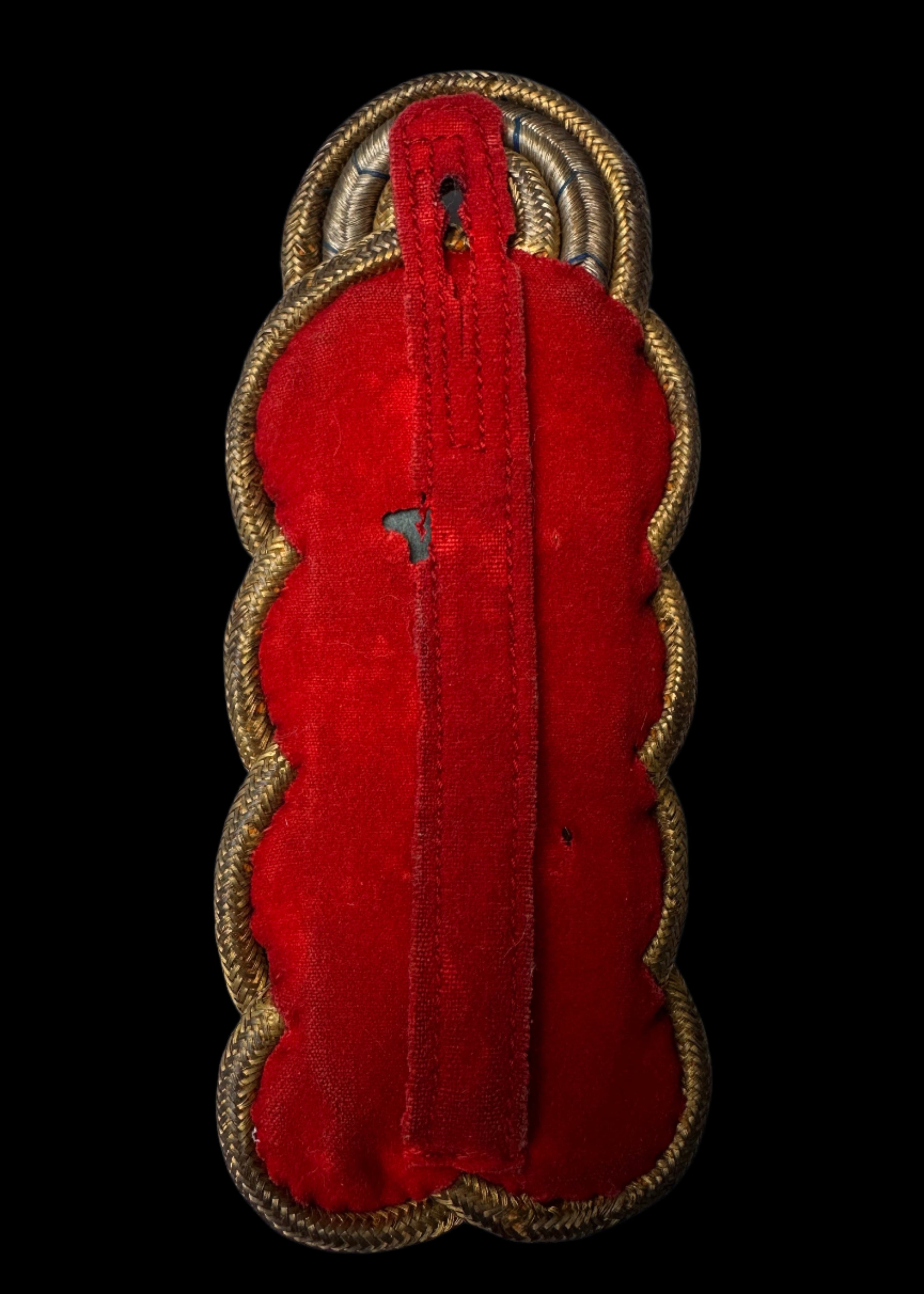 Condition: Very good. The bullion cords are intact and tightly woven, with no unraveling. Patina is even, with rich depth across the surface. The cannon insignia shows age toning but no deformation or looseness. The red velvet reverse is complete, retaining strong color with only minor wear to the tongue and one small pinhole. This piece remains structurally sound and highly displayable.