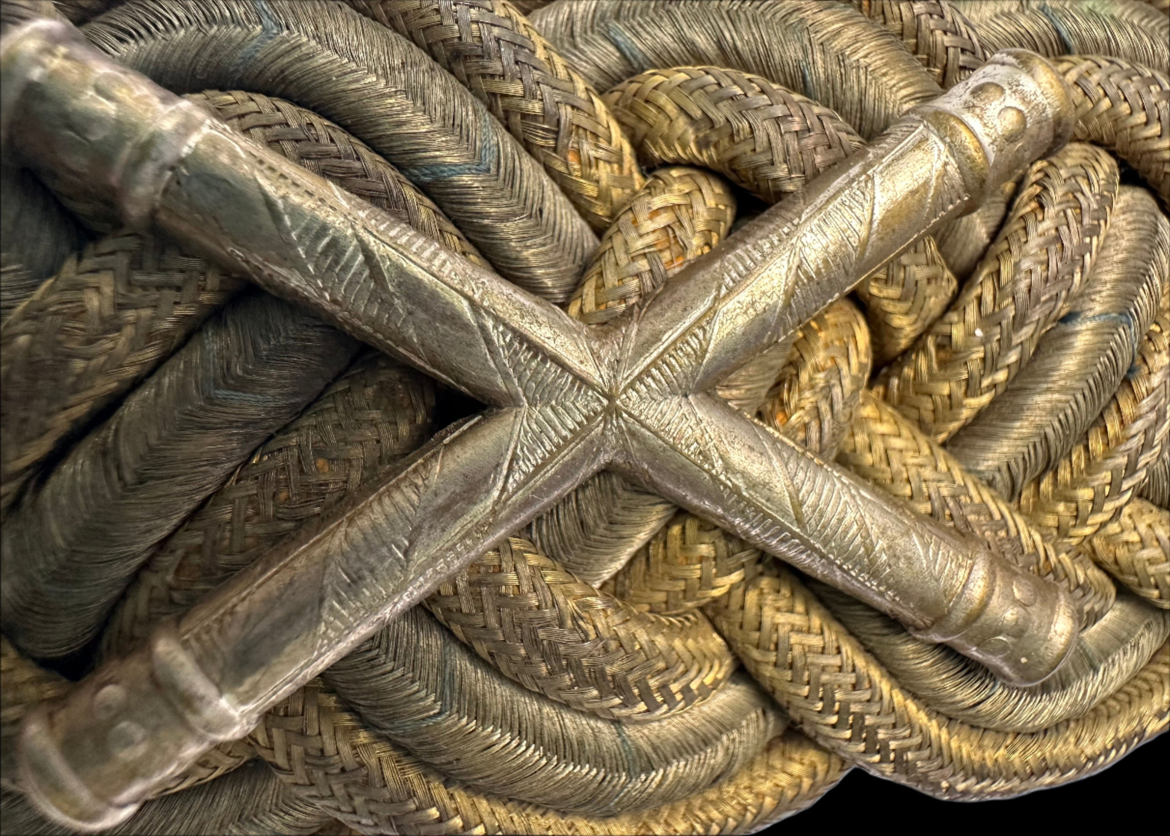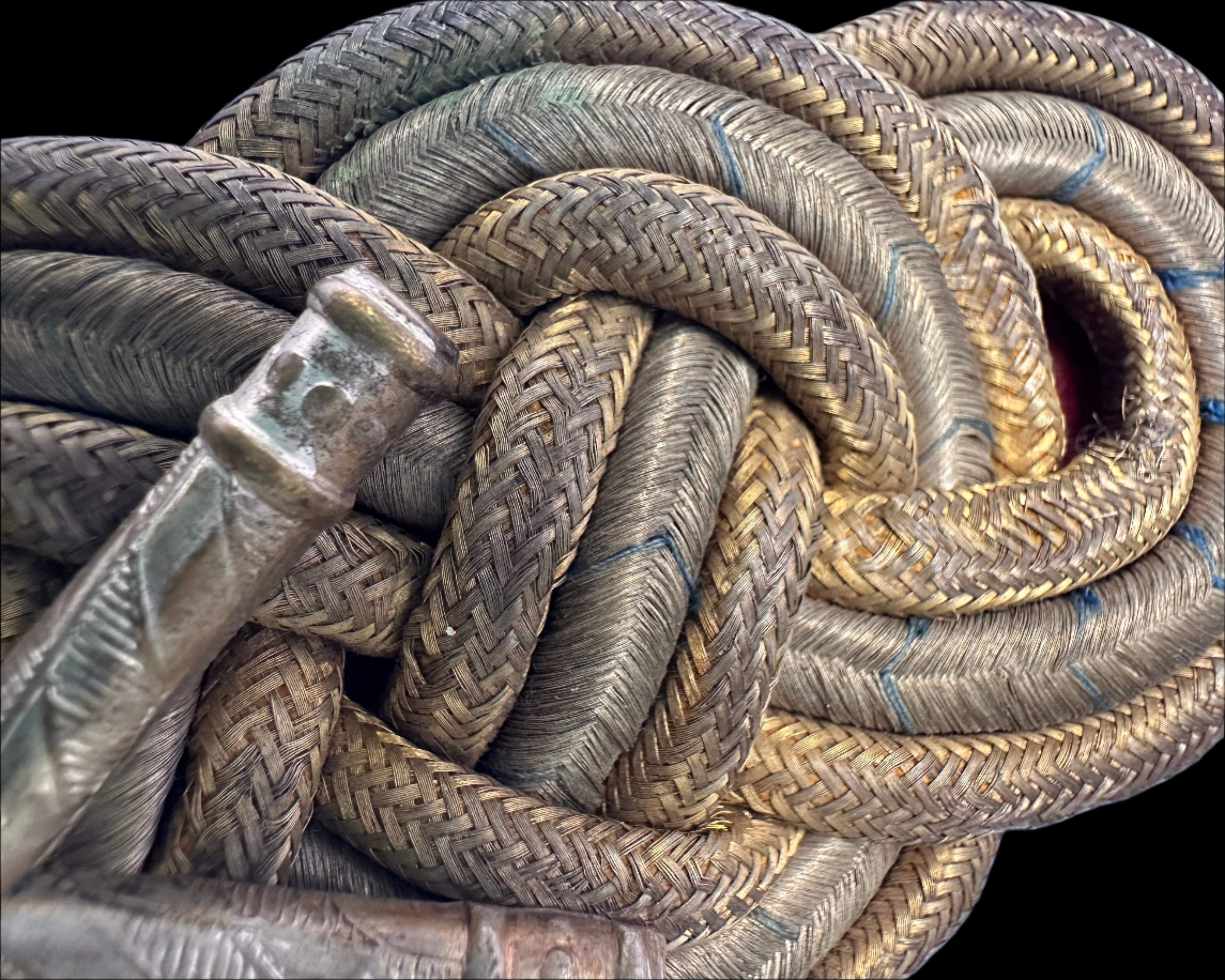 Notably, the bullion exhibits a pronounced patina across both the silver and the gilded threads, and fine wear reveals intermittent hints of greenish oxidation, a natural result of the copper content in metallic thread exposed to moisture over time. The blue threads remain visible yet subtle, tucked within the lower plaits and highlighted under magnification or side lighting.