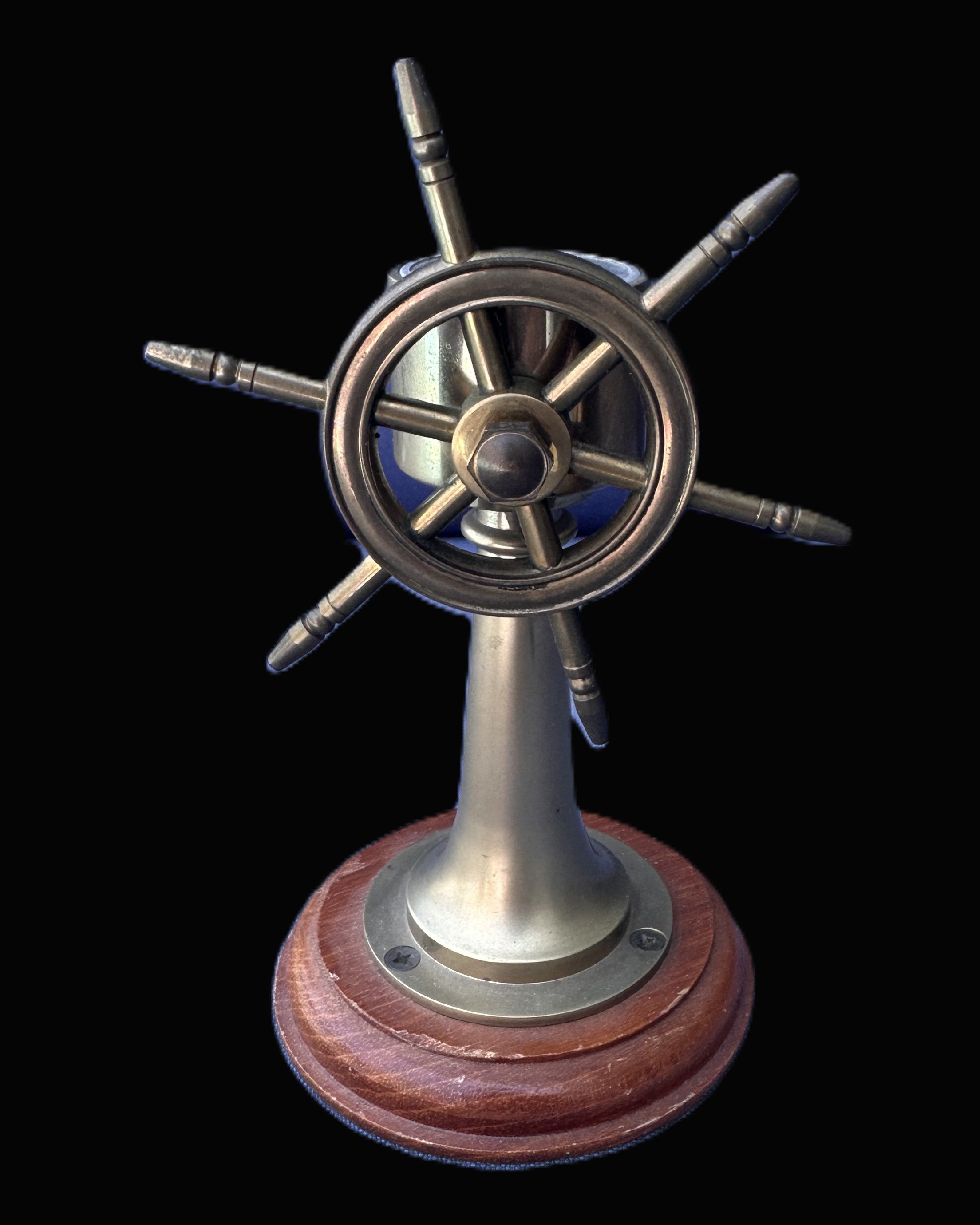 Brass and Wood Nautical Desk Compass with Ship’s Wheel Stand