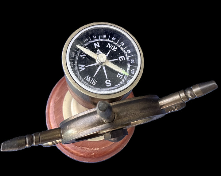 This charming vintage-style desk compass features a rotating brass ship’s wheel mounted on a smooth, flared column and solid wood base. Atop the base sits a functional directional compass, housed in brass with a bold black-and-white dial clearly marked with cardinal points and degree readings. The helm design evokes classic maritime symbolism, making this piece ideal for nautical enthusiasts and collectors alike.