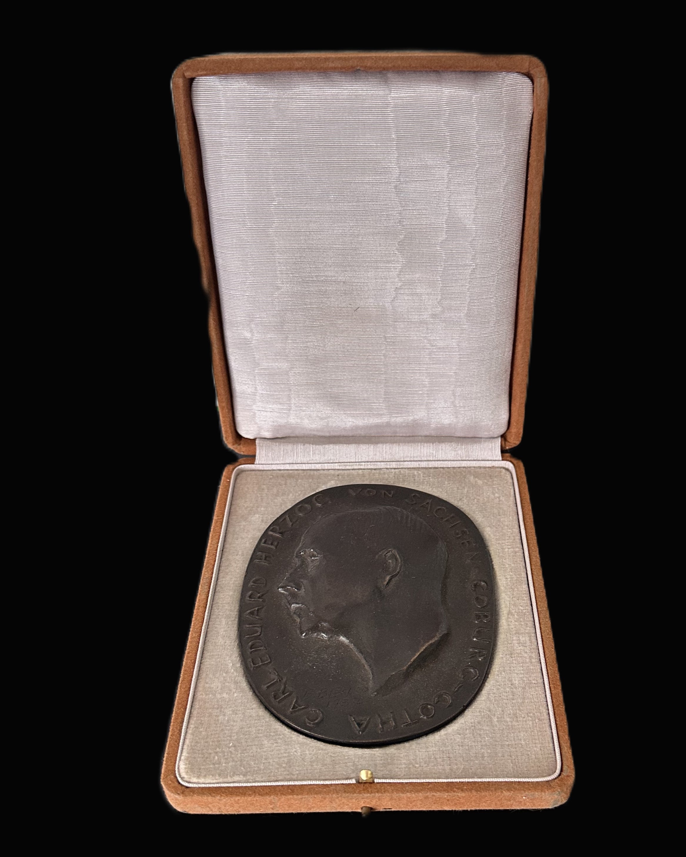 The plaque measures approximately 5 inches × 3.5 inches and weighs 15.3 ounces, cast in dark patinated bronze of superb quality. The obverse presents a right-facing bust of Carl Eduard in high relief, his name encircling the edge: