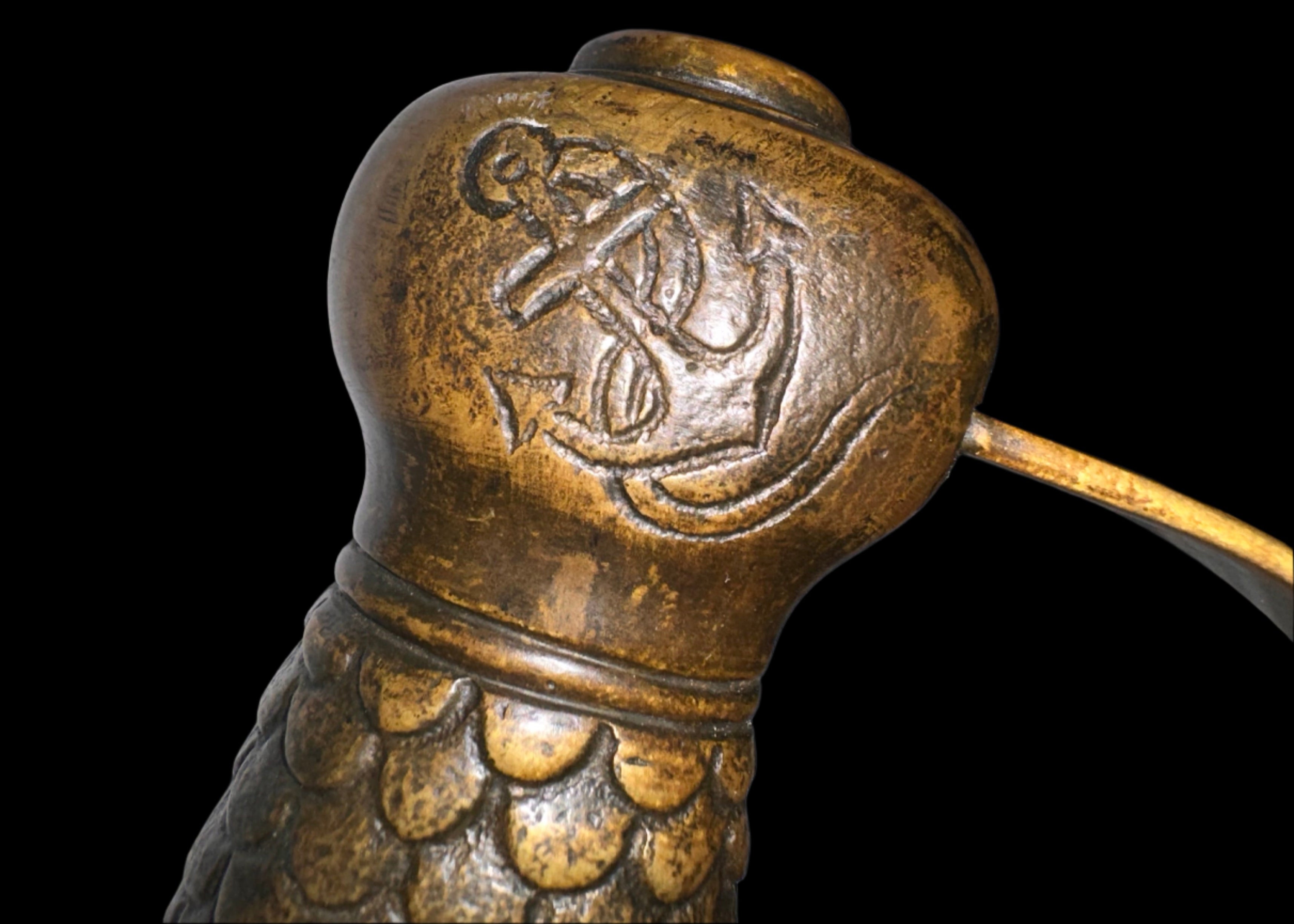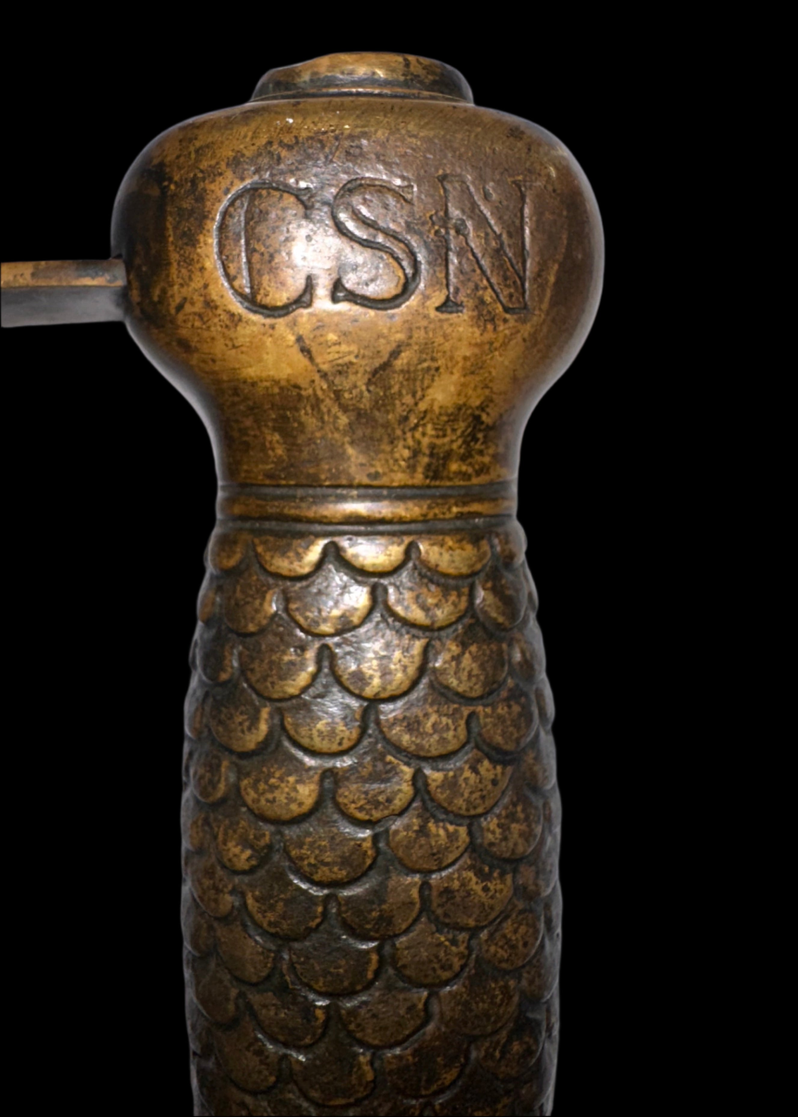 Pommel: Rounded ball-style pommel with prominent raised “CSN” inscription (Confederate States Navy) on one side. The opposite side bears a deeply cast anchor—an iconic naval symbol. These two motifs together leave no doubt as to its intended use and origin.
