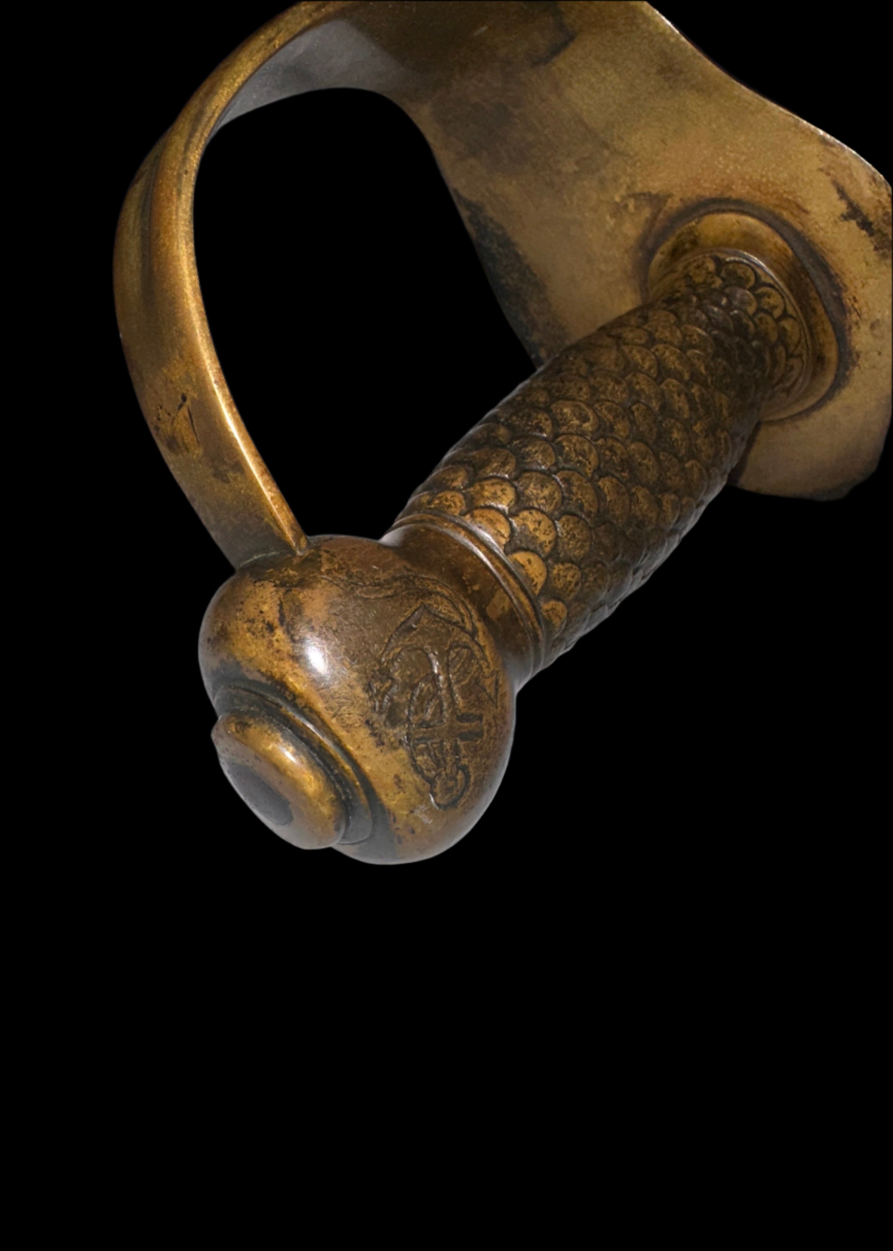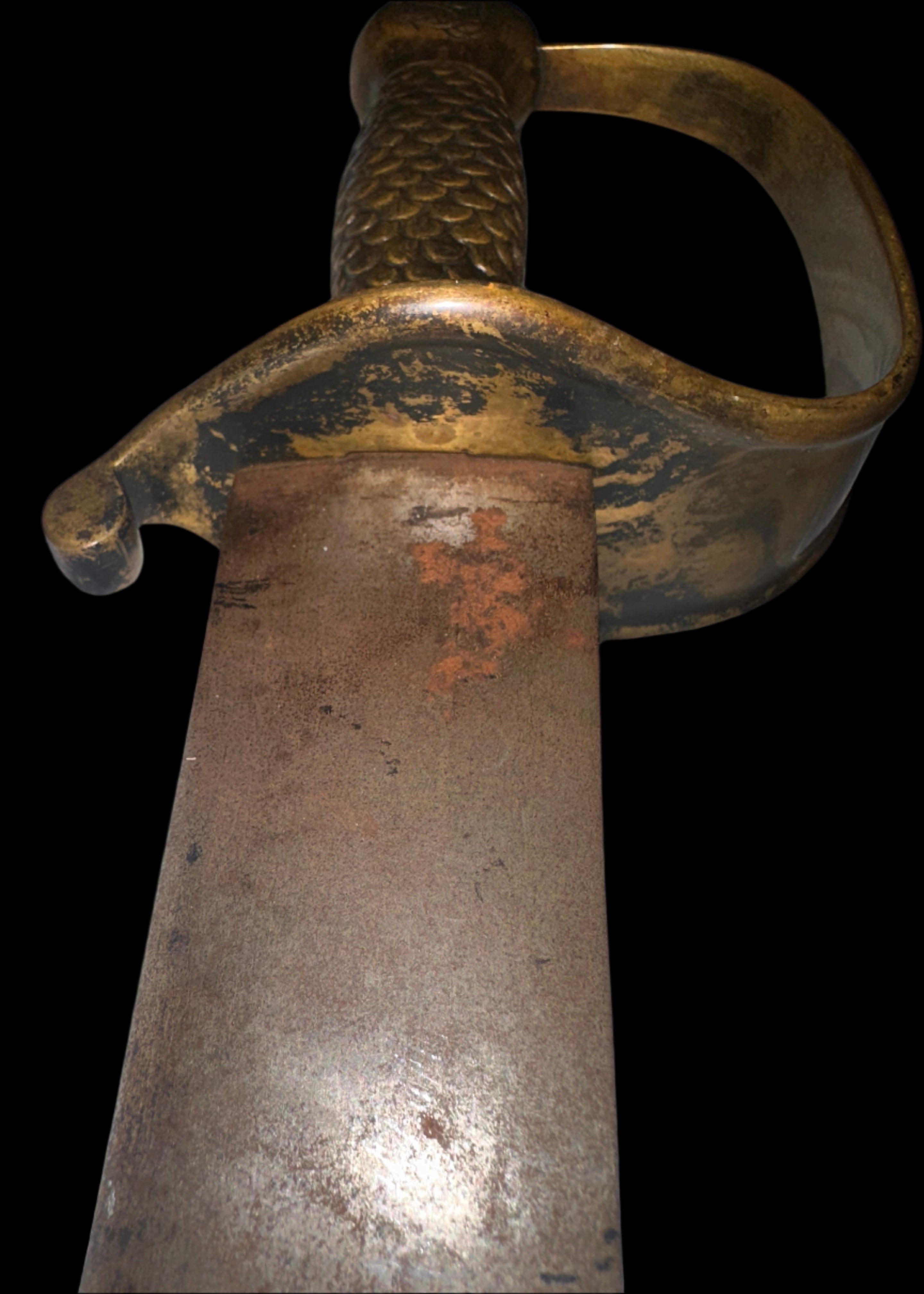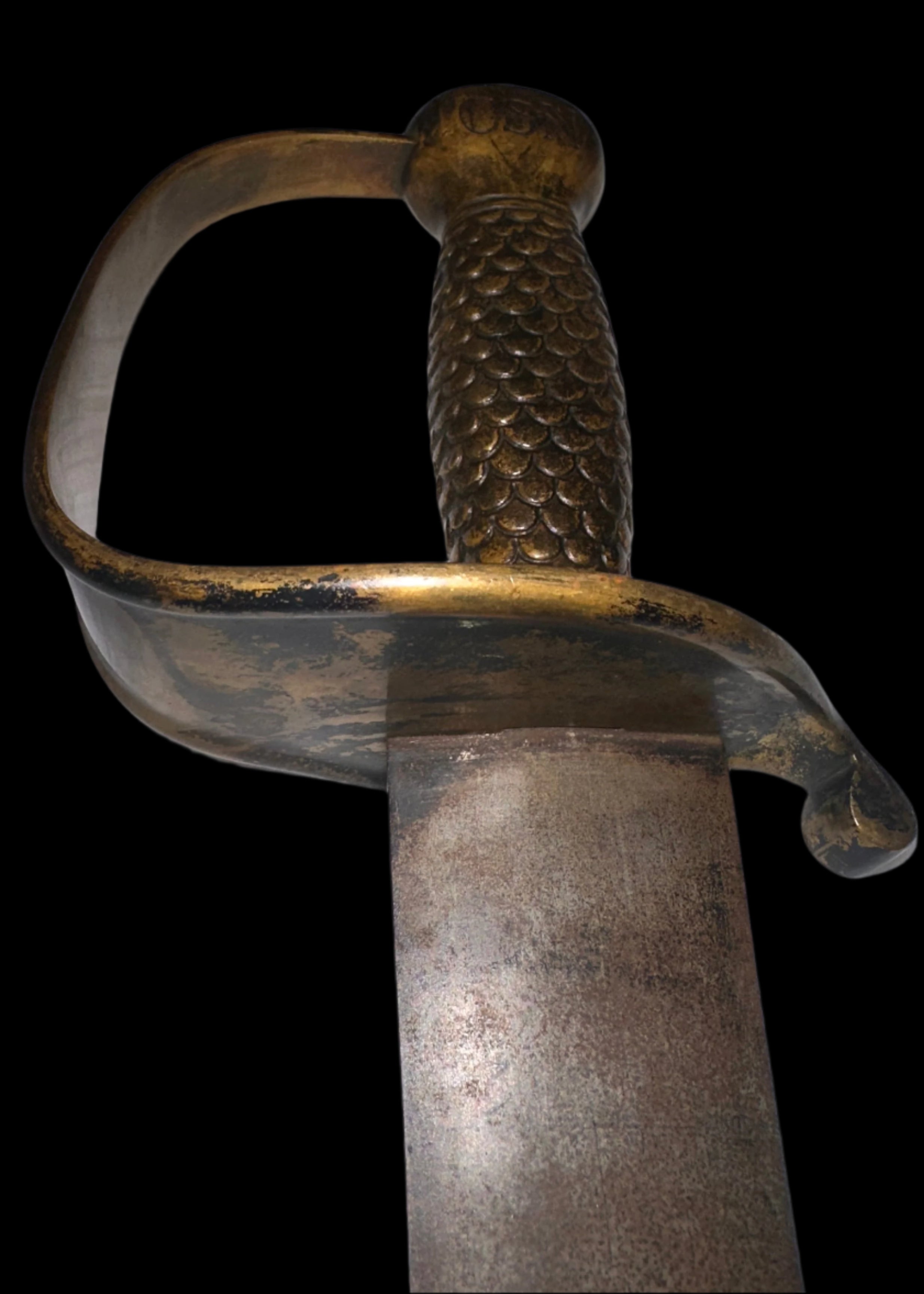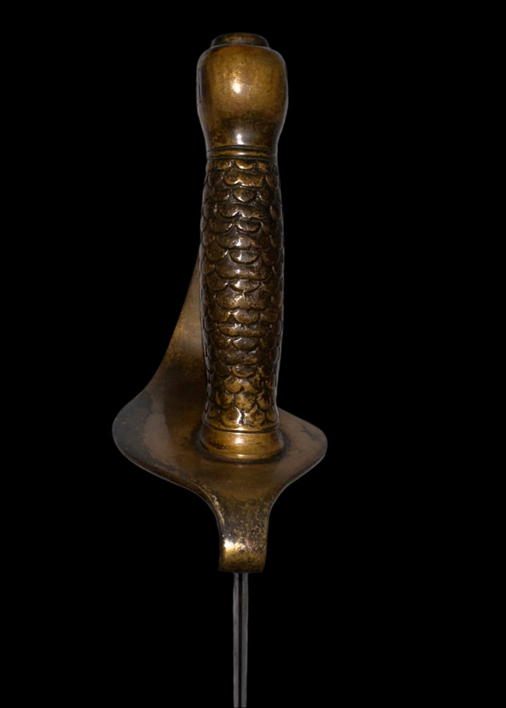 Hilt: One-piece cast brass with full fish-scale grip texture, worn at high points but complete. The brass knuckle bow curves smoothly into a robust counterguard with rolled quillon.
