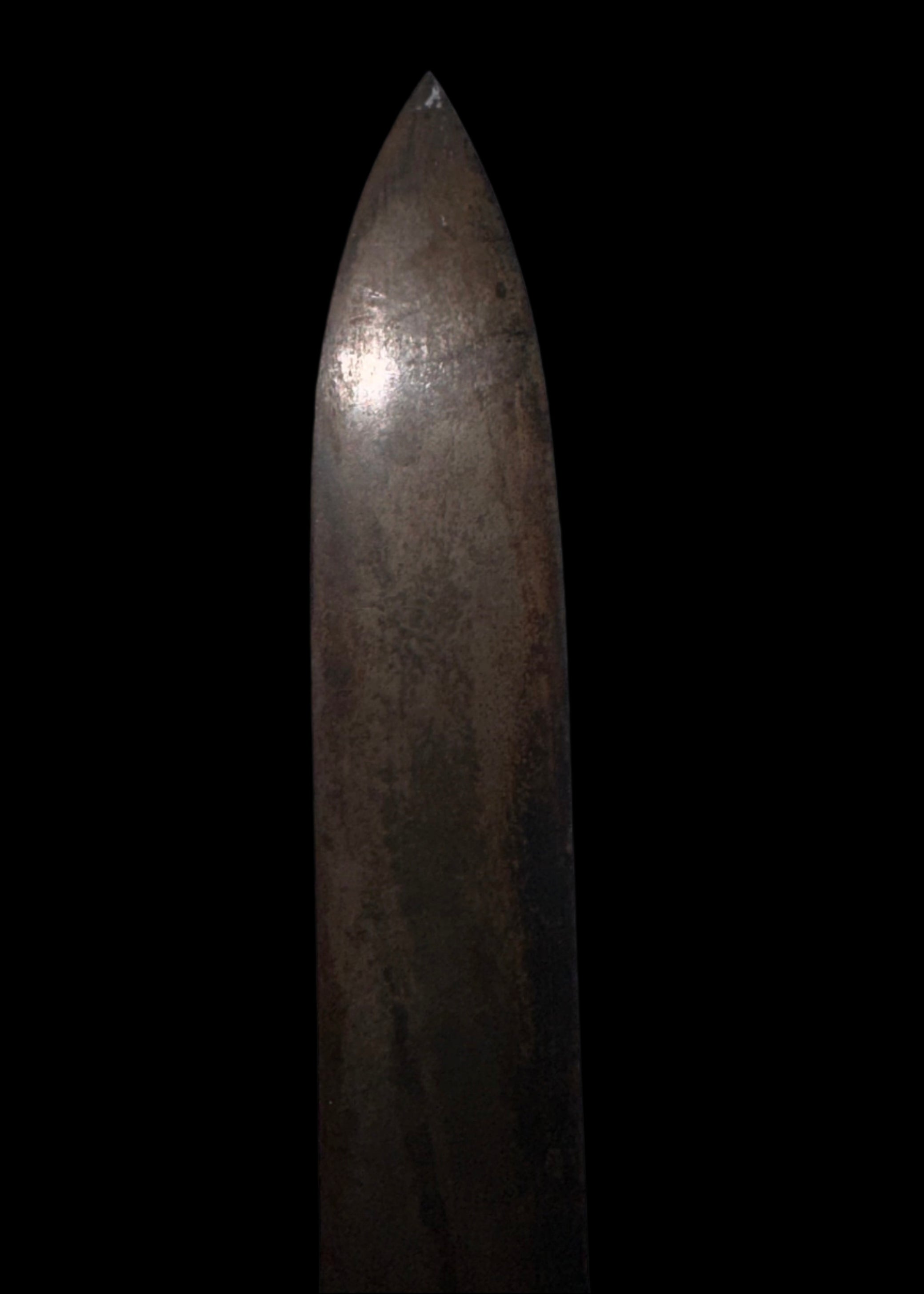 Blade: Heavy and single-edged, with a broad flat profile and no fullers. The tip is slightly rounded, with darkened steel showing uniform age patina, mild pitting, and areas of oxidation—consistent with 160+ years of exposure.