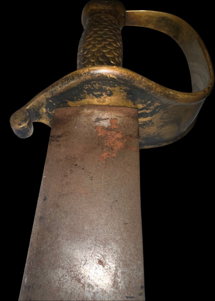 This is a rare Confederate States Navy (CSN) naval cutlass from the American Civil War, an exceptionally hard-to-find edged weapon tied directly to the maritime arm of the Confederacy. This heavy, brass-hilted cutlass bears the highly desirable “CSN” marking engraved into the pommel, clearly linking it to naval use under the Confederate banner. Pieces such as this are increasingly scarce and prized in advanced Civil War collections for their historic provenance and symbolism.
