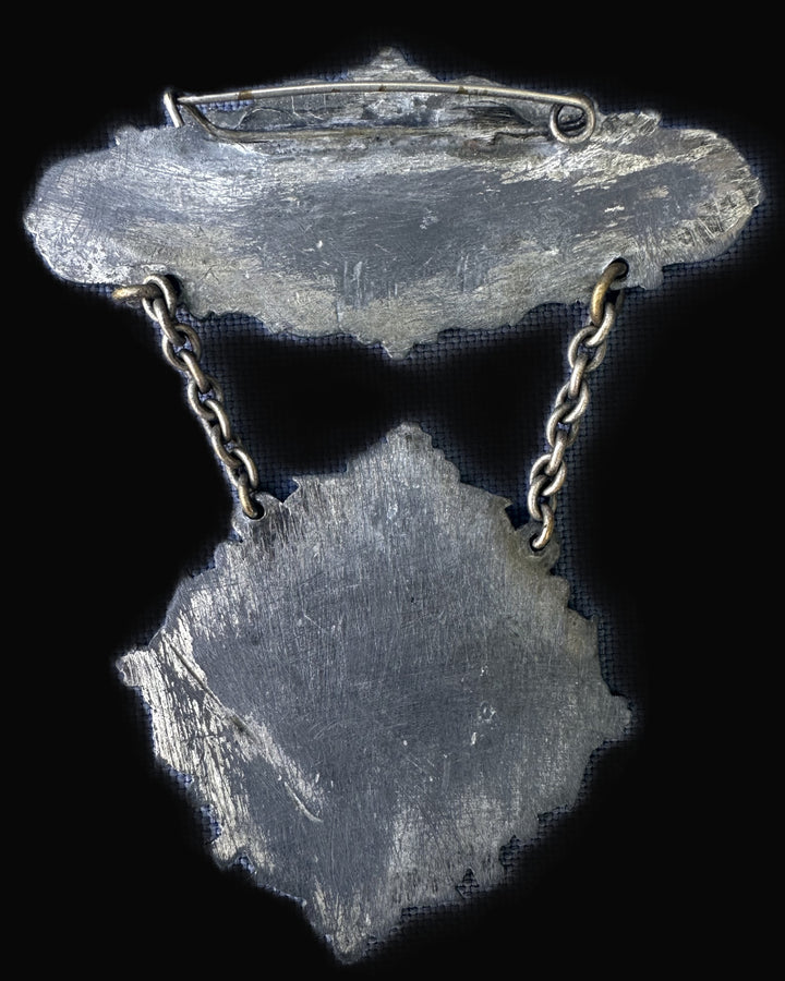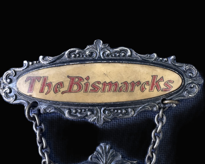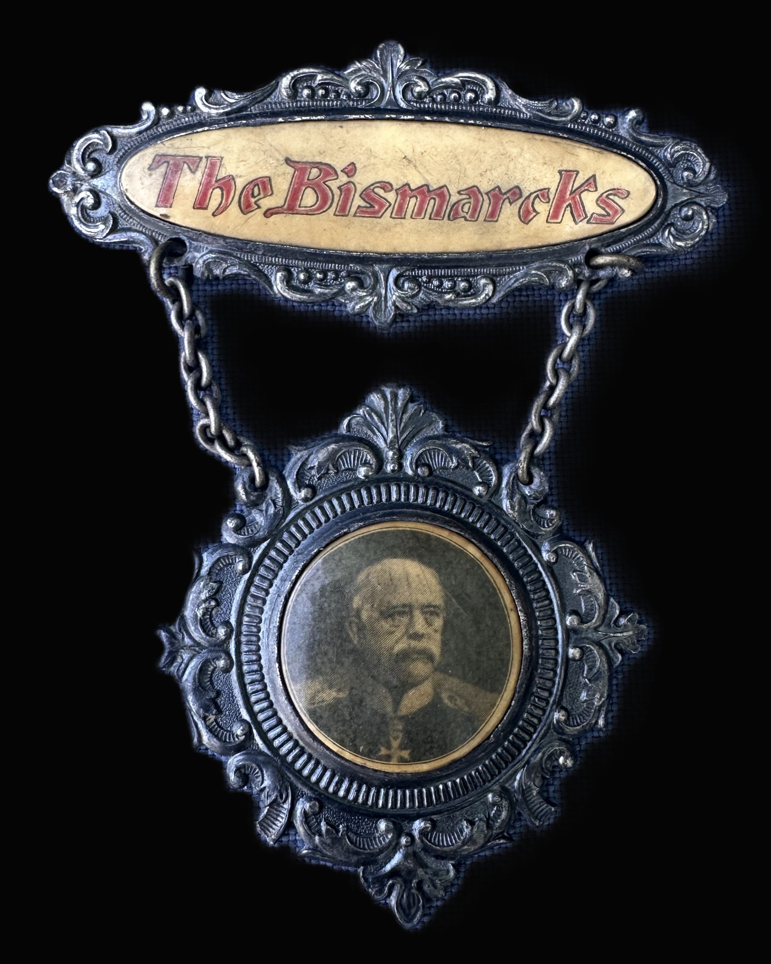 This rare decorative badge features a finely cast two-part design joined by chain links, centered around a photographic portrait of Otto von Bismarck—Germany’s famed “Iron Chancellor.” The upper bar, marked in bold red Gothic-style font, reads “The Bismarcks,” set against an aged, parchment-toned enamel background bordered in an ornate metal frame with Rococo-inspired flourishes.