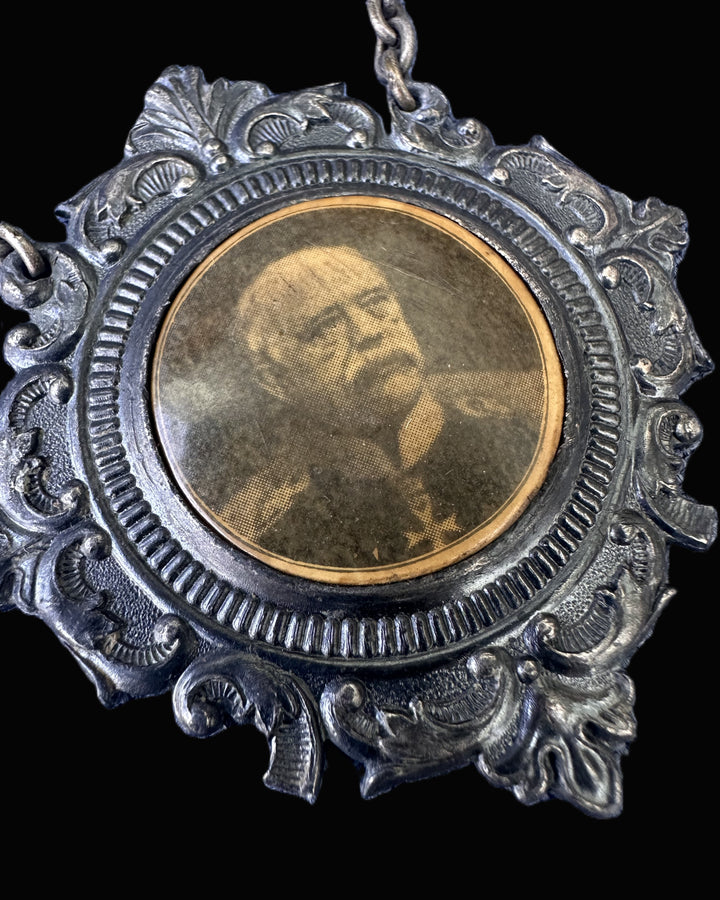 Suspended from this bar is the circular medallion housing Bismarck’s photographic likeness in uniform, most likely taken from a cabinet card portrait. The portrait is framed by a filigree-style medallion adorned with scrollwork, evoking the heraldic and Victorian sensibilities of the late 19th to early 20th century.