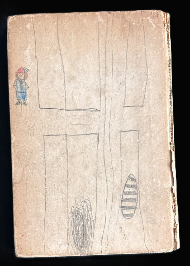 Physically, the book is complete and intact. The paper covers show pronounced wartime handling wear, including edge chipping, surface soiling, creasing, and spine stress consistent with field or pocket use. The spine remains present but shows fragility at the edges. Interior pages are complete, with moderate age toning and scattered foxing. Several pages show pencil doodles and period childlike sketches on the rear cover and end areas, almost certainly added during the book’s early life. These drawings are period and contribute to the artifact’s lived-in character rather than detracting from originality.