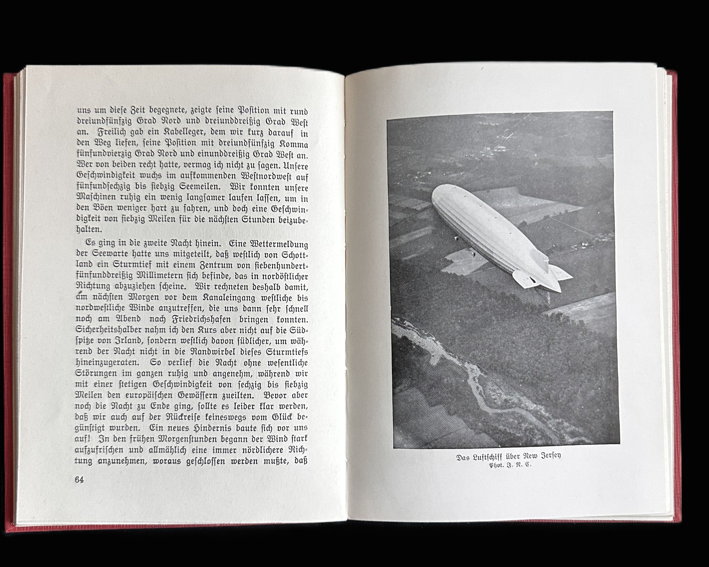 The contents include narrative chapters detailing the planning, execution, navigation, meteorological challenges, and international reception of the Graf Zeppelin’s America voyage, as well as reflections on the broader future of airship travel. The book contains numerous black-and-white photographic illustrations taken from on-board cameras and ground-based documentation, including aerial views of the Graf Zeppelin in flight and images captured over the United States. One illustrated page captioned “Das Luftschiff über New Jersey” (“The airship over New Jersey”) is shown and remains sharp and well printed.