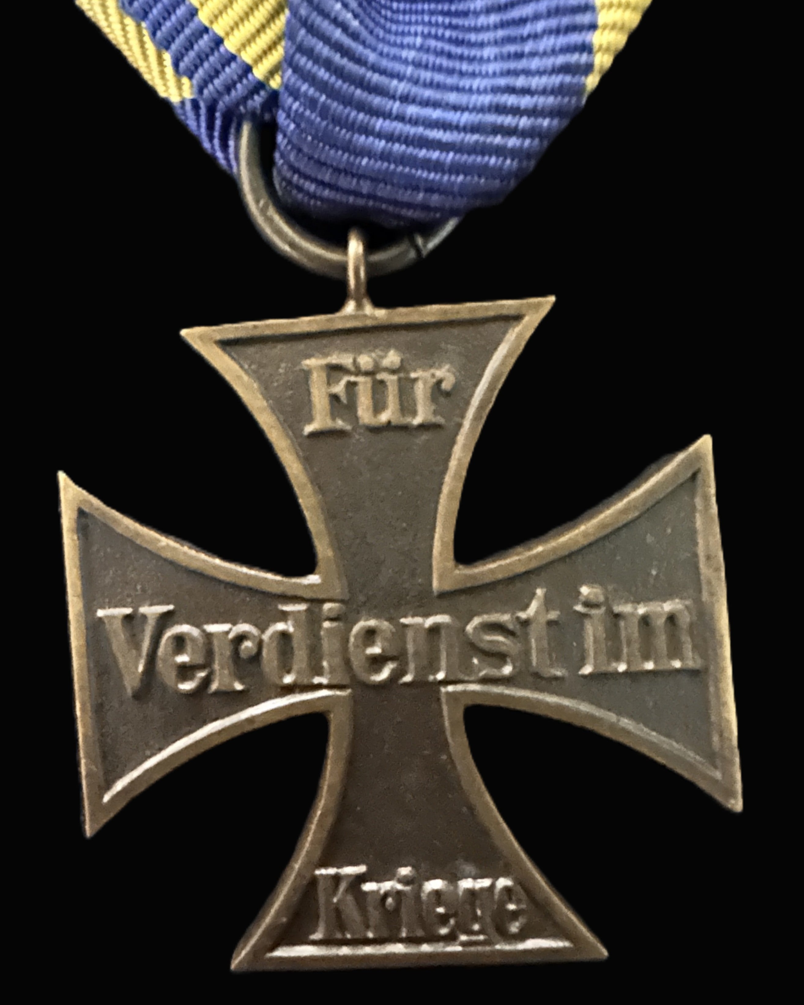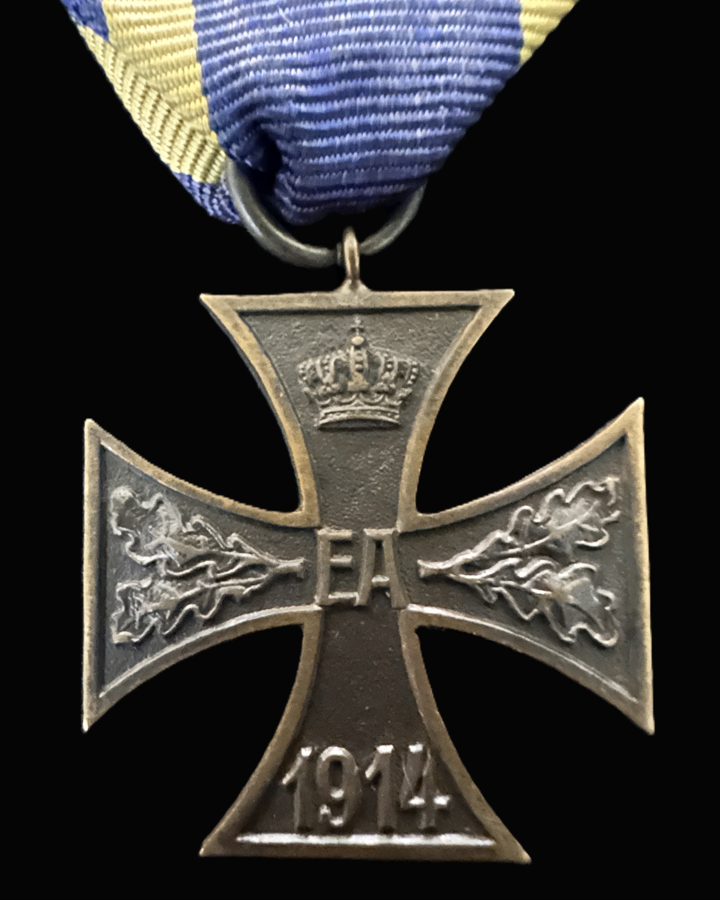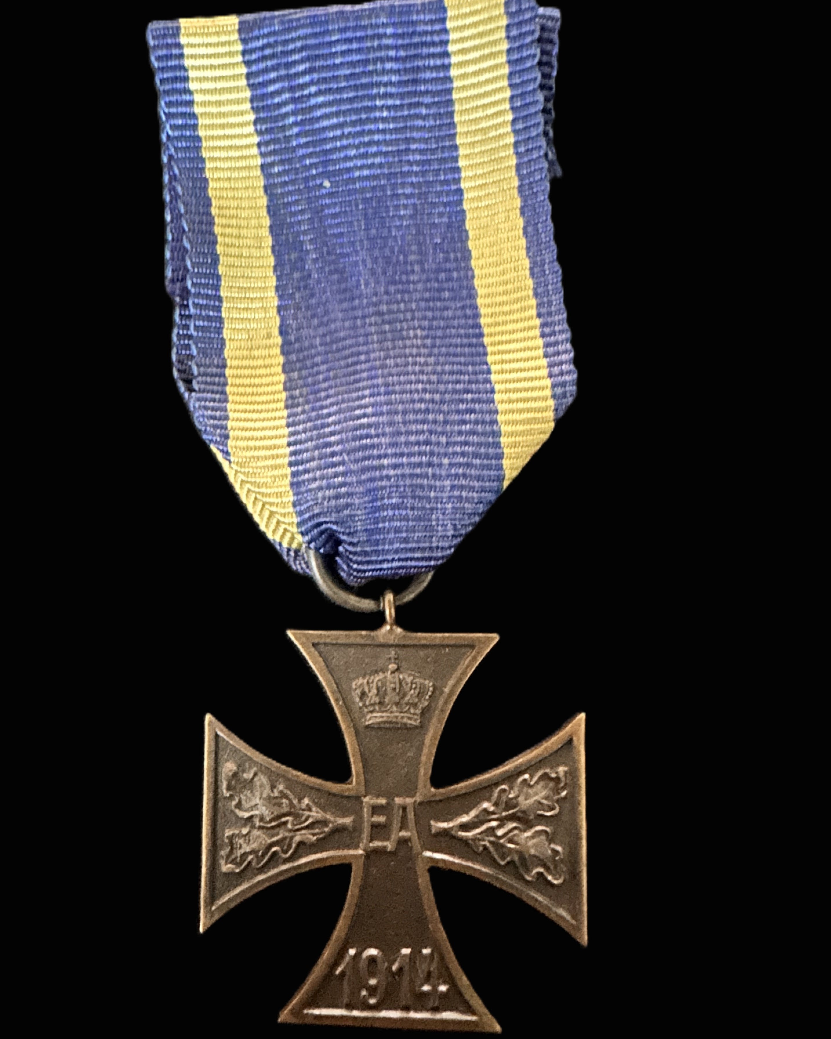 This example is the non-combatant version, indicated by its original blue ribbon with two wide yellow edge stripes. The bronze Maltese cross displays on the obverse a central crowned "FA" (for Friedrich Anhalt) flanked by oak leaves, with the date "1914" on the lower arm. The reverse is inscribed Für Verdienst im Kriege (“For Merit in War”).