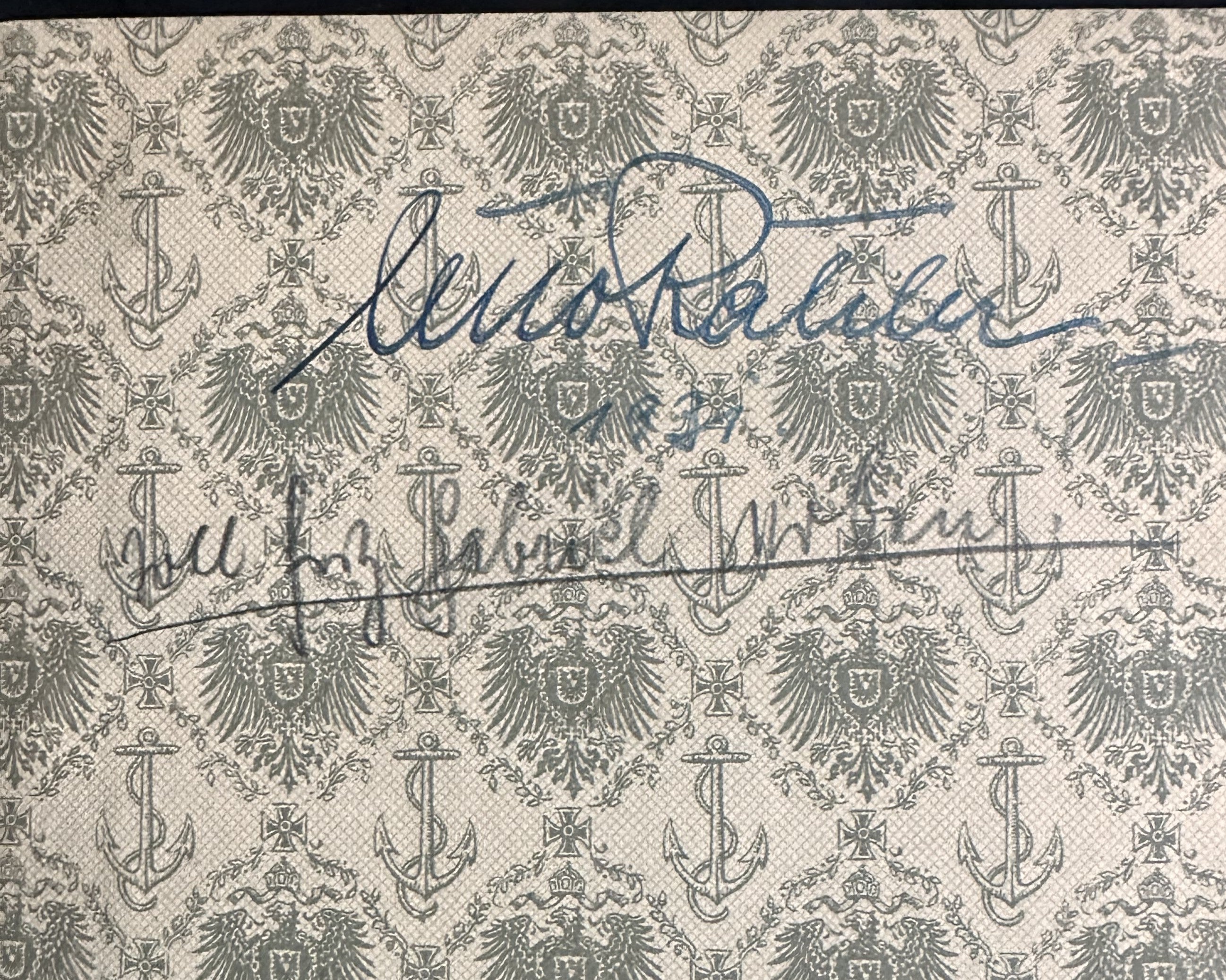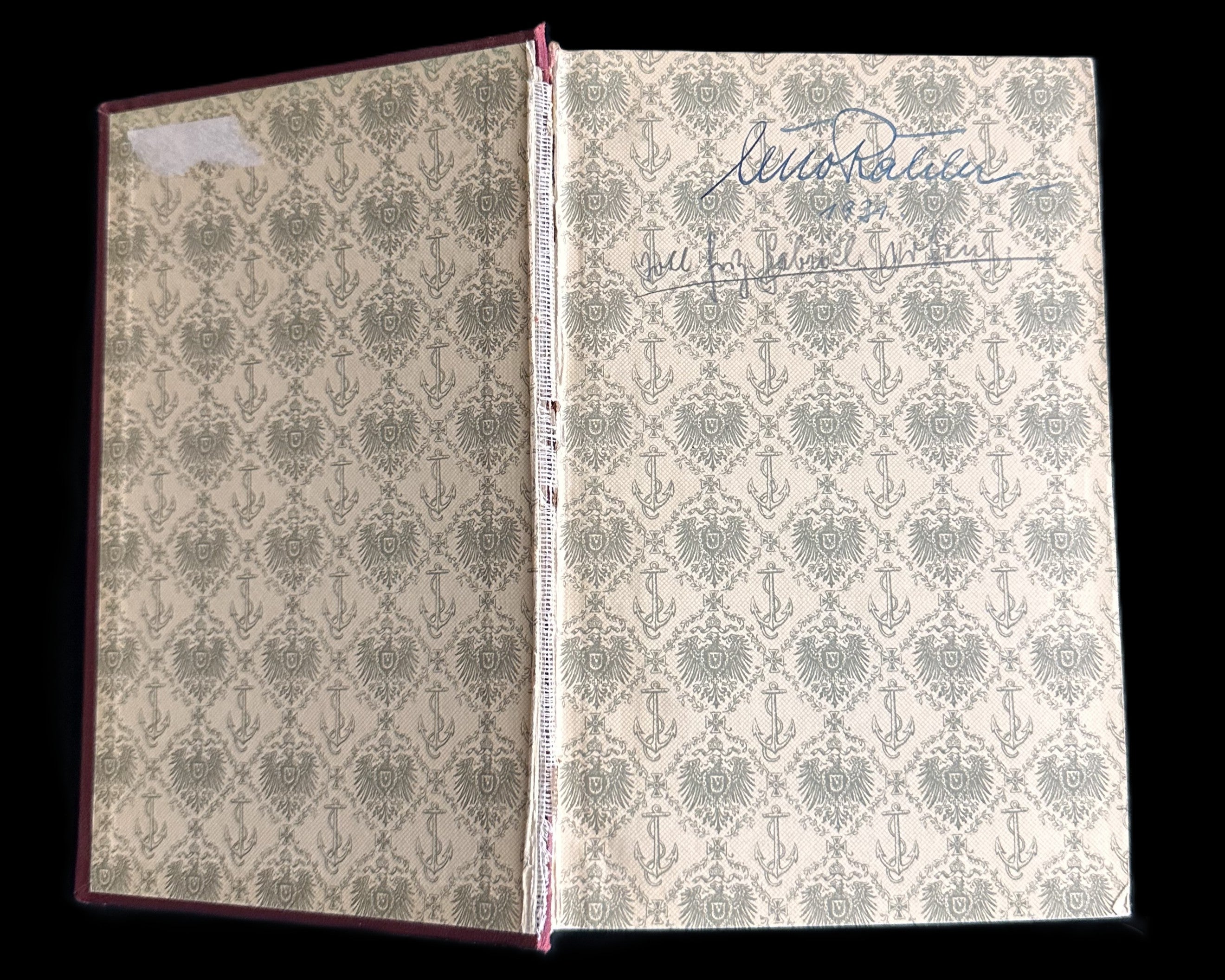 The interior retains its original patterned endpapers decorated with repeating Imperial eagles and naval anchors. Visible handwritten ink inscriptions are present on the front endpaper, consisting of a personal name and notation; these are period additions and not part of the original publication. The title page confirms publication in Berlin, 1930, with printing by Thormann & Goetsch, Berlin SW 48, Besselstraße 17. All text is in German.