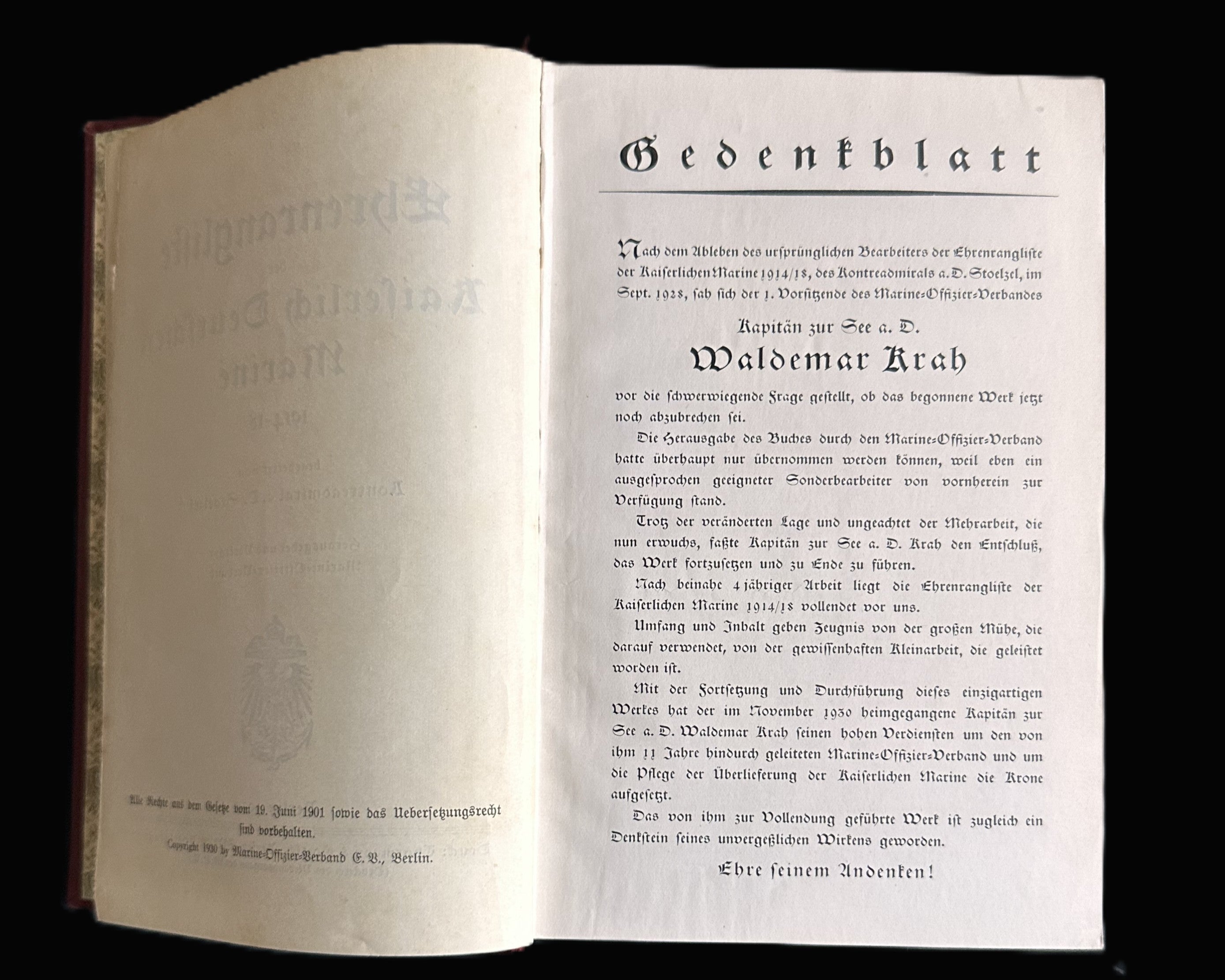 The volume was originally compiled by Konteradmiral a. D. Stoelzel (Retired Rear Admiral Stoelzel). After his death in September 1928, the continuation and completion of the work was undertaken by Kapitän zur See a. D. Waldemar Krah (Retired Captain at Sea), as explained in the printed Gedenkblatt (Memorial Page). The foreword (Vorwort) clearly states the purpose of the book: to honor fallen naval comrades, preserve the service records of the Imperial Navy, and provide an official historical accounting of the Kaiserliche Marine in the aftermath of the war and the collapse of the Empire.