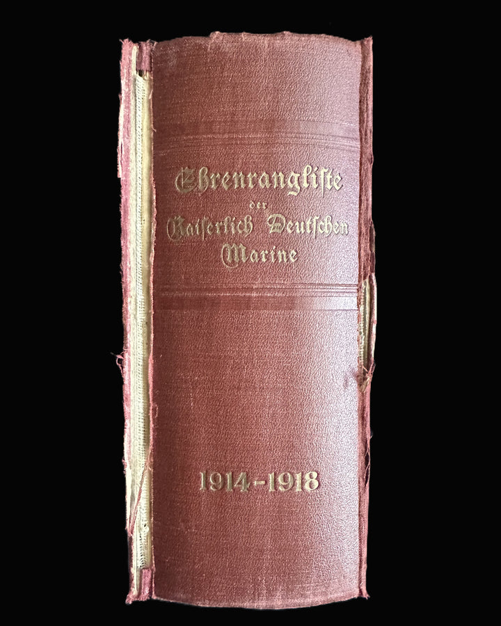 This example is bound in its original red cloth boards with gilt-stamped title on the front cover and spine. The front cover bears the Imperial naval eagle in gilt. The spine reads Ehrenrangliste der Kaiserlich Deutschen Marine 1914–1918. The binding is complete but shows notable period wear, including fraying and loss along the spine edges, softened corners, surface rubbing, and cloth thinning consistent with heavy reference use. The spine remains present but exhibits splitting and exposed inner material at the joints.