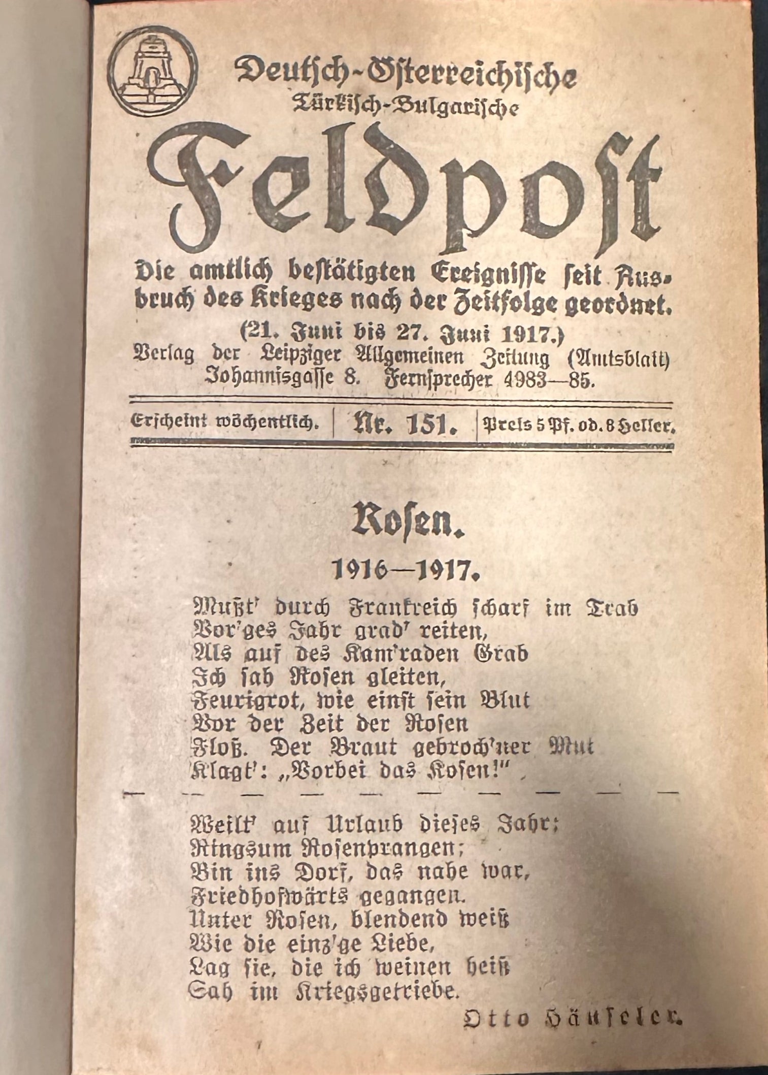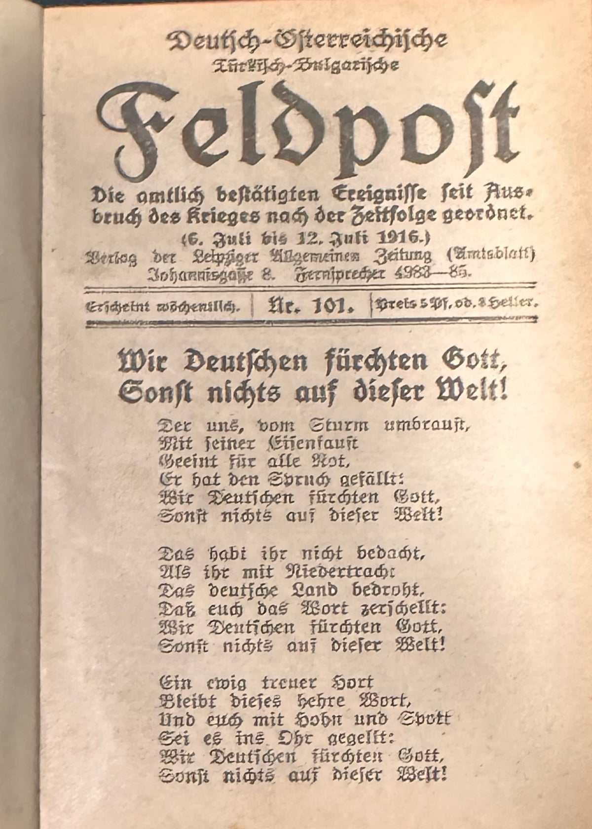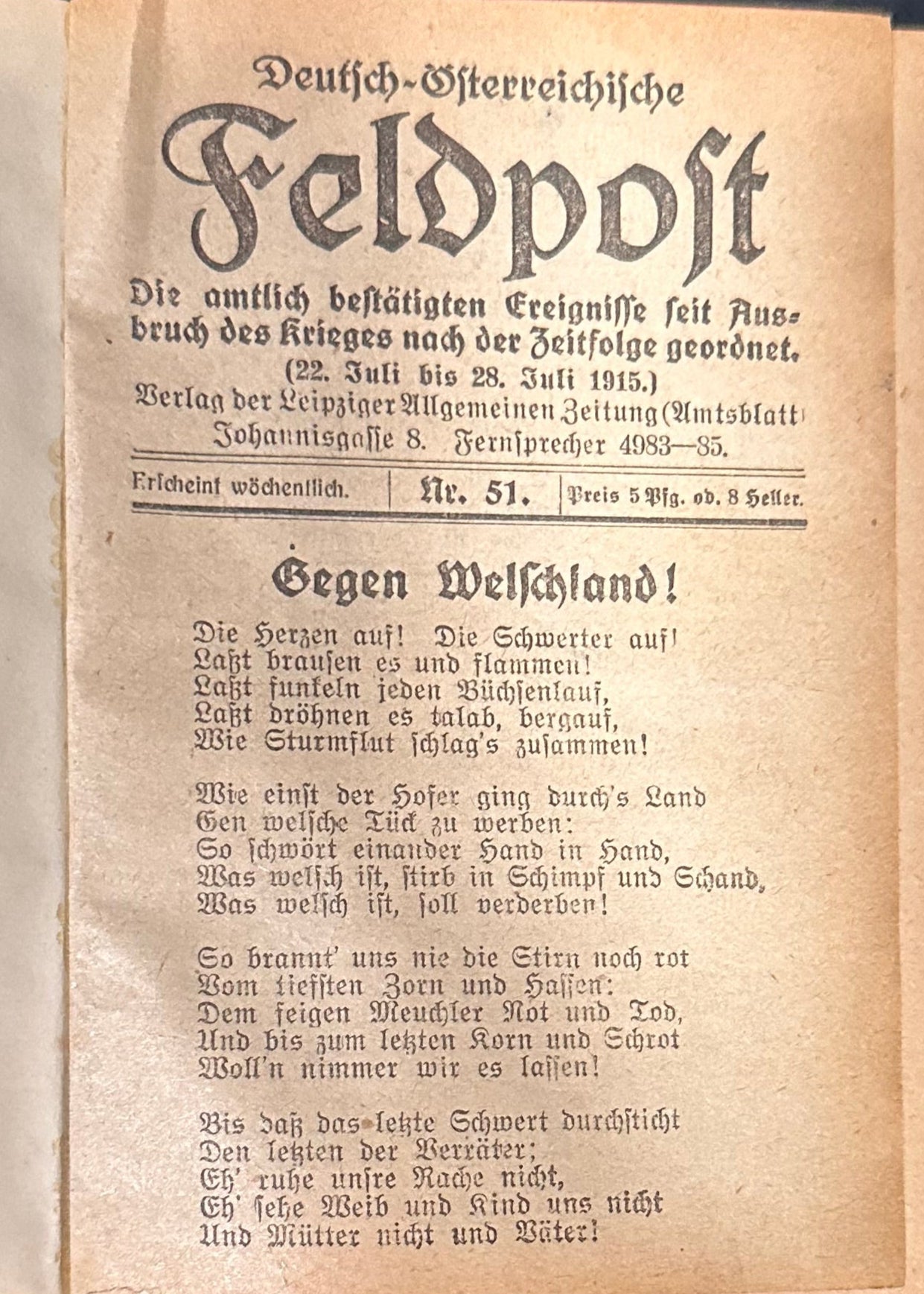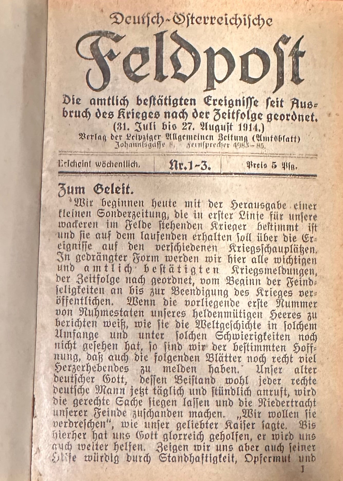 Published by the Leipziger Allgemeine Zeitung, each issue offers contemporary military news, frontline updates, and war-related developments from the Austro-Hungarian and German fronts. The series served both as a propaganda tool and a means of communicating the evolving war effort to soldiers and civilians. The issues are densely printed in Gothic typeface and occasionally include patriotic poetry and editorials. The first issue begins with the solemn announcement of war and a call to arms; subsequent issues track campaigns in France, Belgium, Russia, the Balkans, and beyond.