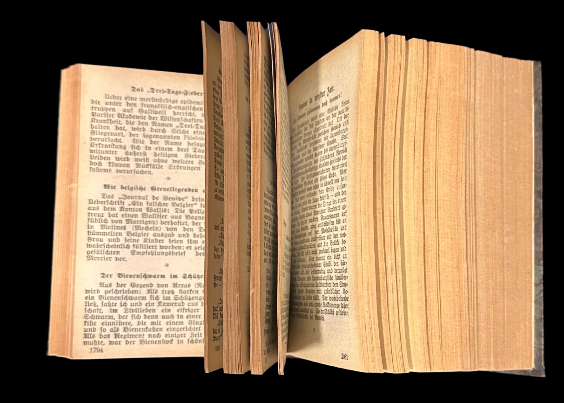 Each volume opens with its first issue's original title page and contains hundreds of individual leaflets bound sequentially. Page edges show mild toning typical of war-era paper. The Gothic Fraktur print is sharp and legible throughout. Marbled boards remain intact with some shelf wear and spotting consistent with age. Volume IV shows slight fraying to the upper spine edge.