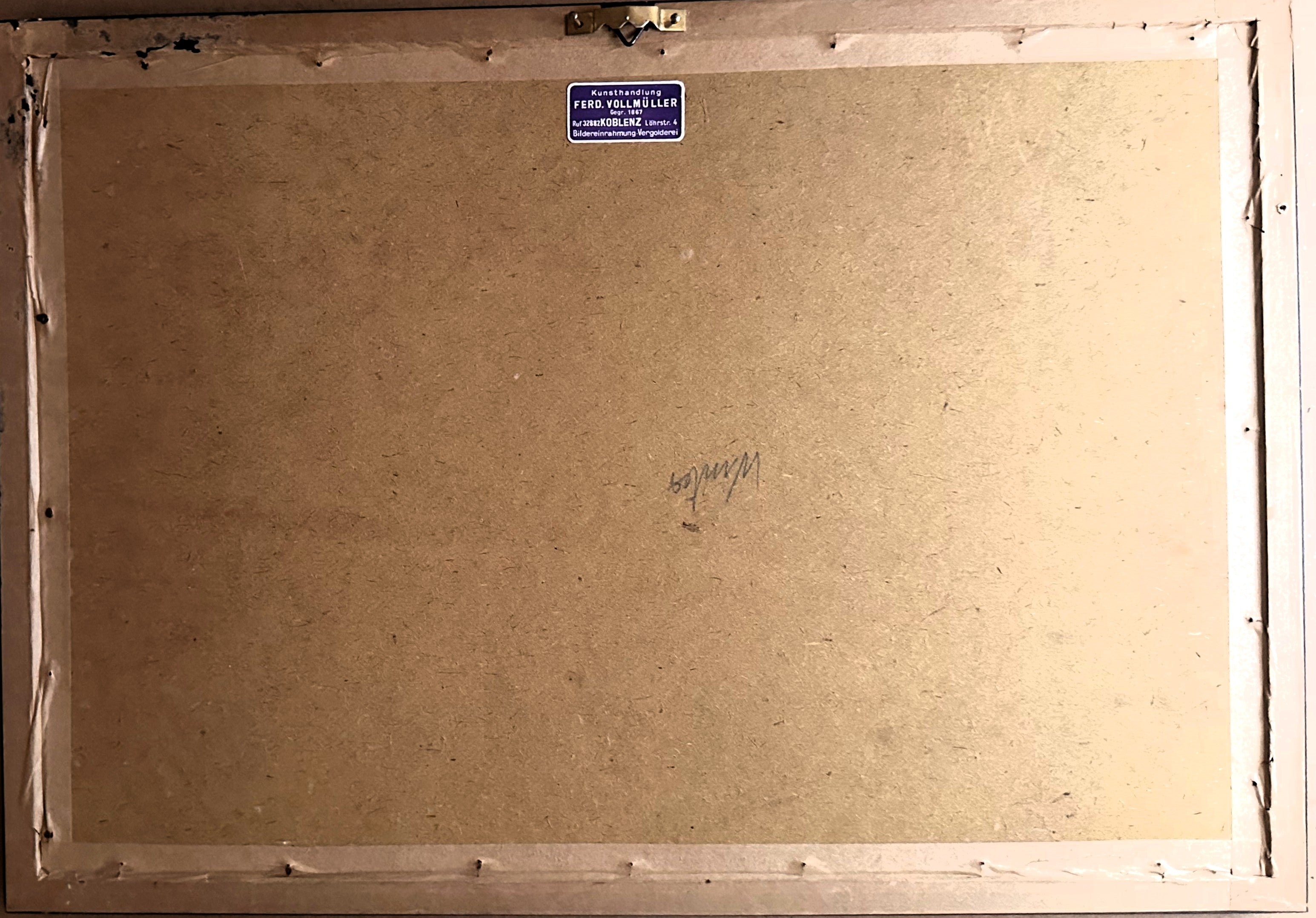 What sets this piece apart is its unique metallic-textured surface, giving the grayscale image a subtle reflective quality that enhances depth and shadow, almost like a woven tapestry or metal engraving. Close inspection reveals an intricate texture consistent with mid-20th-century metallic-foil print techniques, possibly manufactured in Germany. The back is labeled by Kunsthandlung Ferd. Vollmüller of Koblenz, a respected framing and gallery service, indicating professional archival mounting.