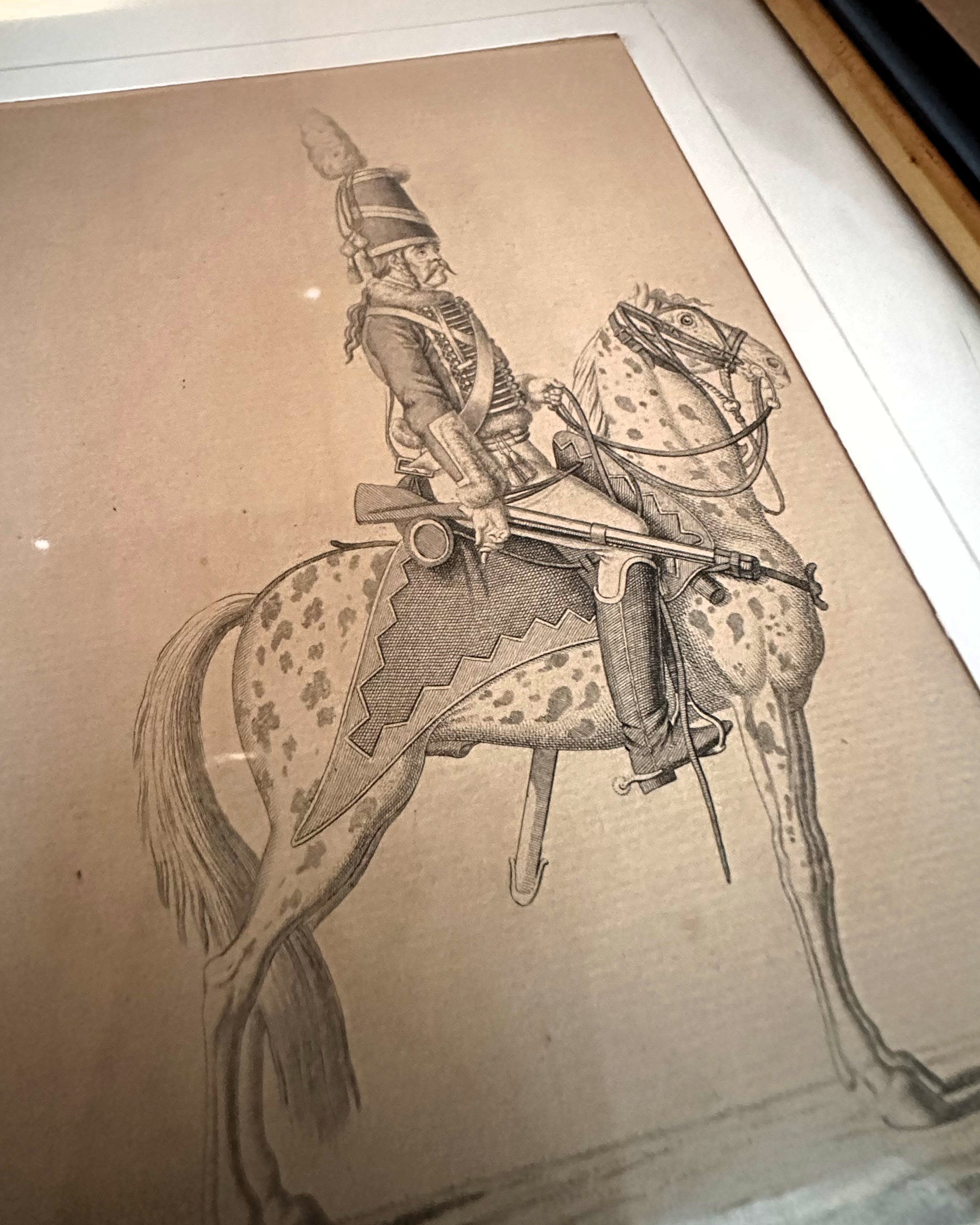 Framed pencil or lithograph-style portrait of a German cavalryman on horseback – possibly 19th-century Prussian Hussar