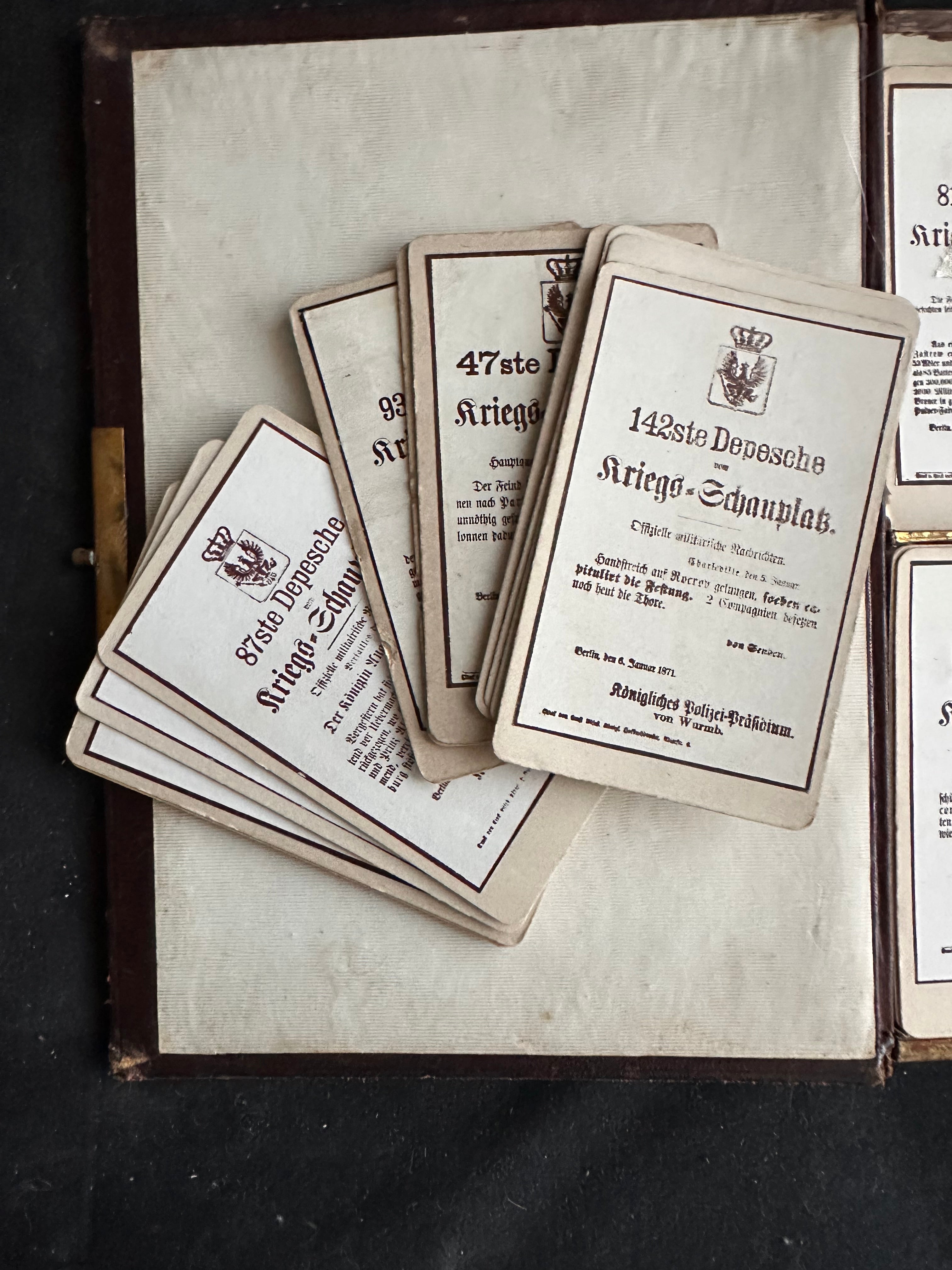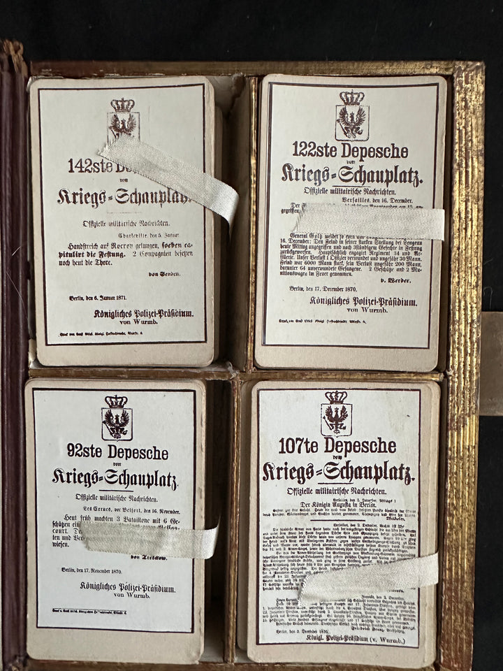 Inside, the case contains multiple compartments holding printed Prussian despatch cards. These cards are printed with the Prussian eagle and crown at the top and titled with sequential numbers such as “92ste Depesche,” “107te Depesche,” “122ste Depesche,” and “142ste Depesche,” each labeled “vom Kriegs-Schauplatz.” The text references official military or police communications and is dated to late 1870 and early 1871, with locations including Berlin and references to the Königliches Polizei-Präsidium. The cards are held in place by original paper or fabric retaining bands. Additional loose cards are present in the left interior section, indicating this was an actively used or assembled set rather than a purely decorative piece.