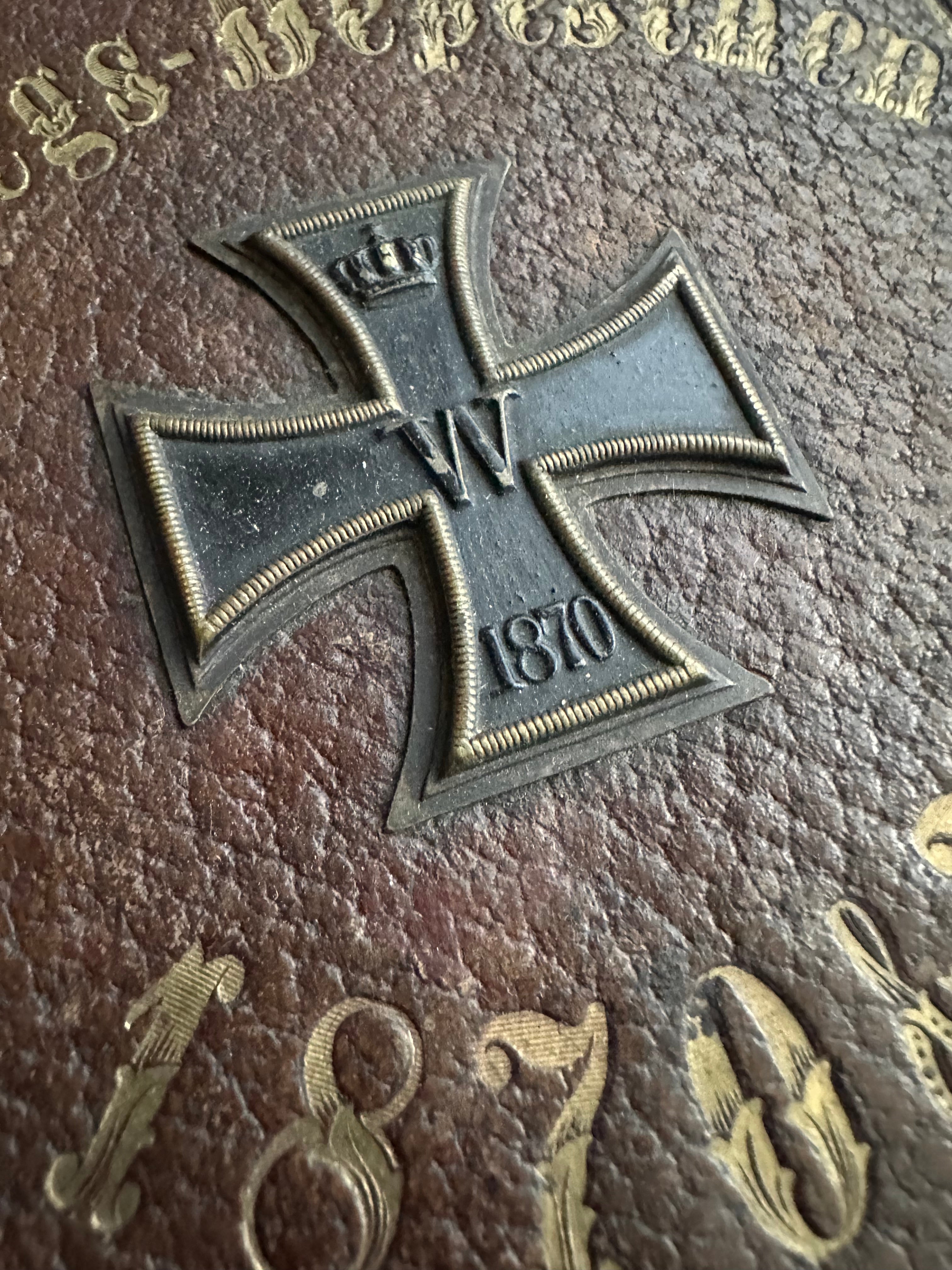 The case is constructed of stiffened board covered in brown pebbled leather, with a hinged spine and a metal clasp closure on the right edge. The front cover is decorated with gilt tooling framing the title and a mounted blackened Iron Cross with crown, “W,” and “1870” date, applied directly to the cover surface. The leather shows heavy but even period wear, surface scuffing, edge losses, and softened corners, consistent with age and handling. The spine remains intact, and the clasp hardware is present.