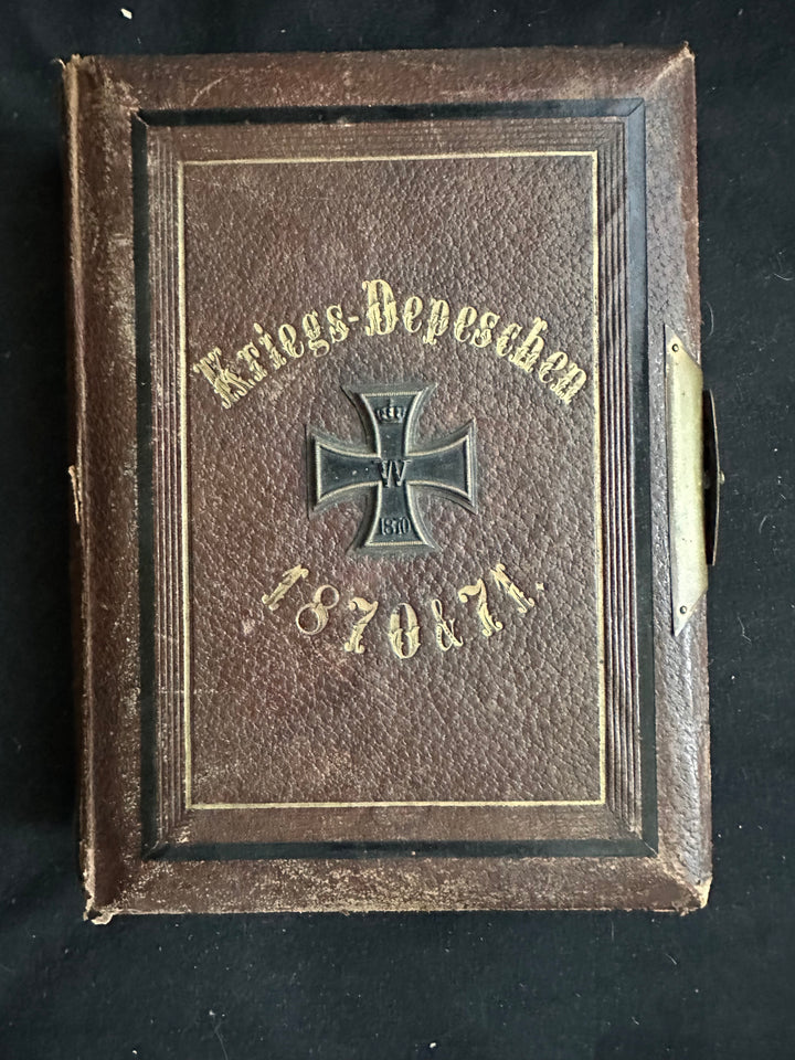 This object is identified as a Prussian Franco-Prussian War period despatch or souvenir case containing printed “Kriegs-Depesche vom Kriegs-Schauplatz” cards dating to the 1870–1871 campaign. The leather-covered case bears a centrally mounted Iron Cross motif dated 1870 and gilt-stamped lettering referencing the war years 1870–71, clearly situating it within the Franco-Prussian War period rather than the First World War.